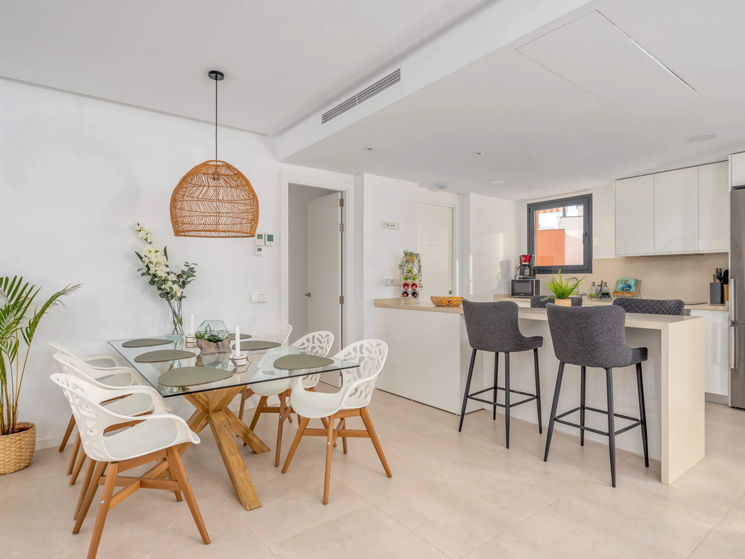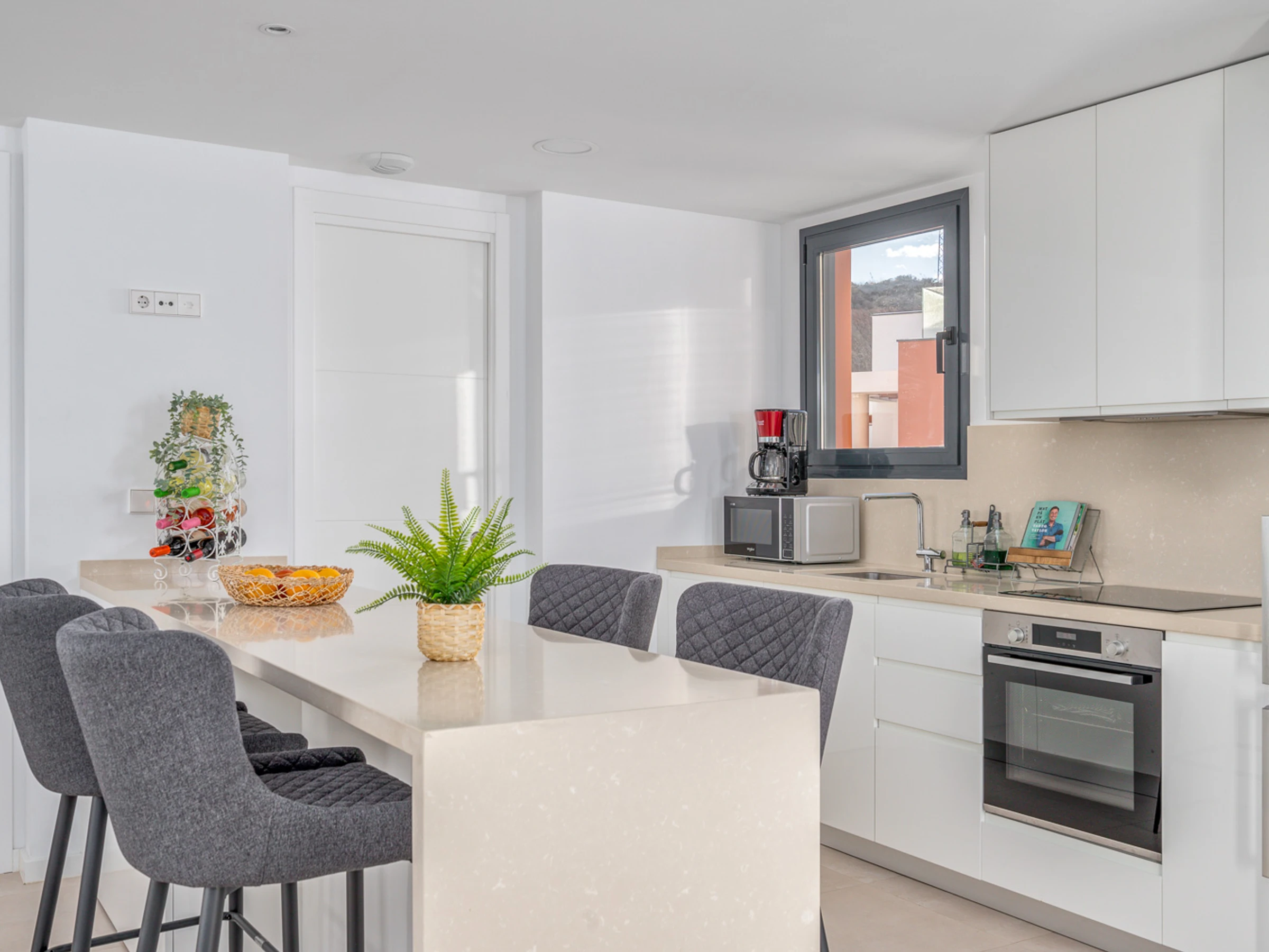 When you step into the apartment, you are greeted by a bright and open floor plan with the fully equipped kitchen on the right. Here you have a coffee maker, kettle, large fridge and freezer, dishwasher and everything you need to cook during your holiday.Here you also have a breakfast bar with 4 high chairs.