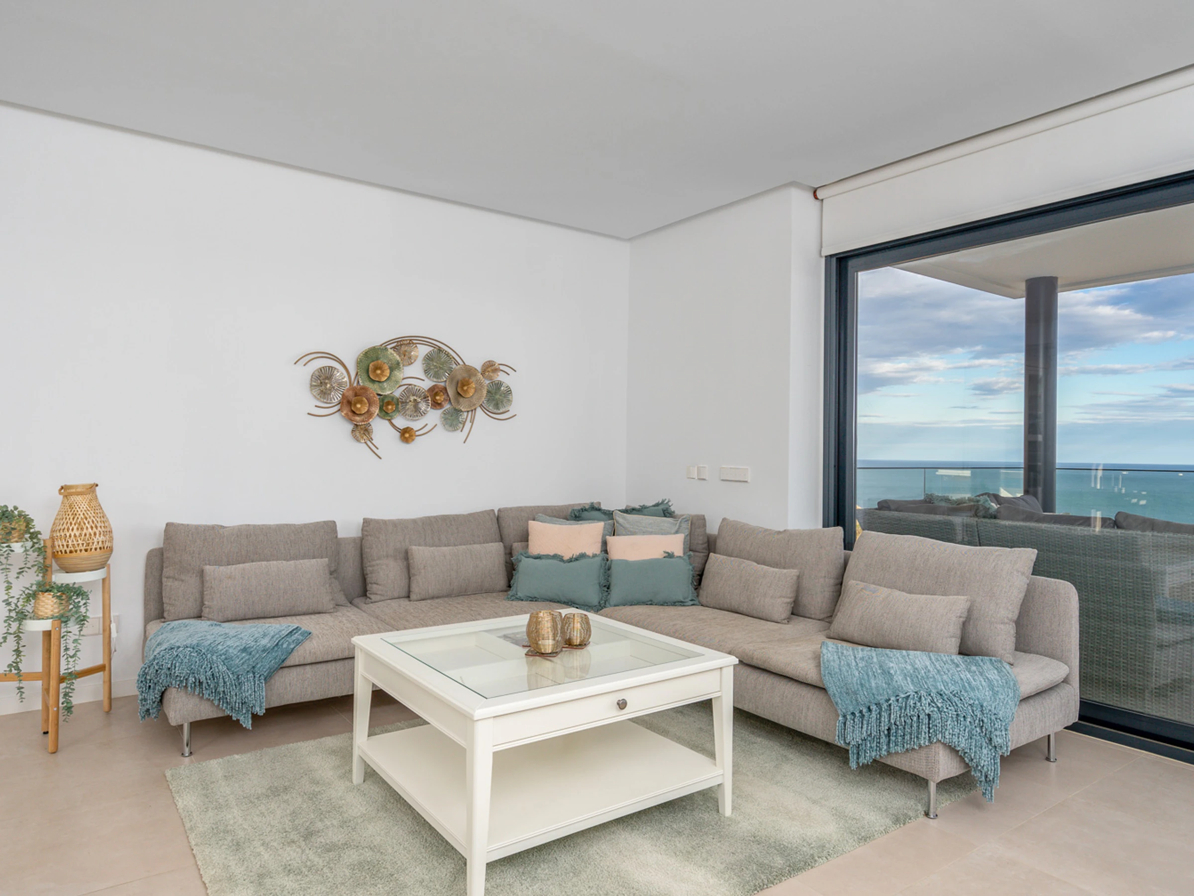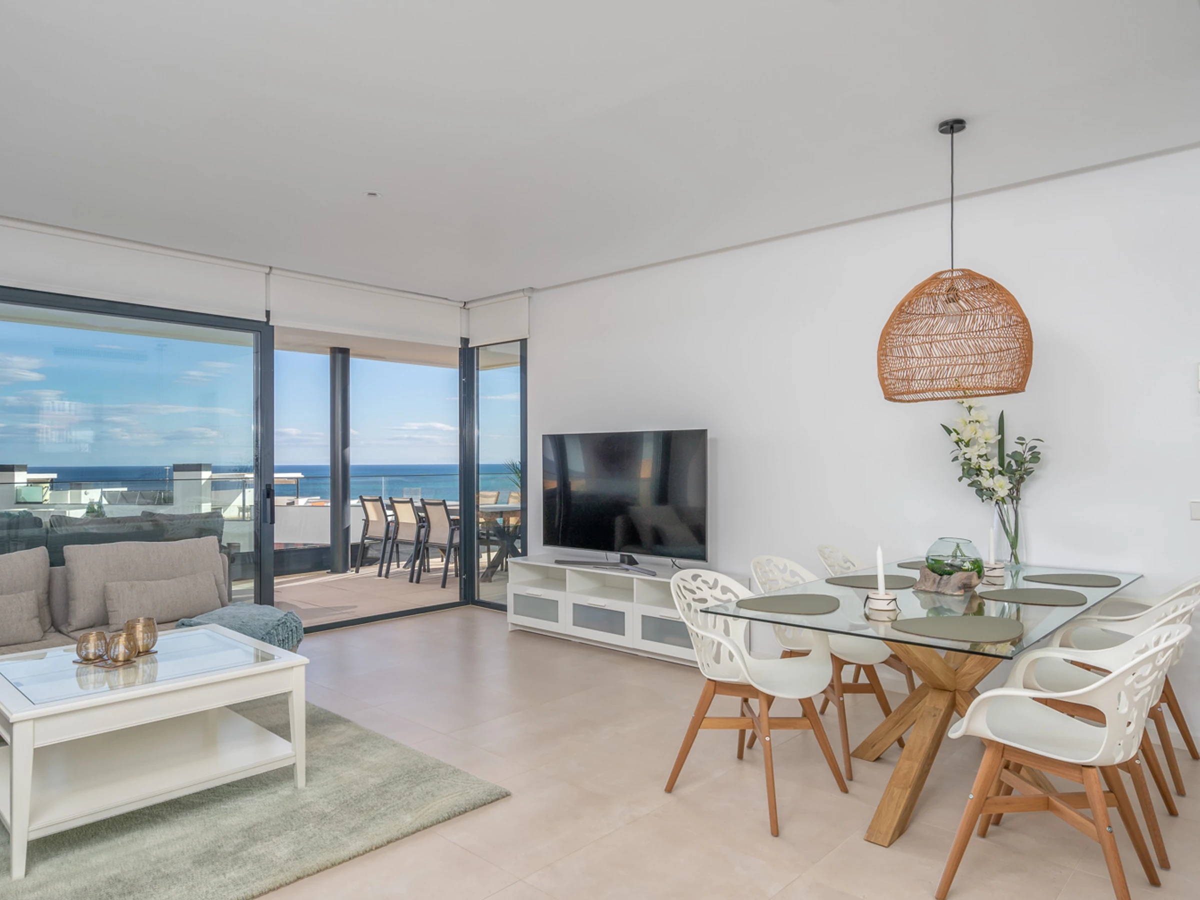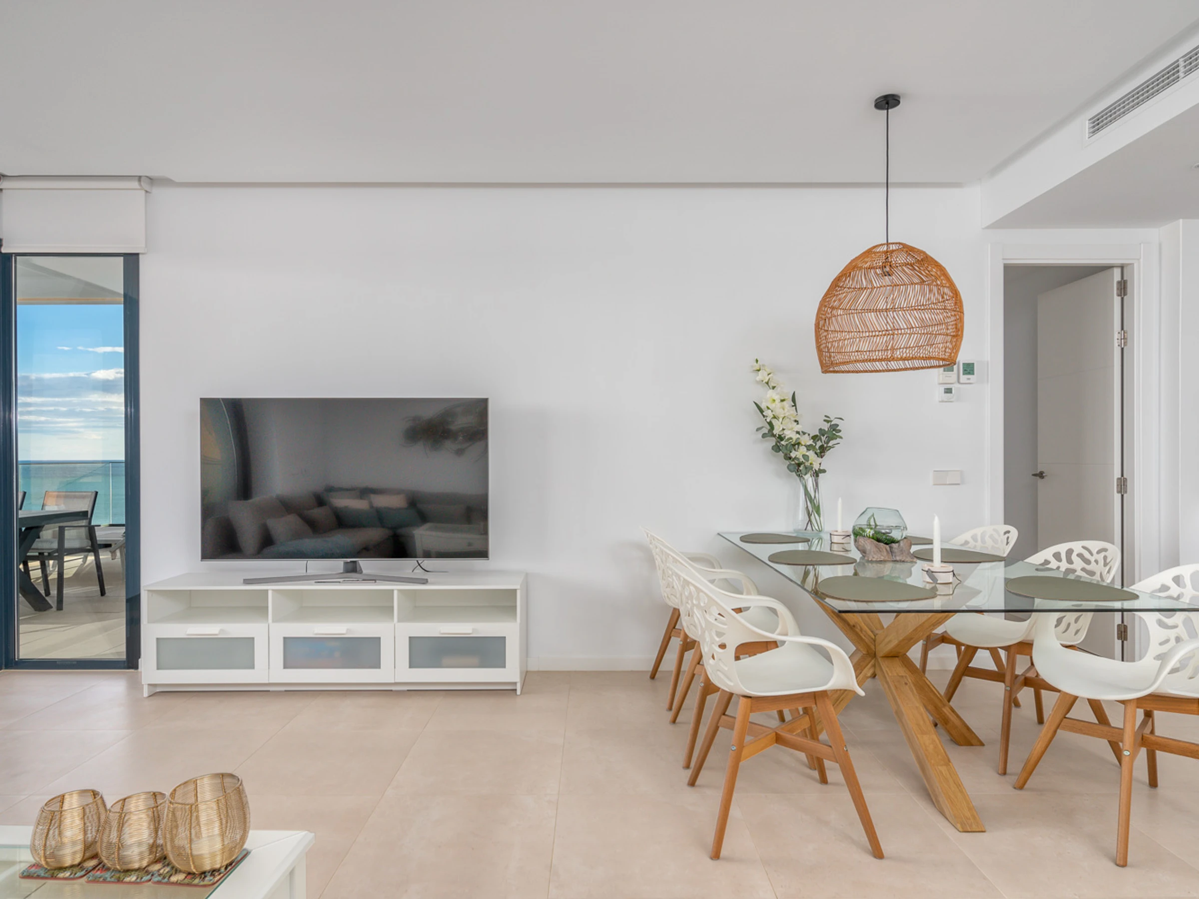 Further into the apartment you have the living room with a fantastic sea view, dining table with 6 chairs, a spacious corner sofa in front of the large Smart-Tvn.