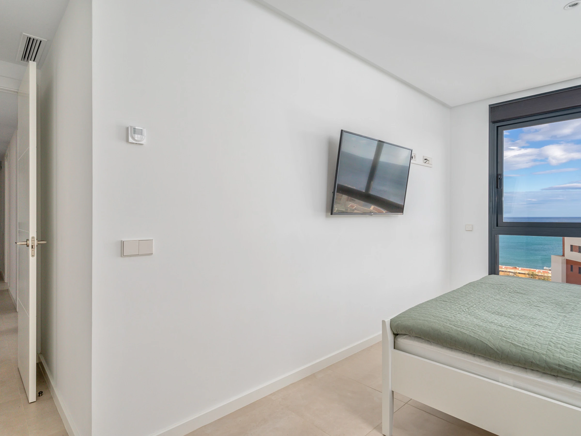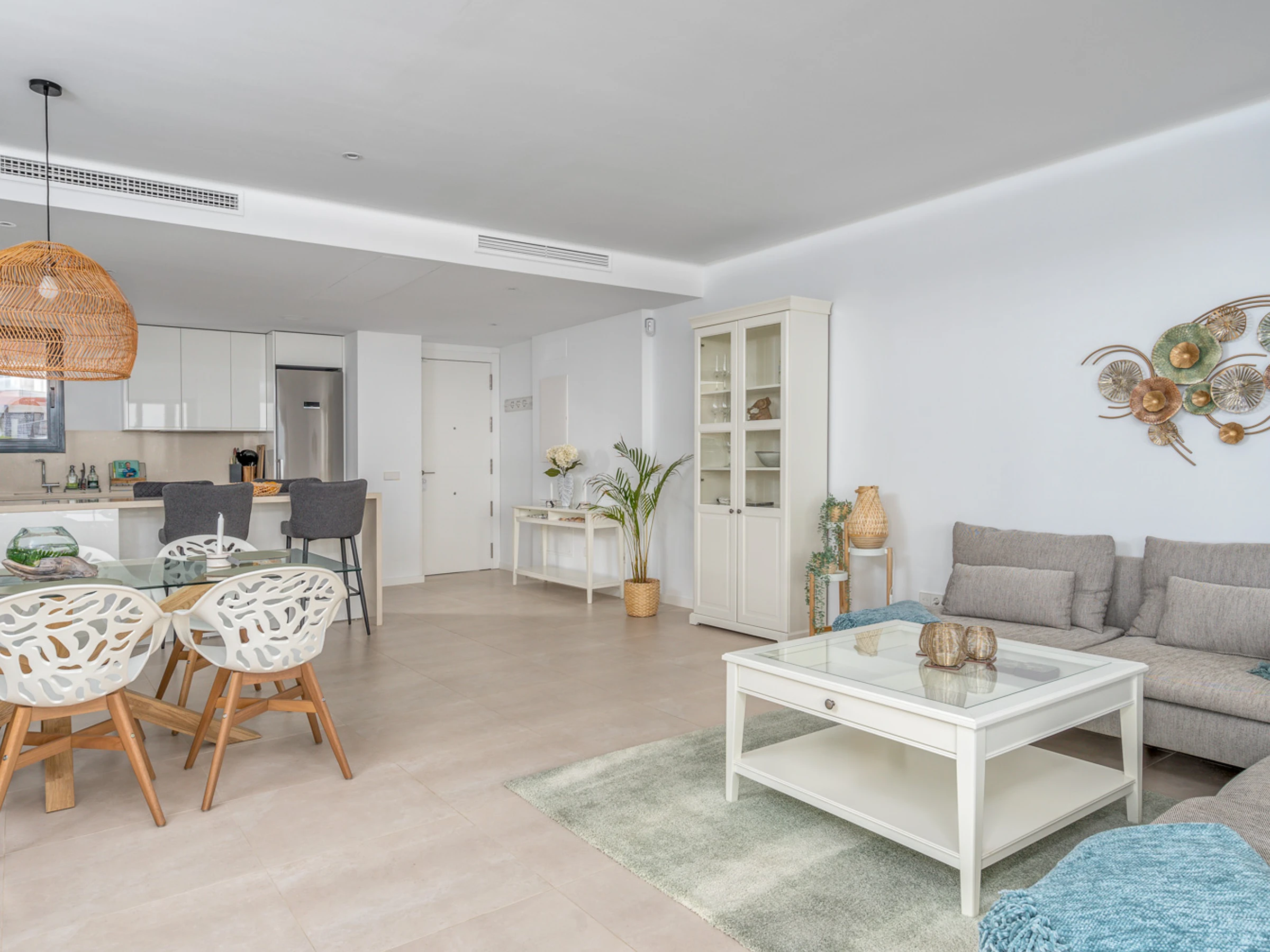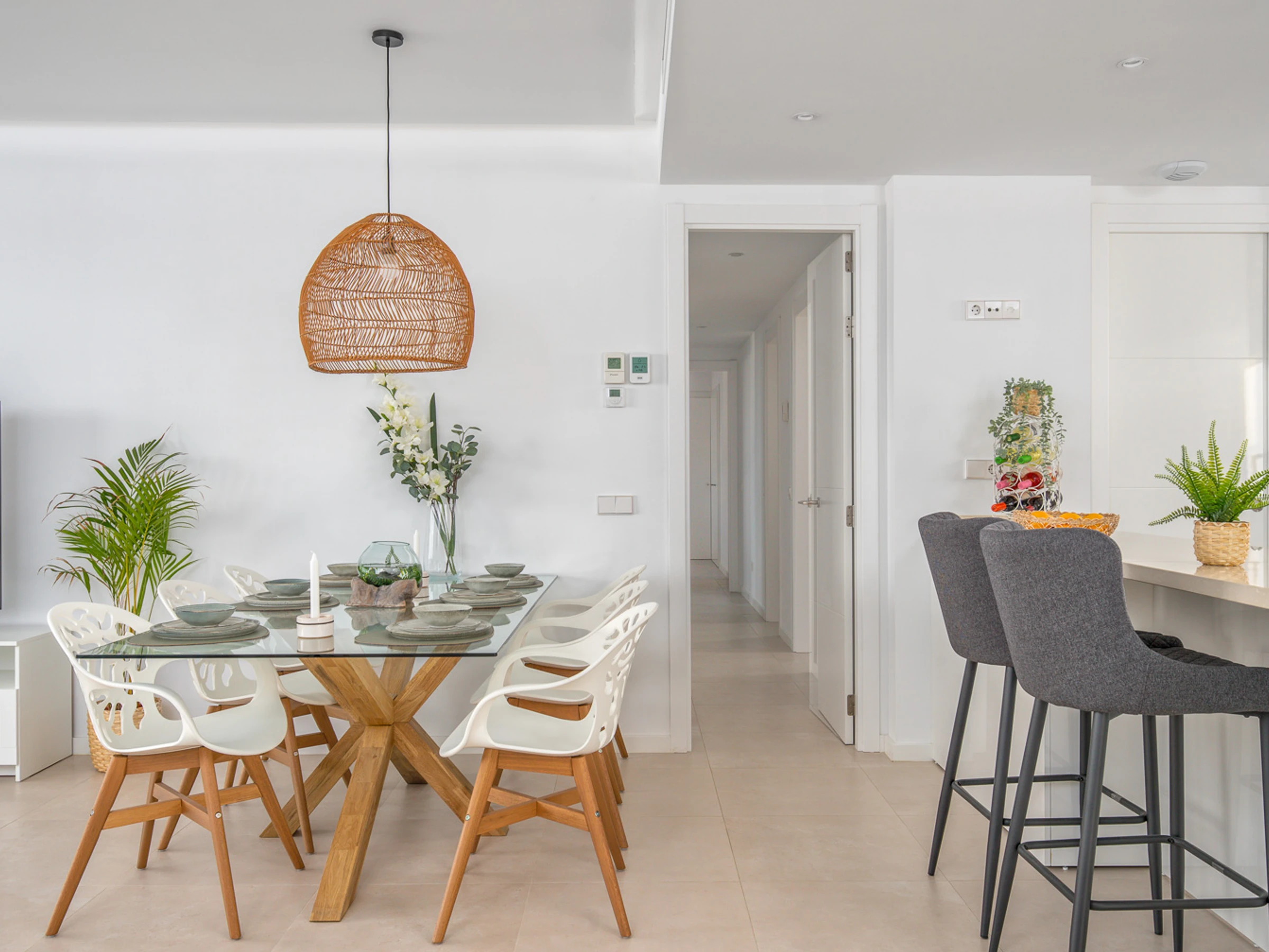 Further into the apartment you have the living room with a fantastic sea view, dining table with 6 chairs, a spacious corner sofa in front of the large Smart-Tvn.