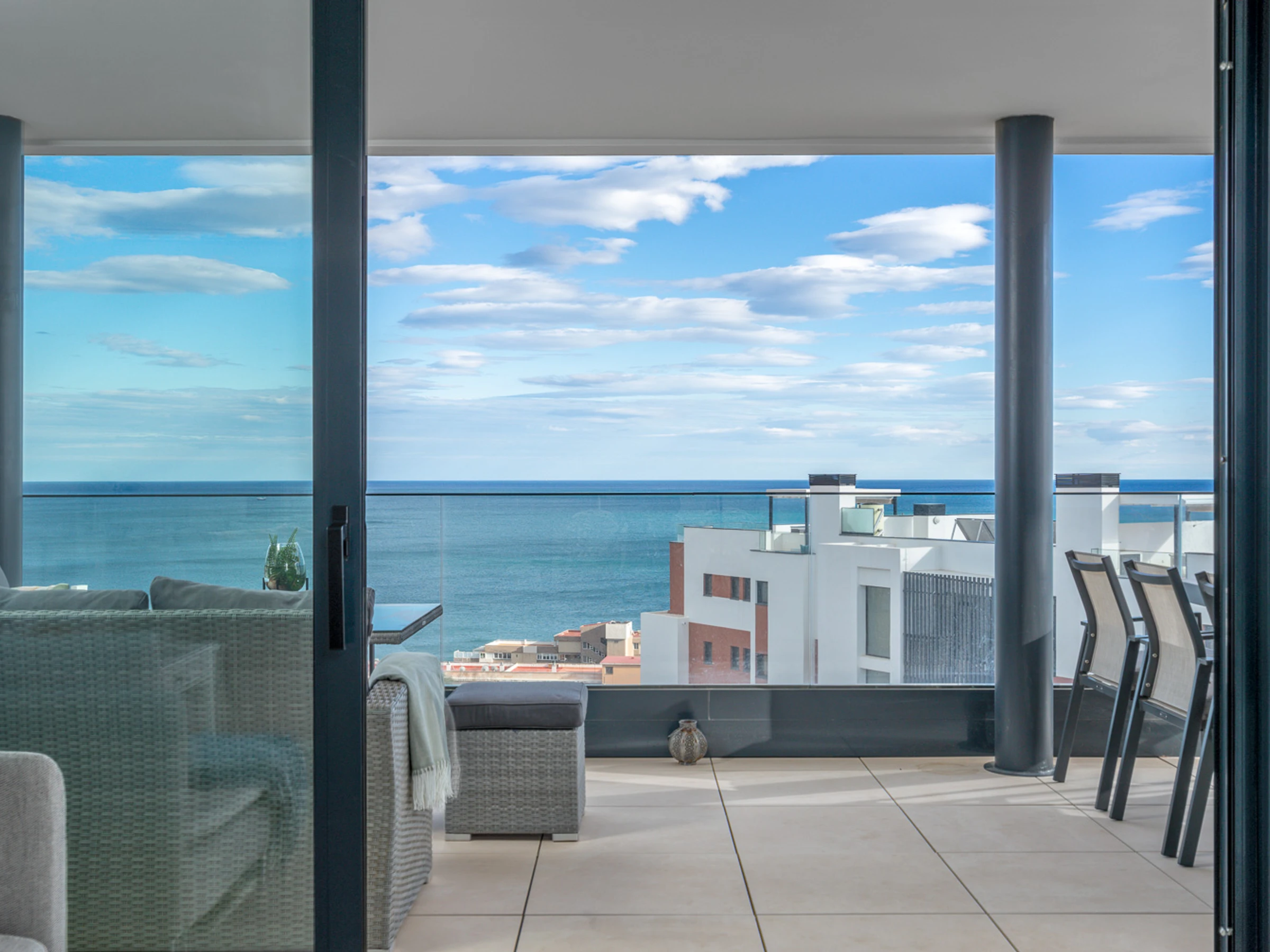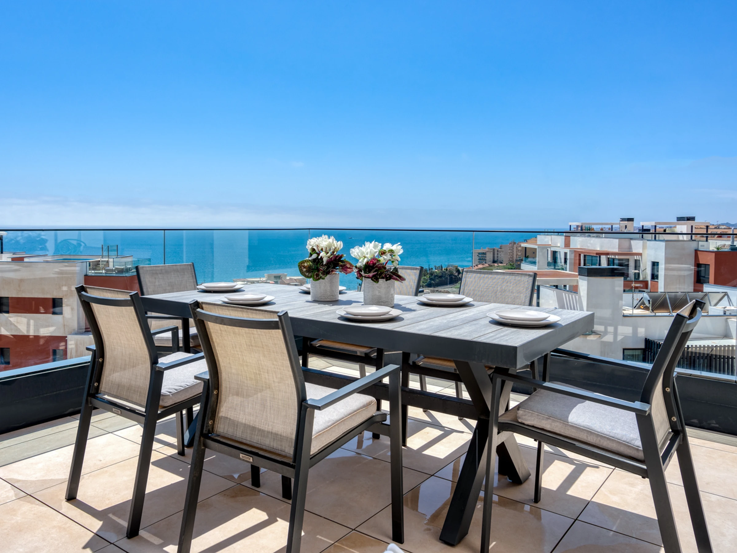 From the sunny terrace you have a beautiful view of the Mediterranean that you can enjoy in the comfortable lounge group, the sun loungers or during breakfast at the dining group.