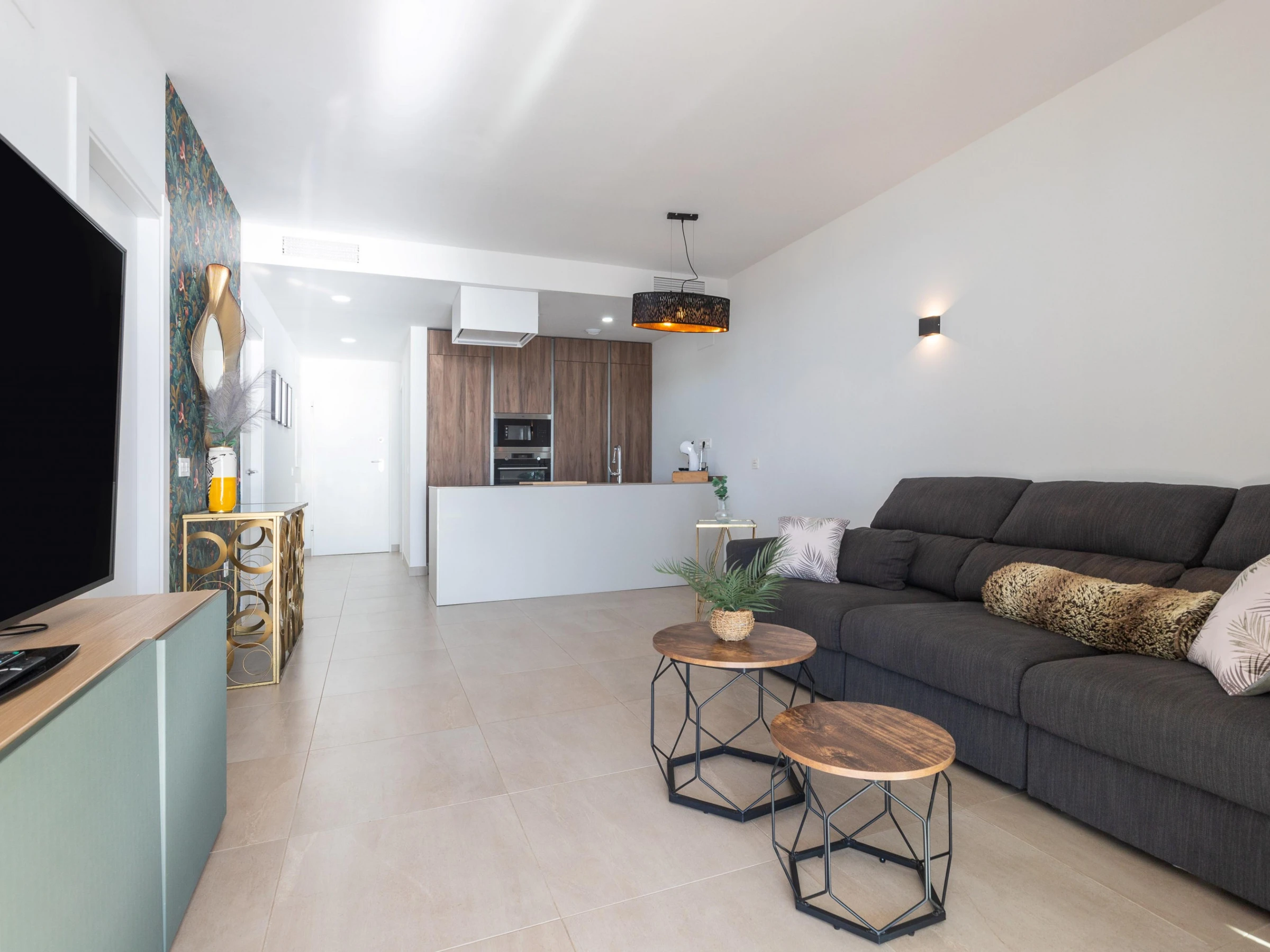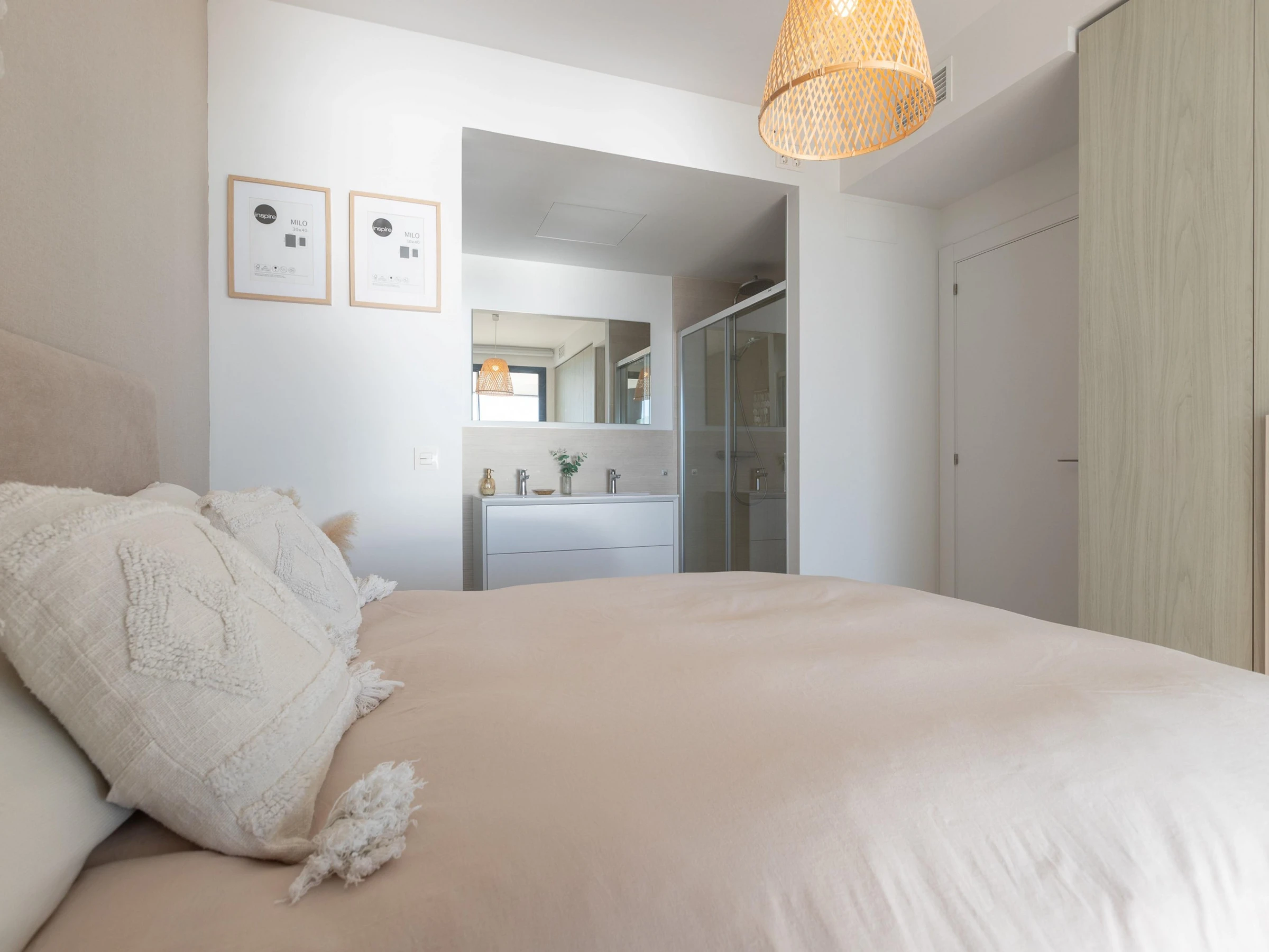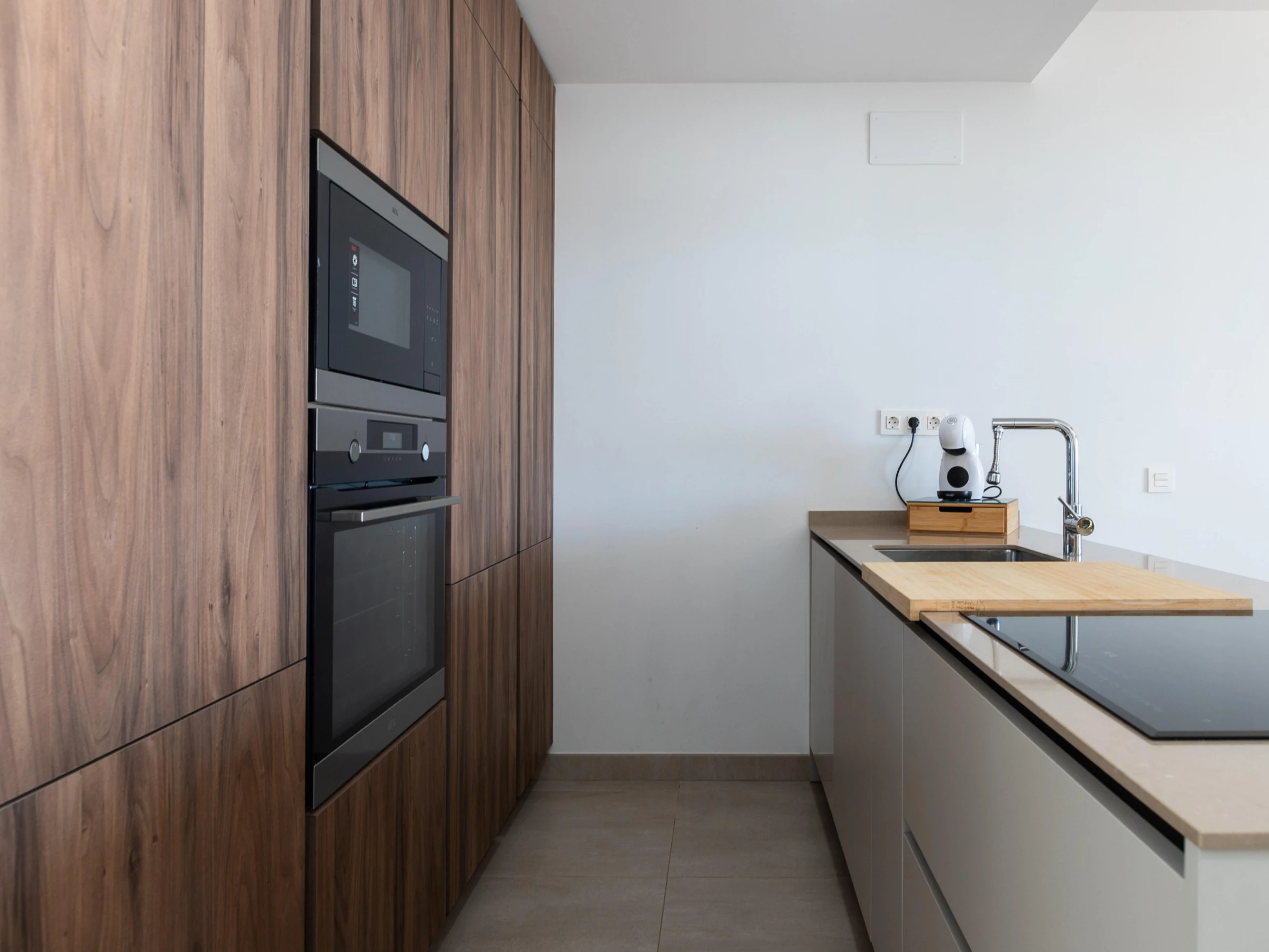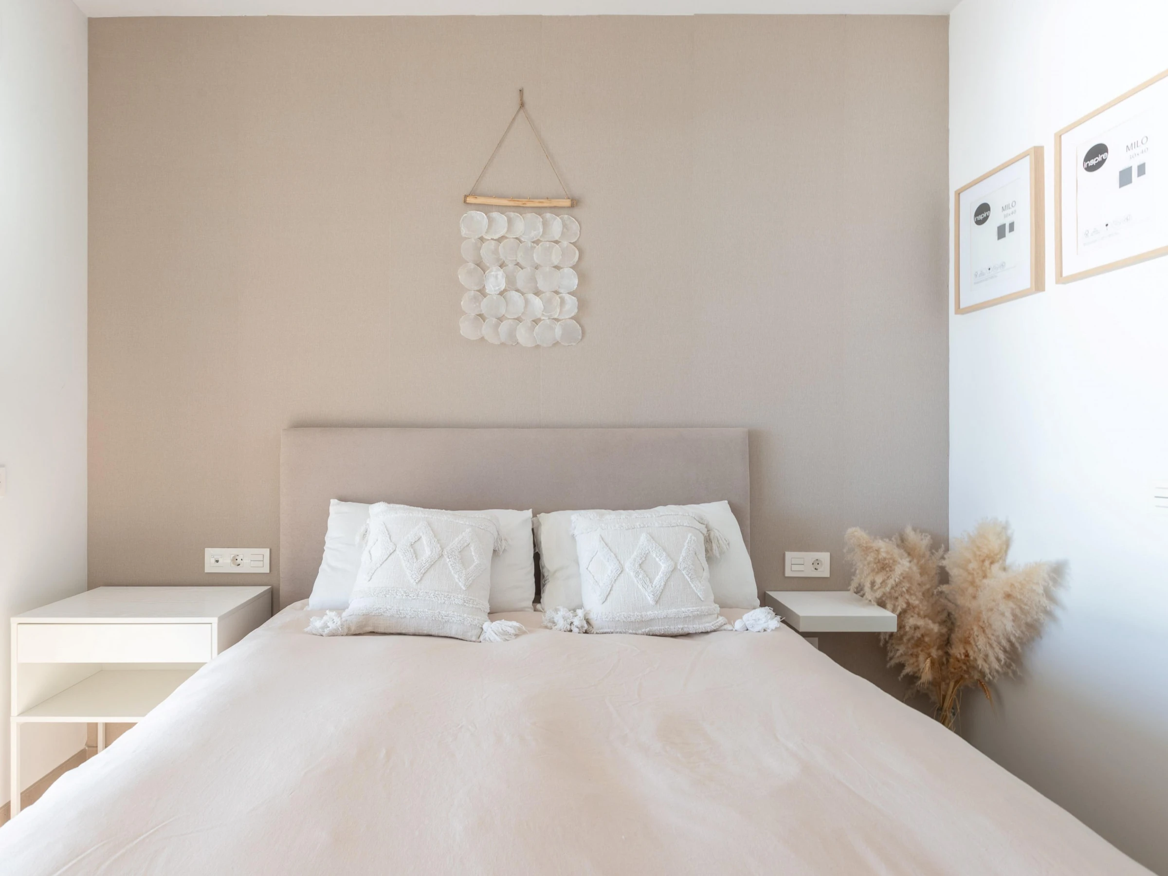 The flat is located on the ground floor of the building and has an elevated position to enjoy the sea views. Outside, the private veranda is perfect for relaxing and enjoying with your companions. The interior is open and functional, with an integrated space combining the kitchen and living room that is equipped with Smart TV and centralised air conditioning. The sofa is also a sofa-bed where one of the guests can rest. The kitchen is induction and has everything you need to prepare your favourite recipes. There is also a washing machine, tumble dryer, iron and ironing board. The sleeping area consists of two bedrooms. The master bedroom has a double bed and an elegant en-suite bathroom with shower. The second bedroom has two single beds. In addition, there is a second bathroom with shower at the entrance. For extra comfort if you are travelling with your baby we can provide a cot and high chair.