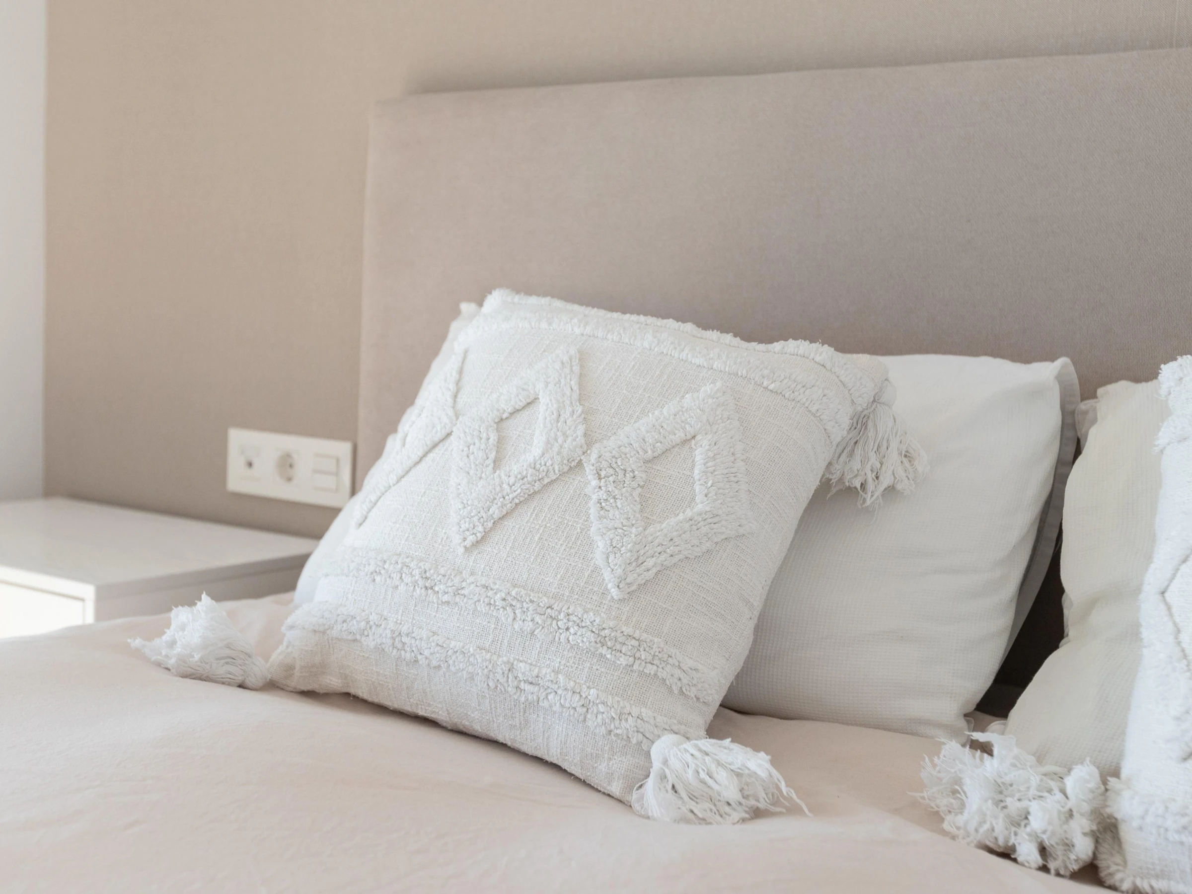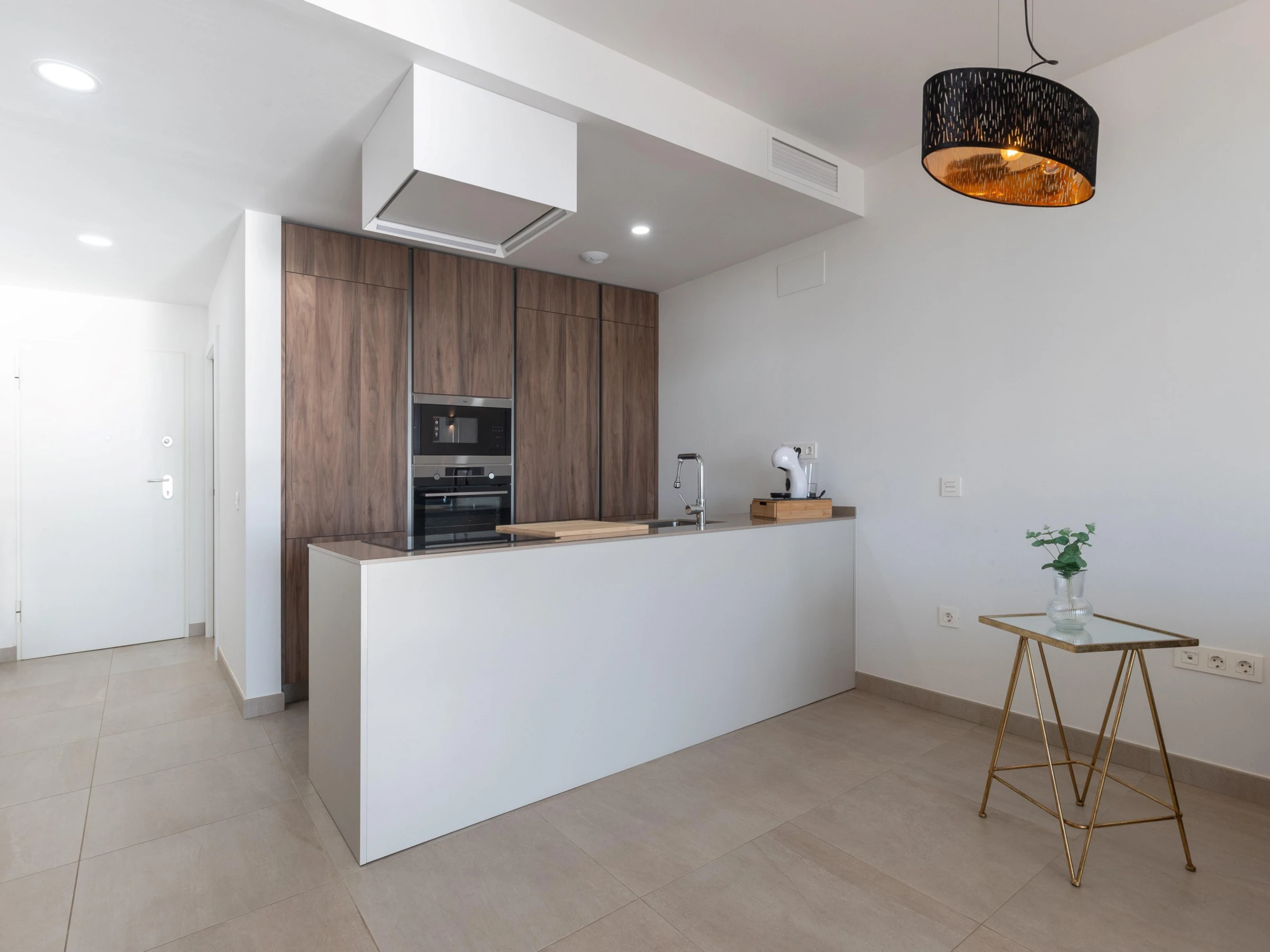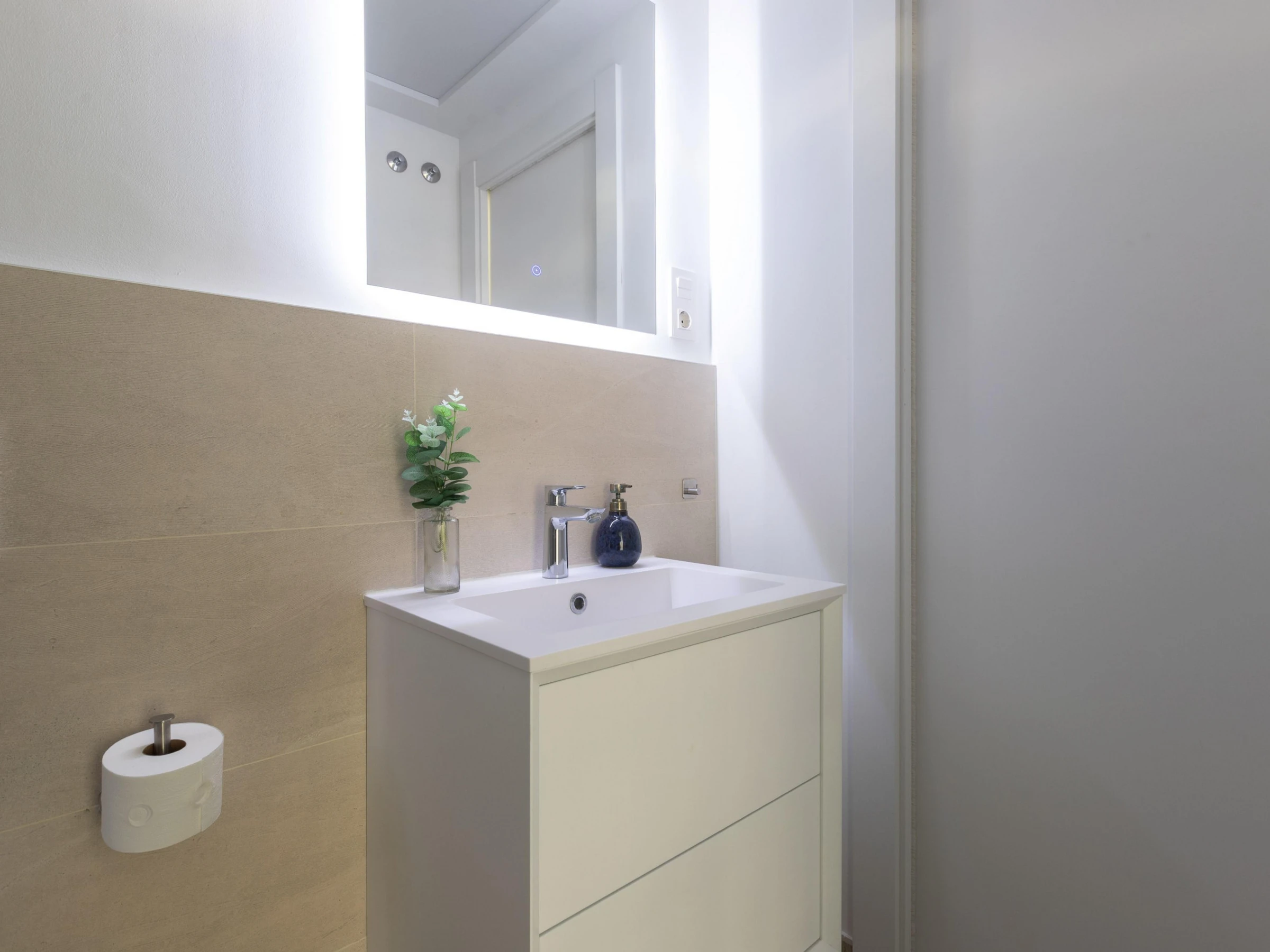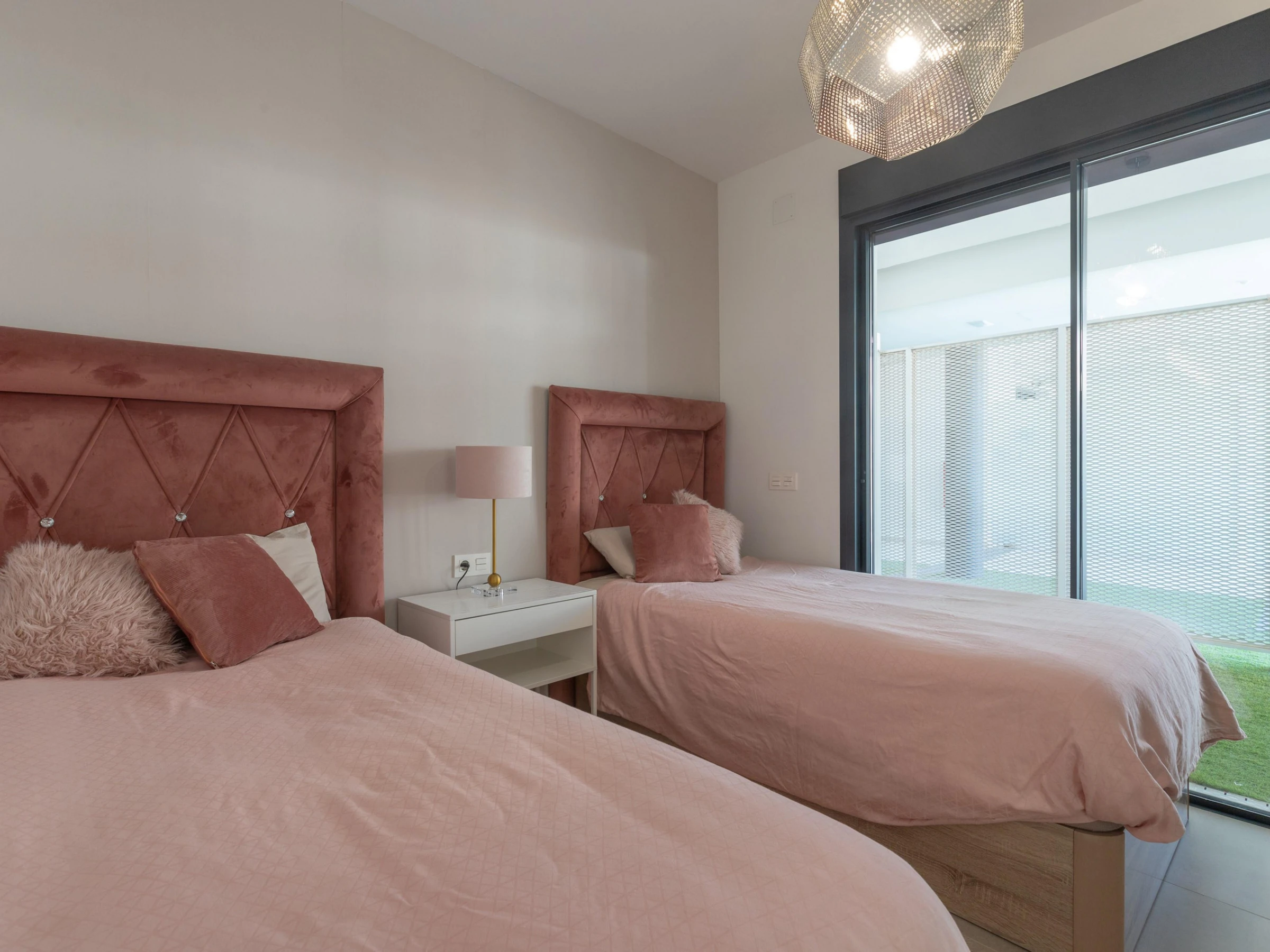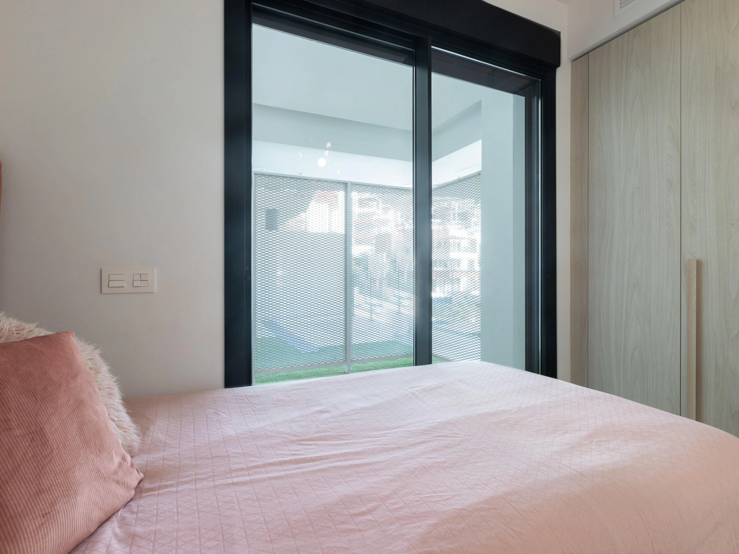 The flat is located on the ground floor of the building and has an elevated position to enjoy the sea views. Outside, the private veranda is perfect for relaxing and enjoying with your companions. The interior is open and functional, with an integrated space combining the kitchen and living room that is equipped with Smart TV and centralised air conditioning. The sofa is also a sofa-bed where one of the guests can rest. The kitchen is induction and has everything you need to prepare your favourite recipes. There is also a washing machine, tumble dryer, iron and ironing board. The sleeping area consists of two bedrooms. The master bedroom has a double bed and an elegant en-suite bathroom with shower. The second bedroom has two single beds. In addition, there is a second bathroom with shower at the entrance. For extra comfort if you are travelling with your baby we can provide a cot and high chair.