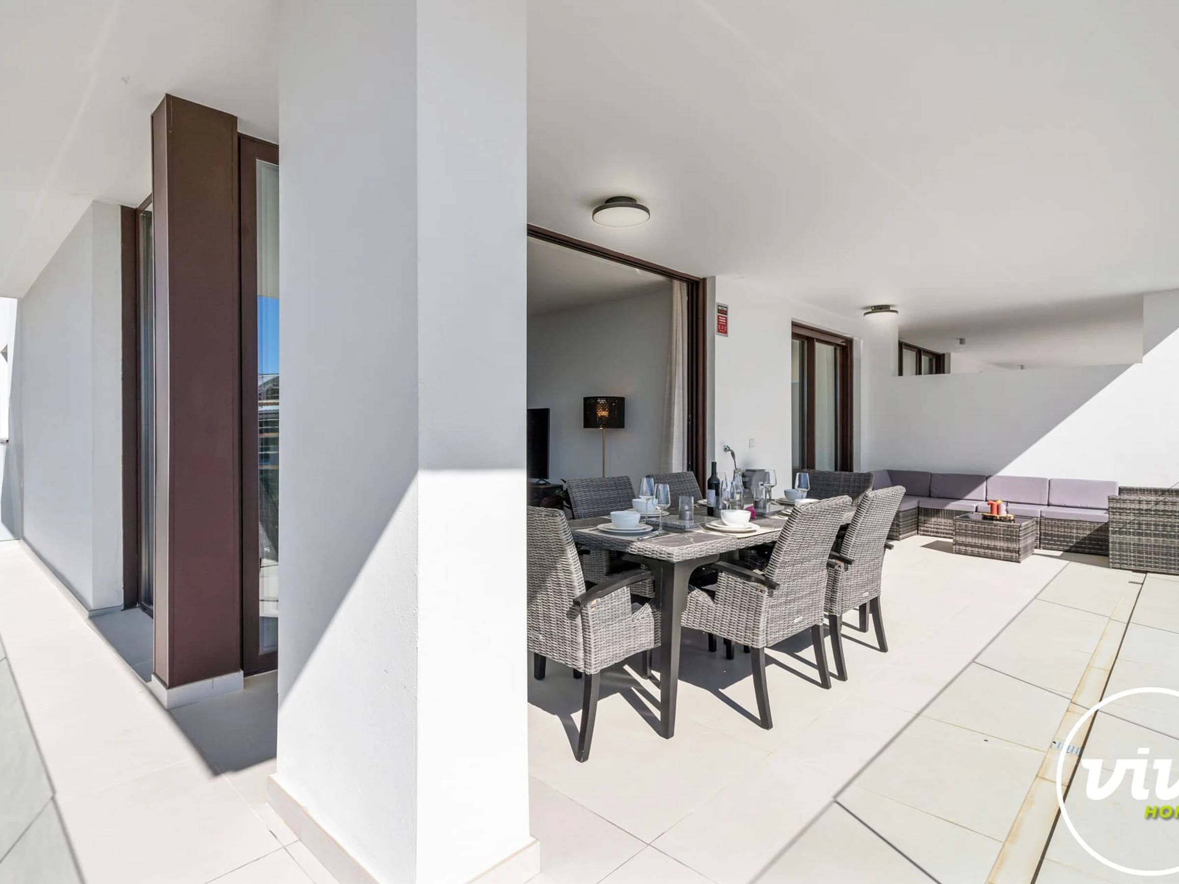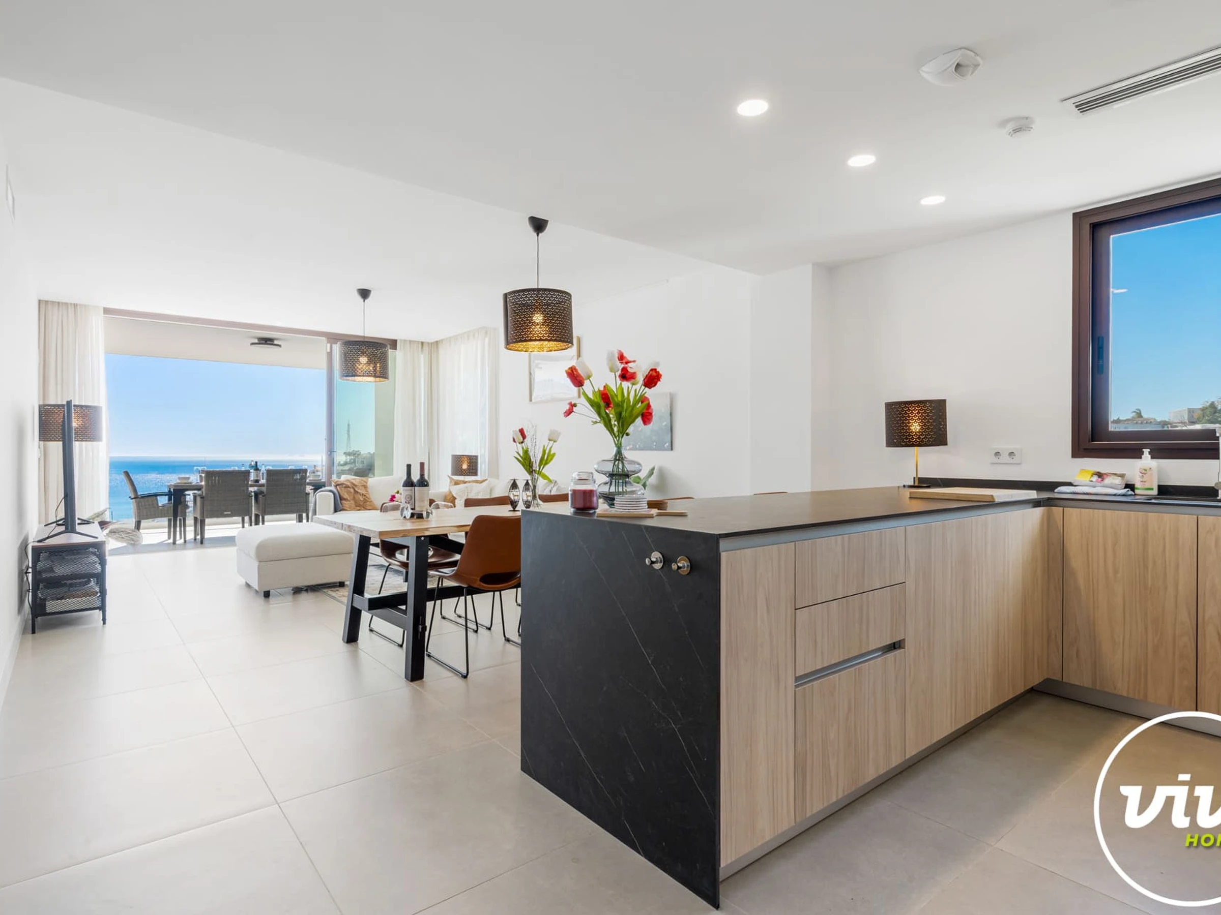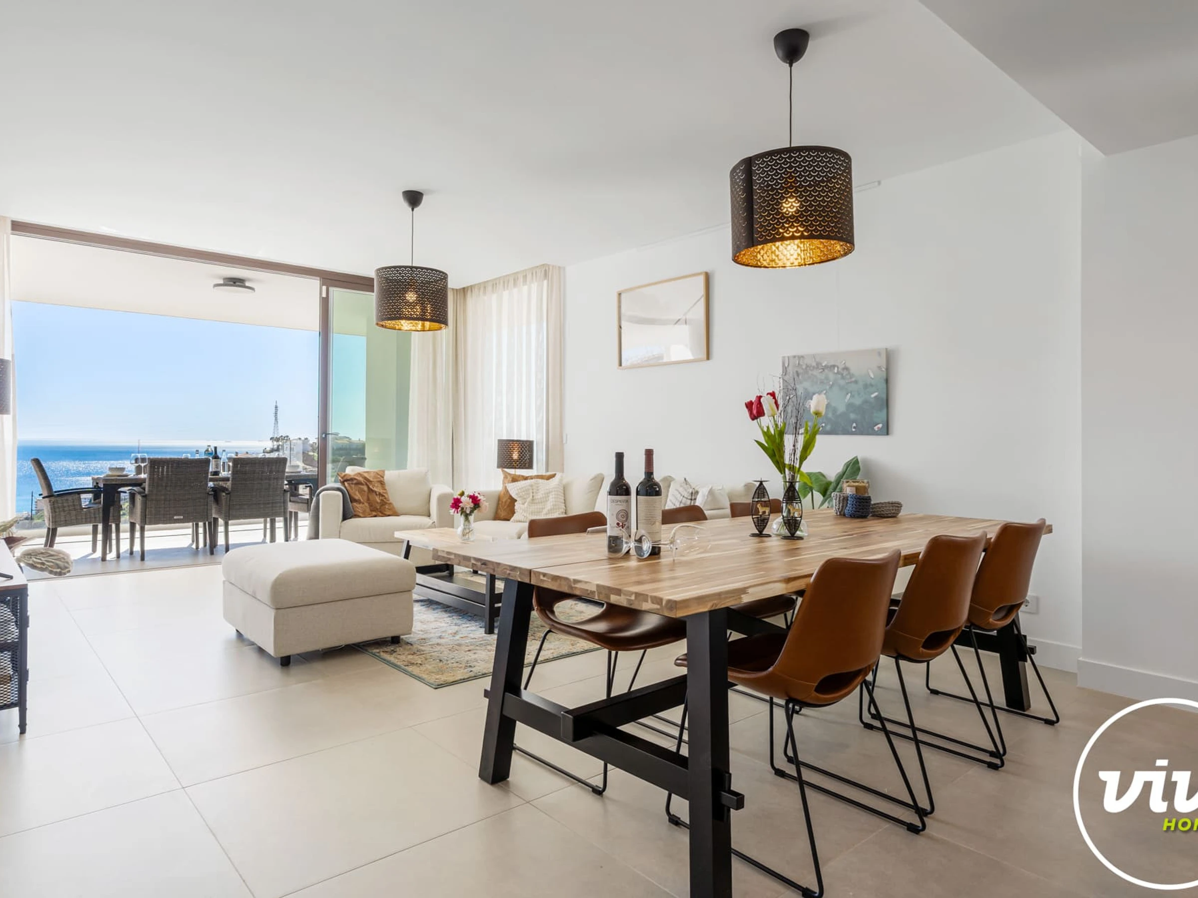 Regalo’s open-plan living space connects directly to the terrace, offering a pleasant indoor-outdoor flow. It is a comfortable setting for enjoying breakfast in the sun or relaxed evenings with family and friends.