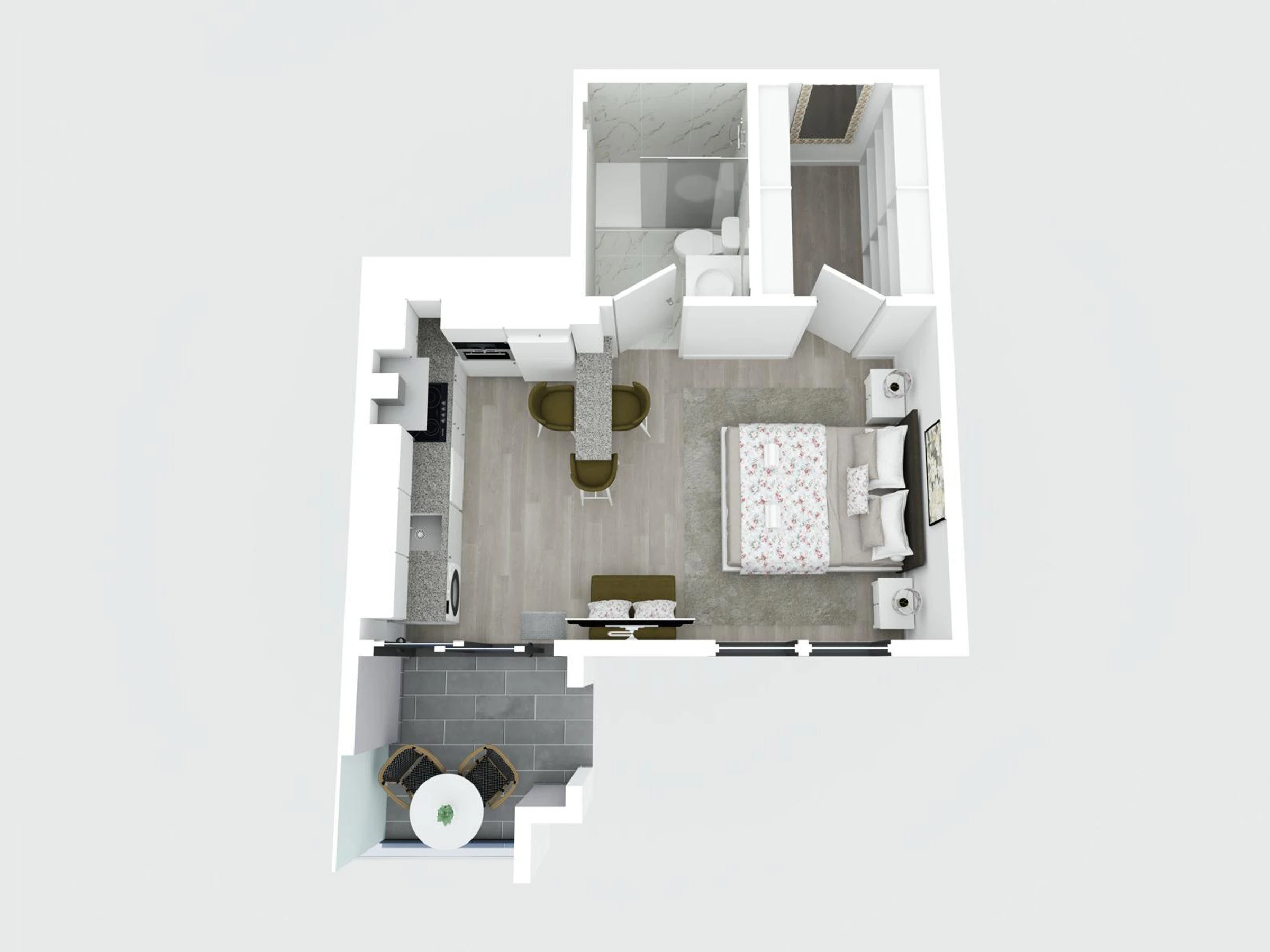 For moments of pause, the private balcony offers a charming space to enjoy the late afternoon, savour a coffee, read a book or simply contemplate the calm and welcoming atmosphere that surrounds the studio.