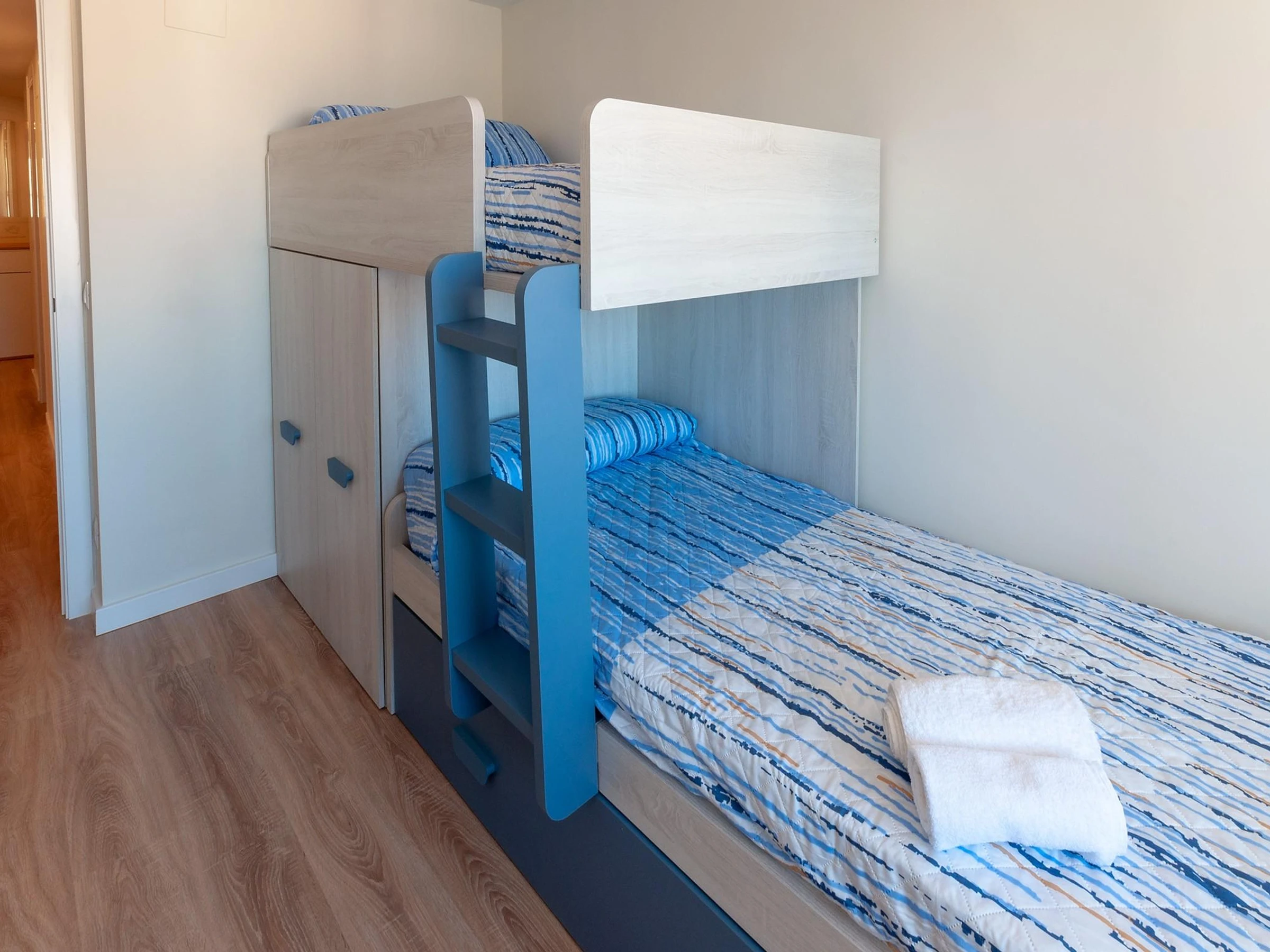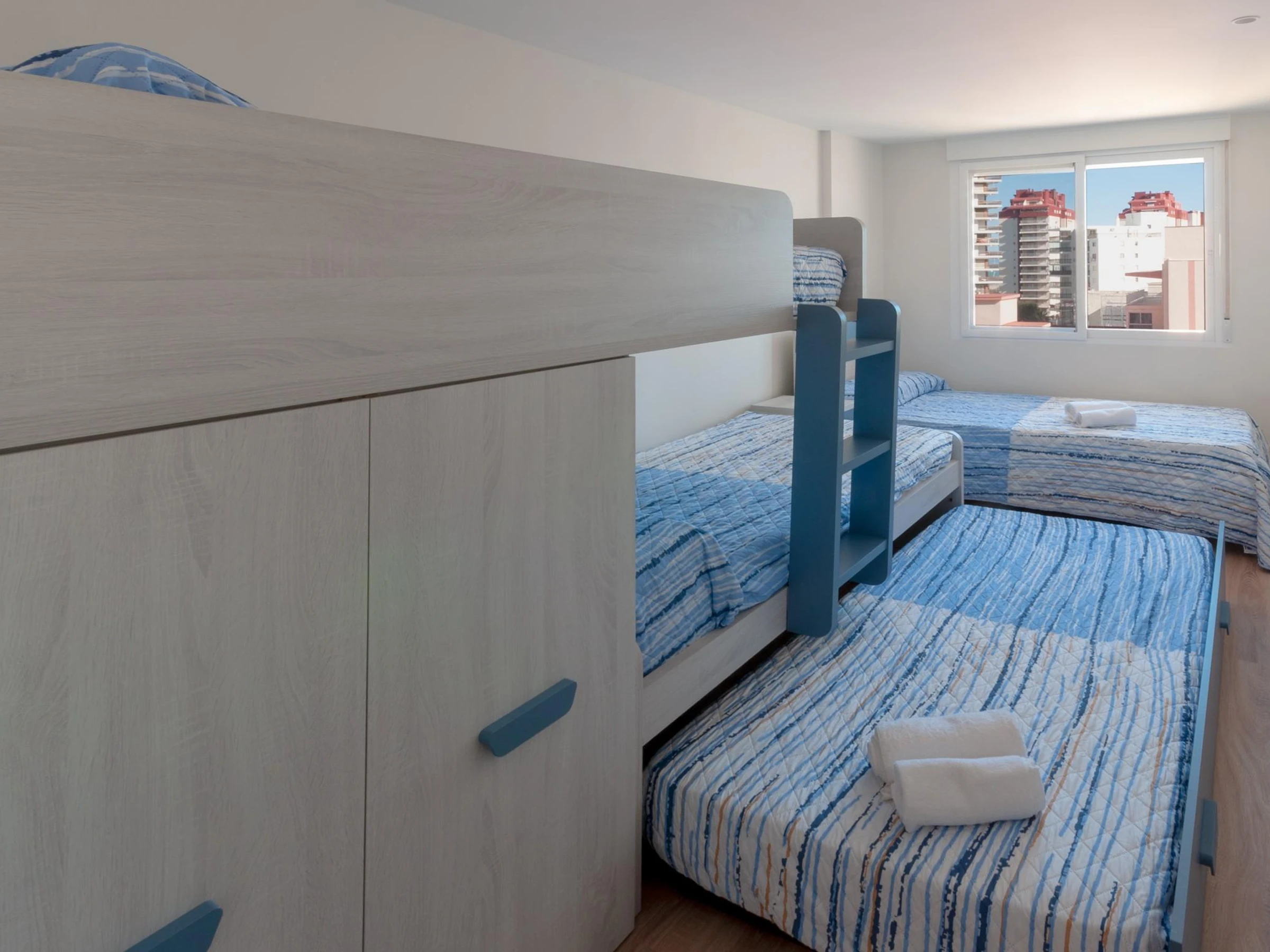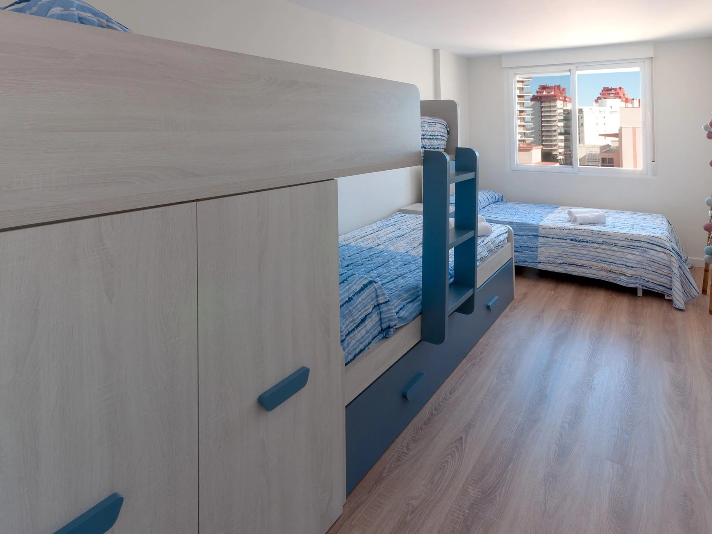 The interior of this eighth floor apartment with elevator gets, with its wooden flooring and its modern furnishing, a welcoming atmosphere for our guests to feel like if they were at home. The living-dining room is ideal to have lunch or dinner all together and then chat, while watching the TV. The kitchen is an independent room and it is equipped with induction cooktop, oven and other utensils, and it is where you can find the washing machine, the iron and the ironing board. This house also has two bathrooms with shower and three dormitories, all of them equipped with a wardrobe. One of them has a double bed, the second one has two individual beds and the last one just an individual bed and a bunk bed that, at the same time, it is a truckle bed, which is why this dormitory has a capacity for up 4 people. A cot and a high chair can also be provided. Regarding to the acclimatization, there is a ducted air-conditioner all over the house, as well as two radiators at your disposal.