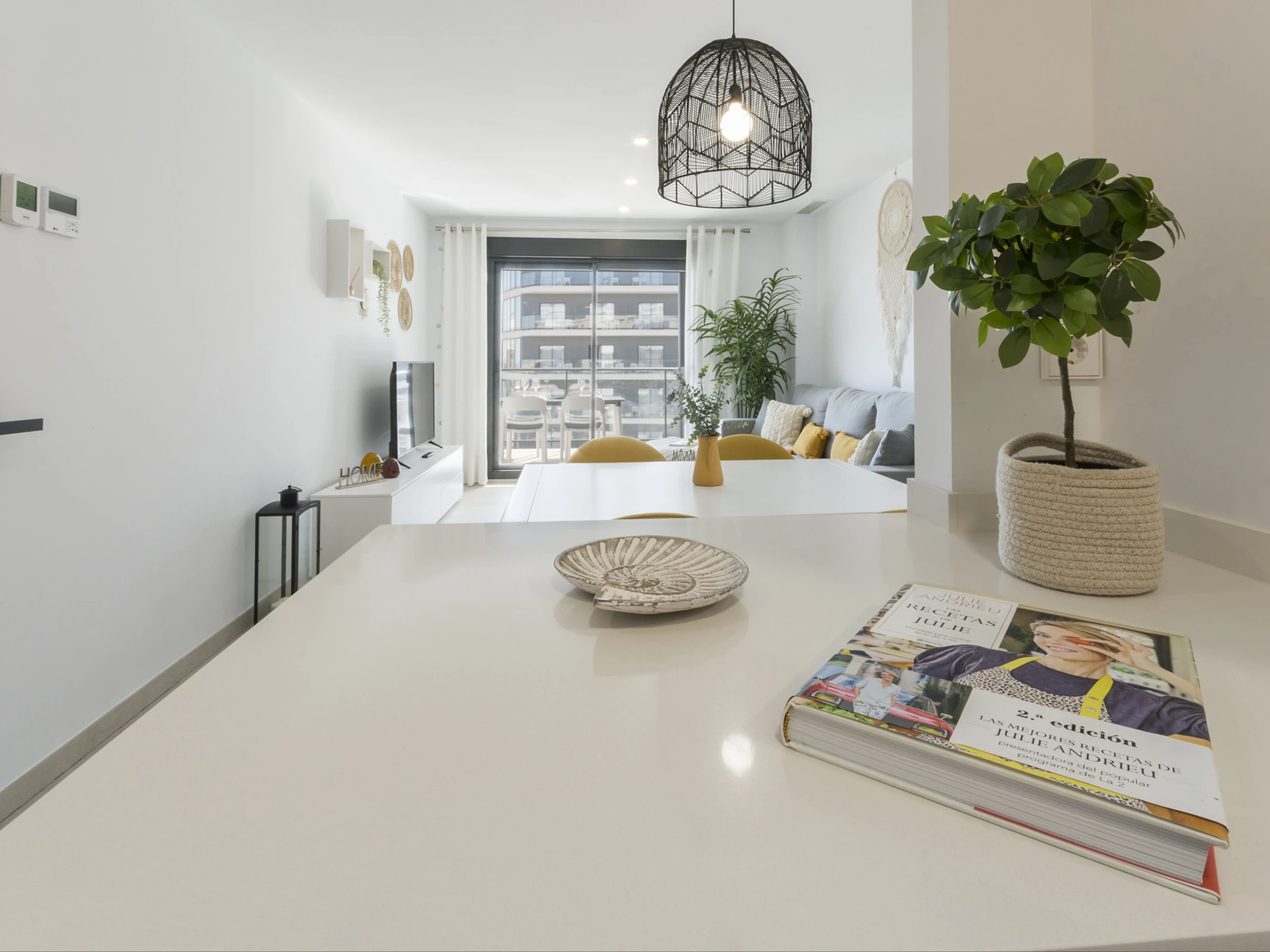 The open plan kitchen, of hotplate of glass ceramics, is equipped with refrigerator, microwave, oven, freezer, dishwasher, dishes/cutlery, kitchen utensils, coffee machine, toaster, kettle and juicer.