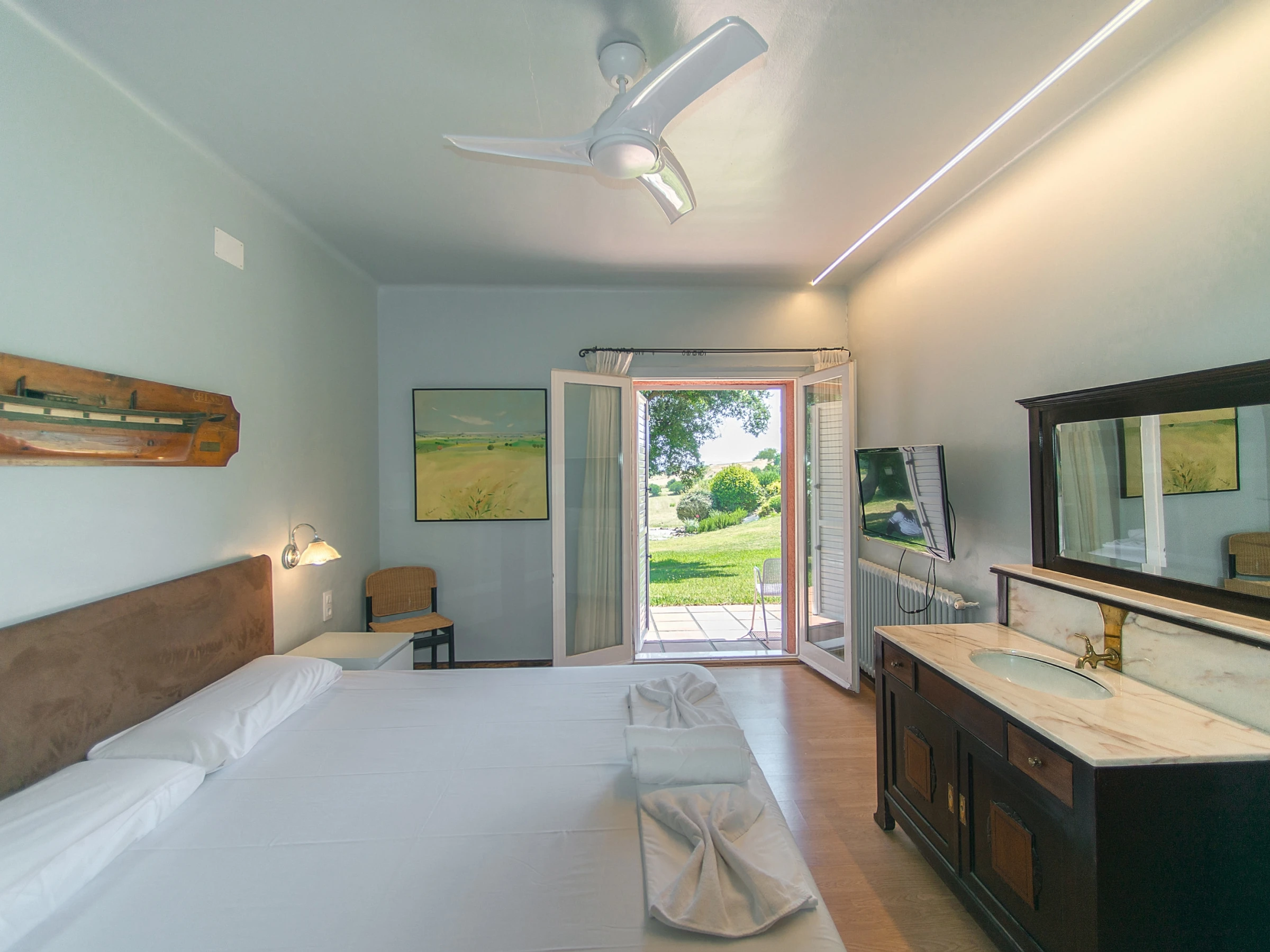 The house offers five cosy bedrooms, each of which promises a comfortable and peaceful sleep. Three of them are equipped with double beds and have direct access to the garden, allowing enjoyment of fresh air and nature from the first moments of waking up. Another bedroom is equipped with two single beds, ideal for children or friends, and the last bedroom has a single bed, creating a welcoming space for one person.