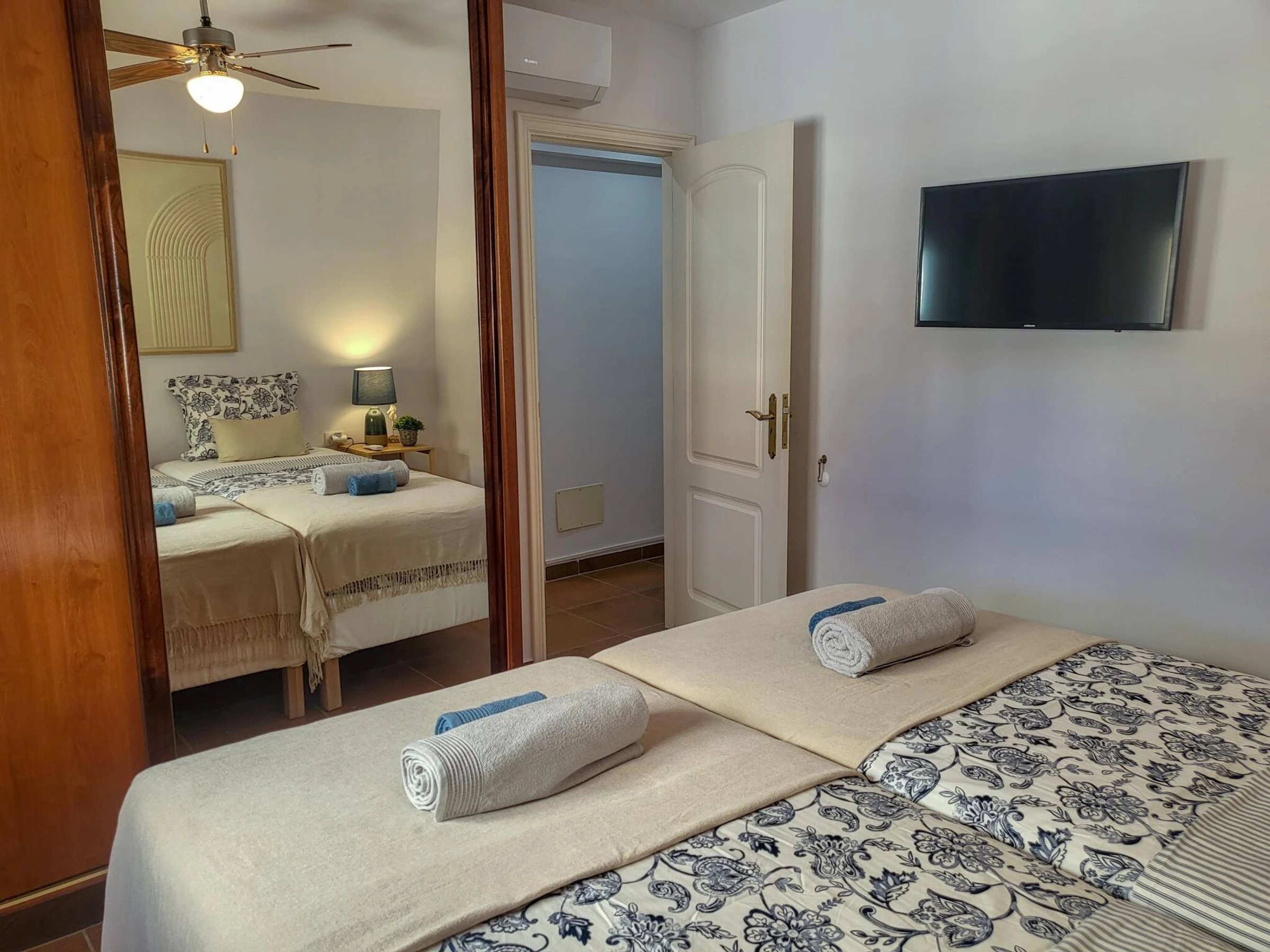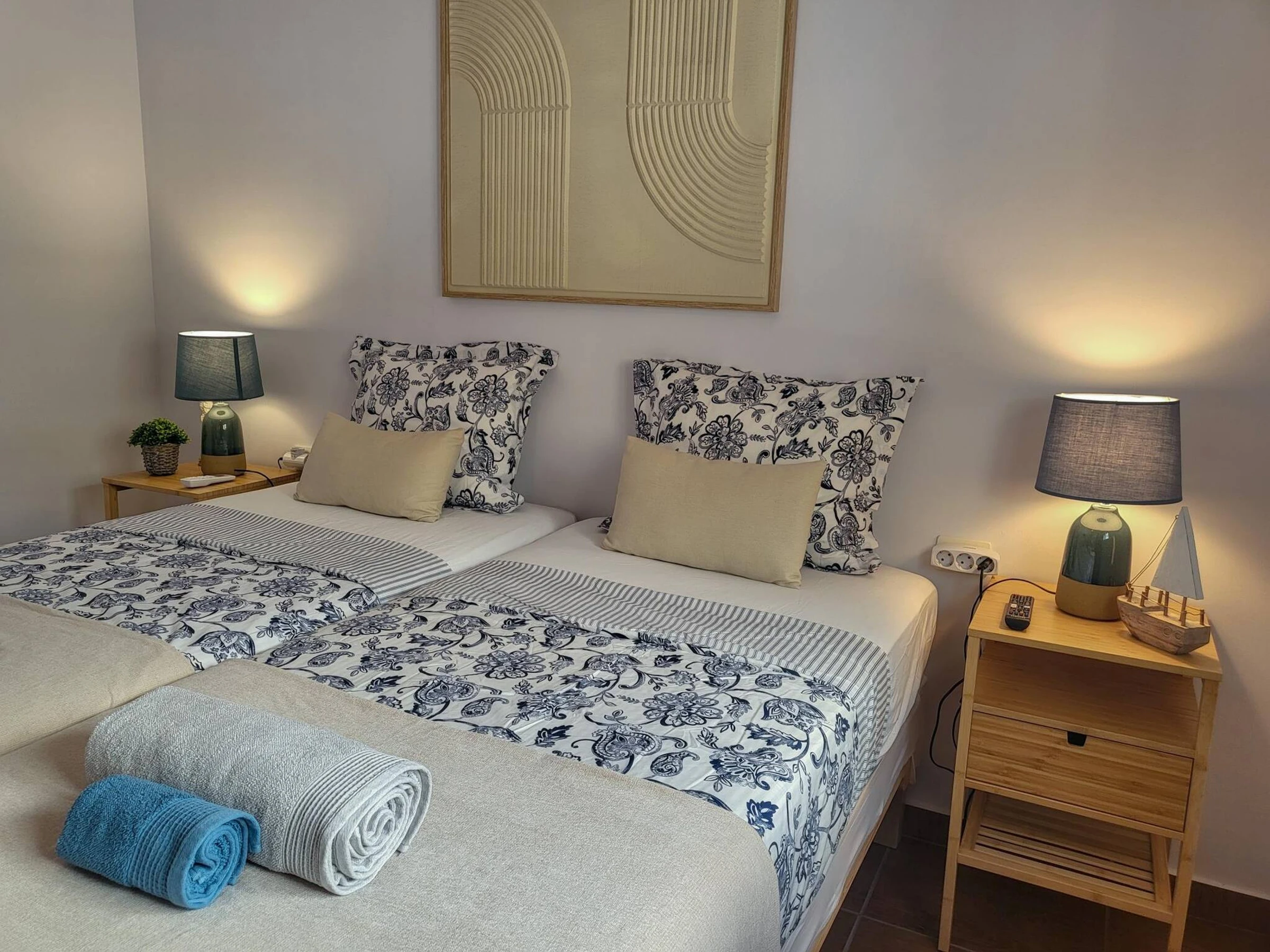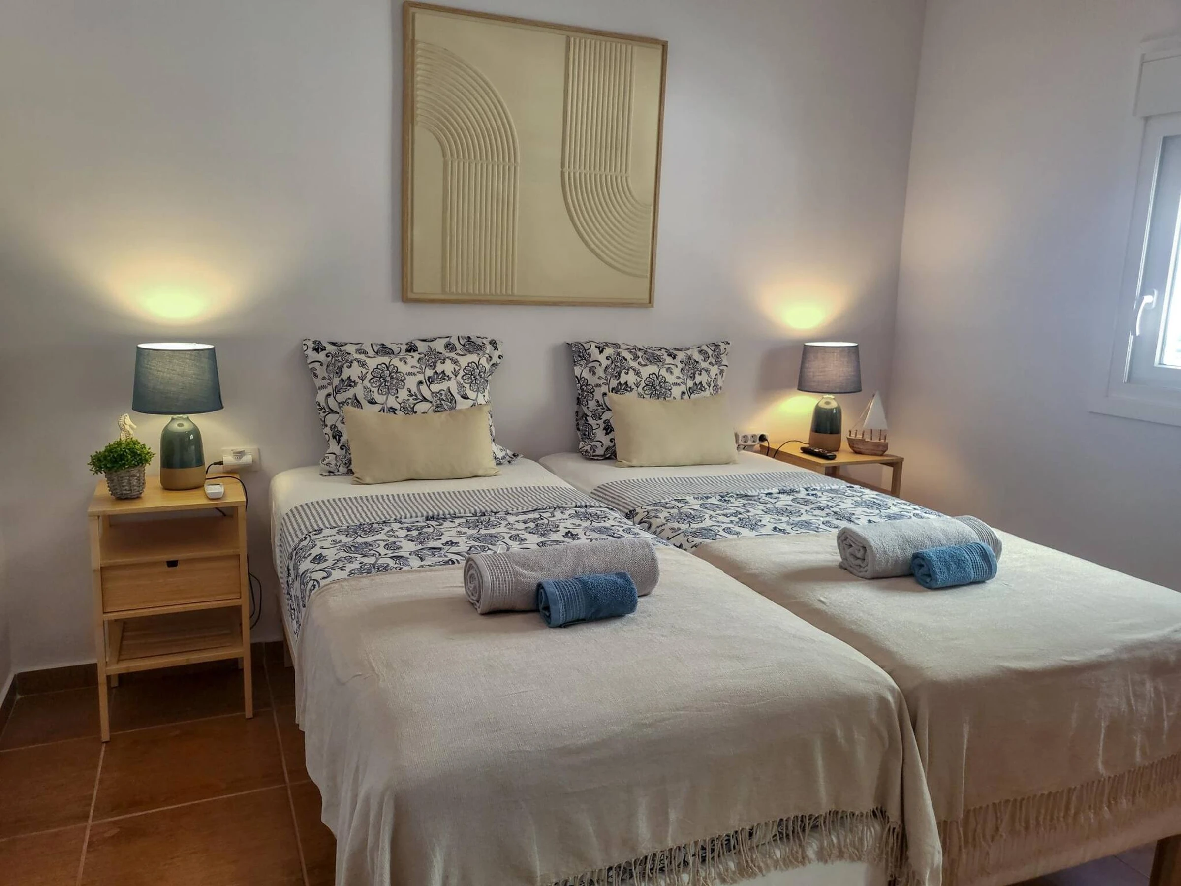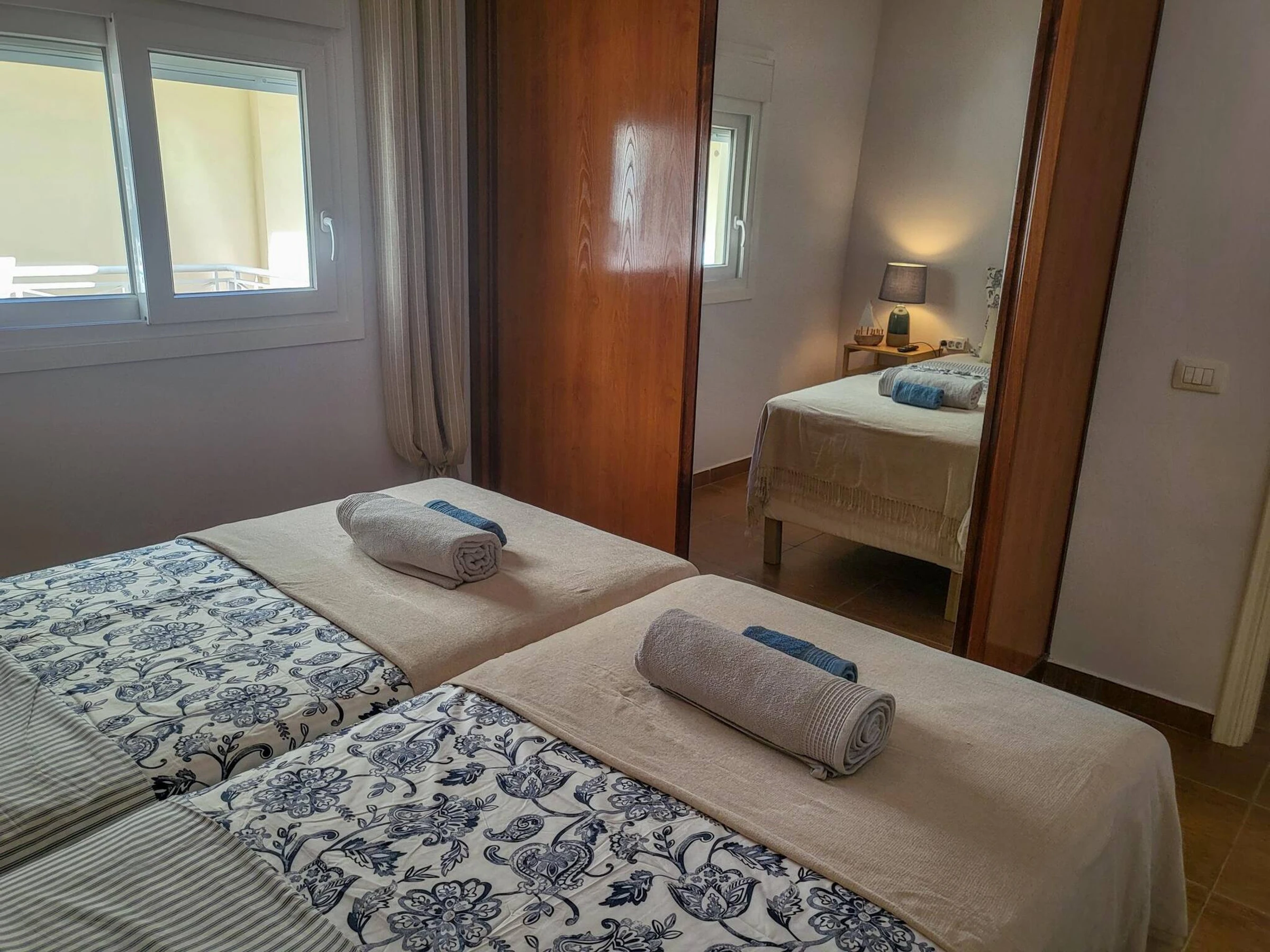It is a spacious flat with 3 bedrooms and 2 bathrooms. One of the bedrooms with a double bed and a small terrace, and the other two with 2 single beds each. It has a large kitchen with a dishwasher and a tap with filtered water. A lounge with seating area and dining table. There is also a small terrace where you can have breakfast with a view of the sea.
