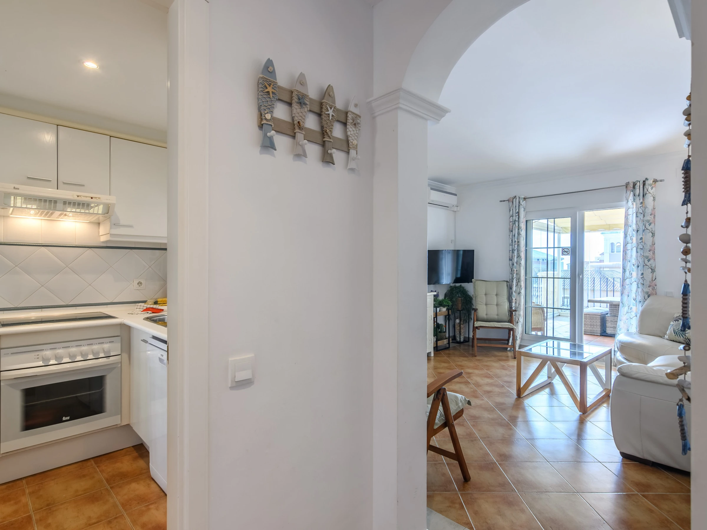 The open plan kitchen, of hotplate of glass ceramics, is equipped with refrigerator, microwave, oven, freezer, dishwasher, dishes/cutlery, kitchen utensils, coffee machine, toaster, kettle and juicer.