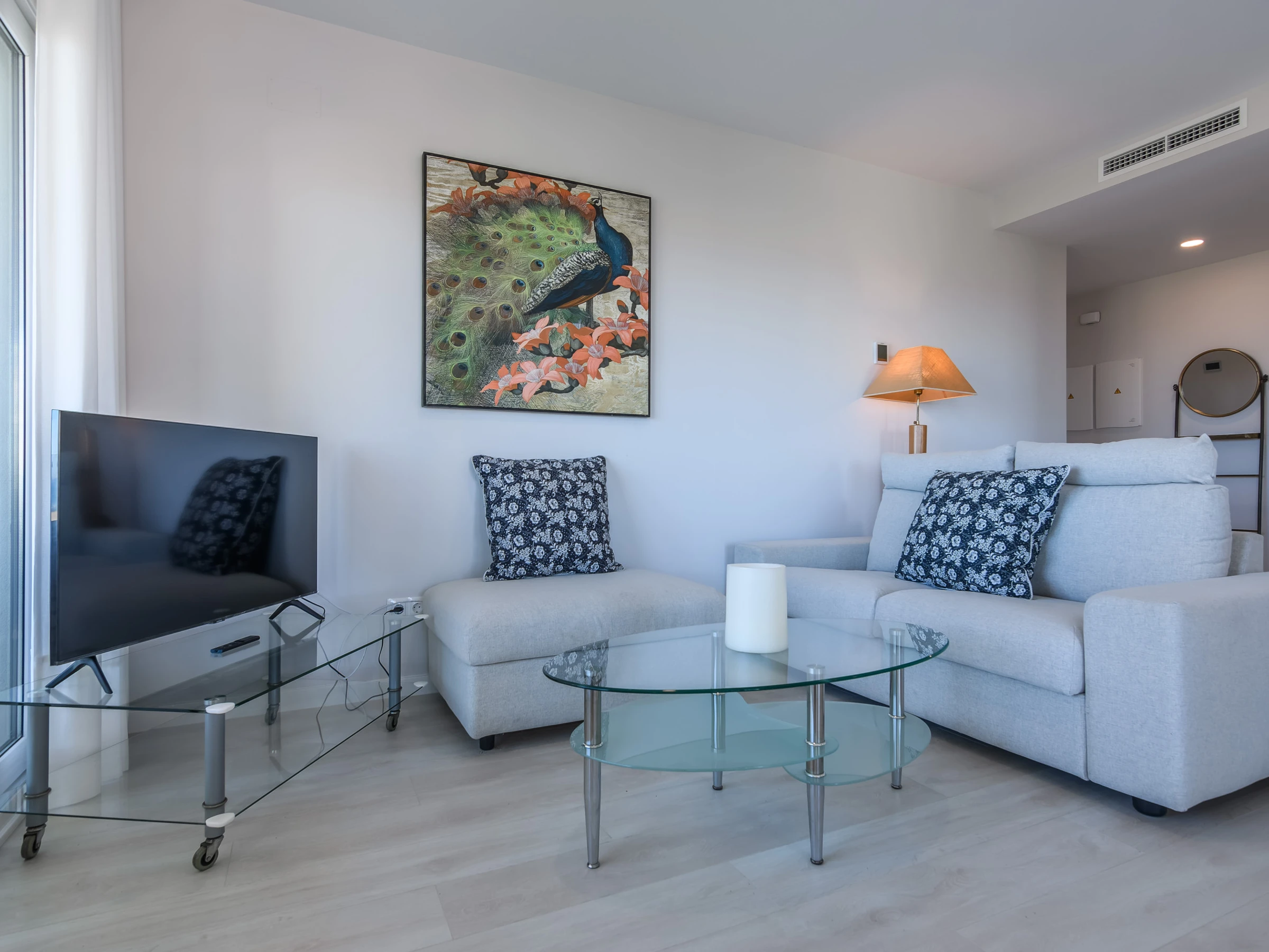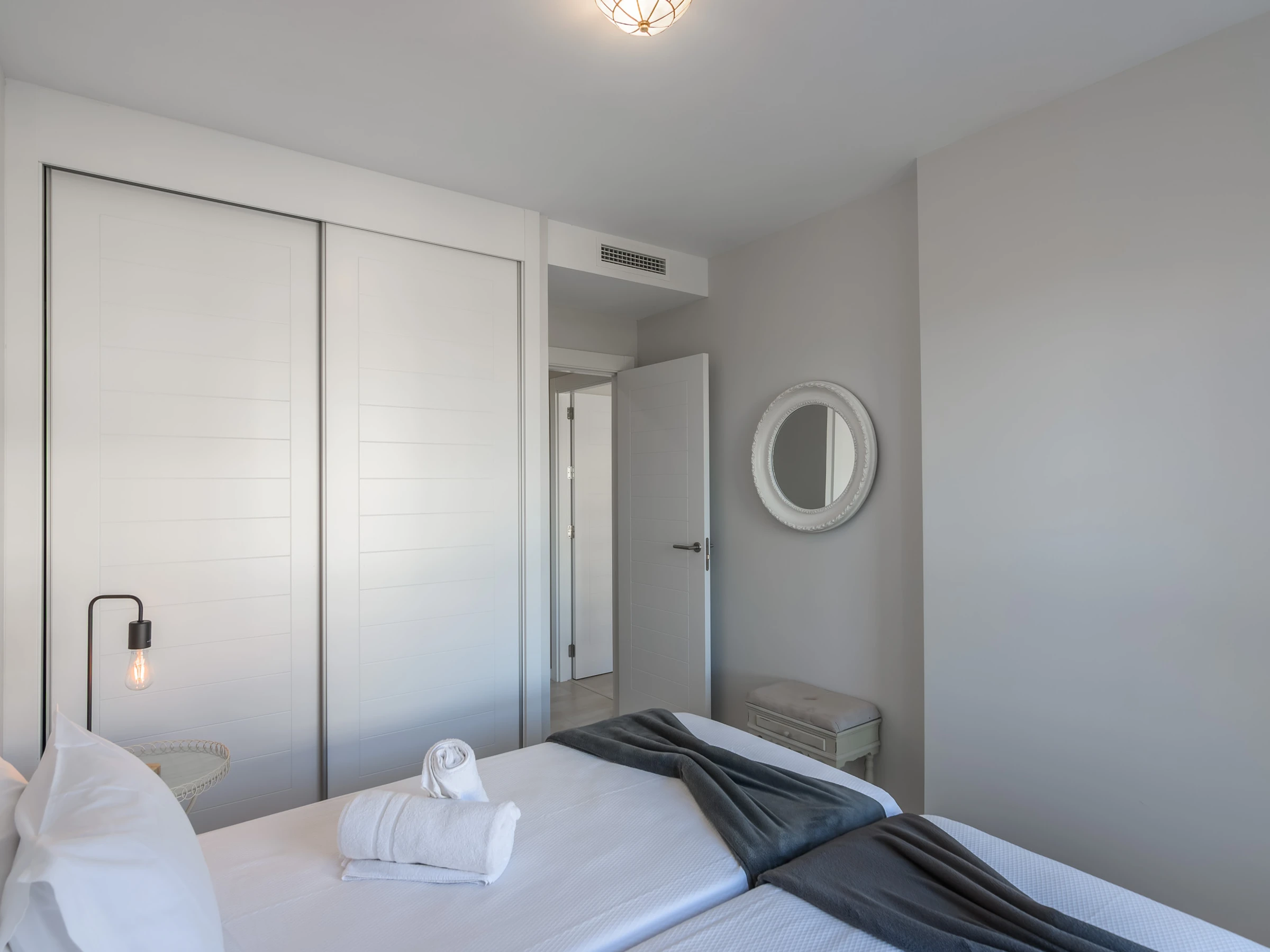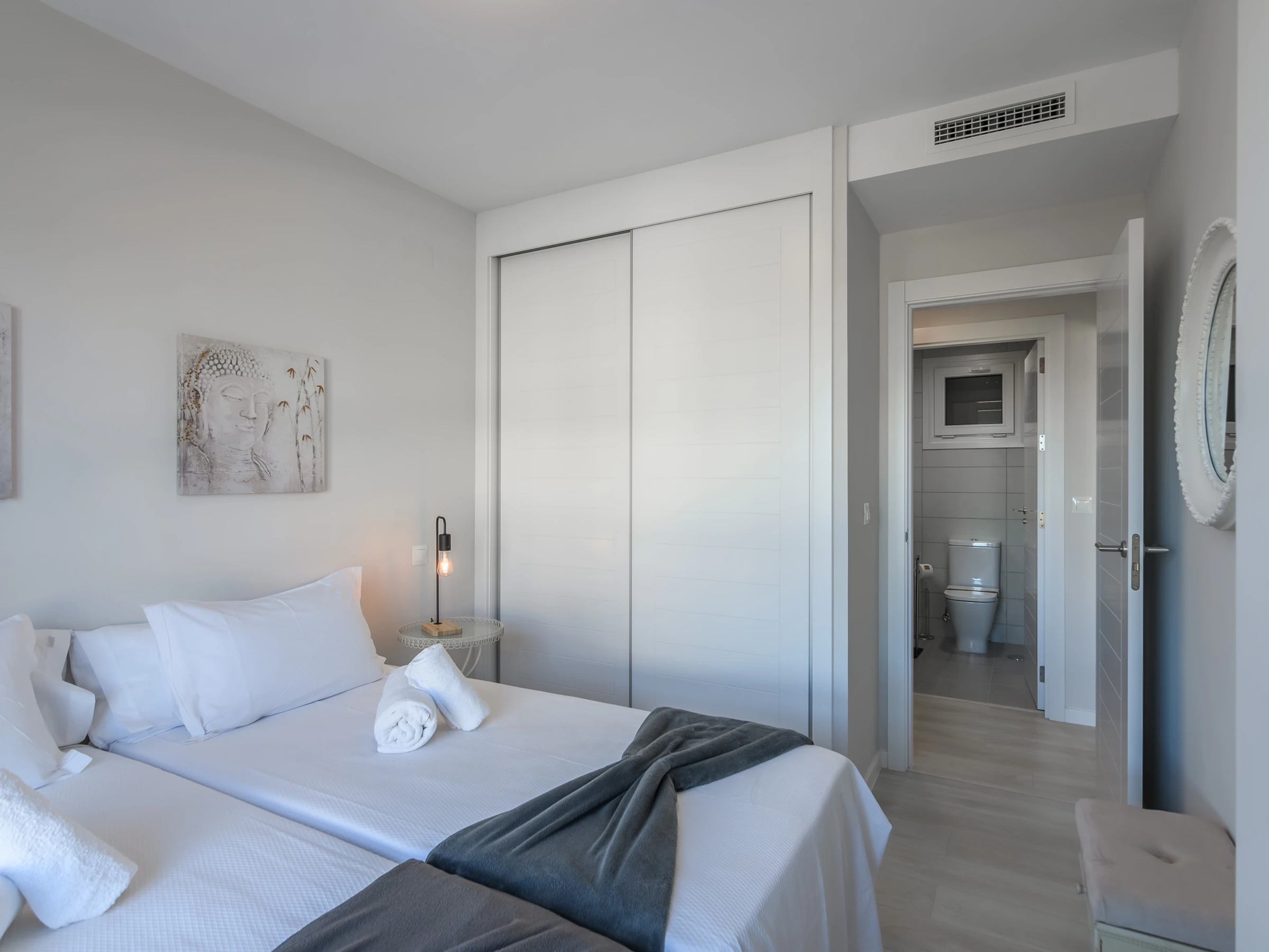 The apartment has two fully equipped bedrooms: one room with a double bed and two single beds, ensuring comfortable rest for all guests. The interior layout is designed with comfort in mind, with air conditioning and heat pump heating to maintain the perfect temperature throughout the year.