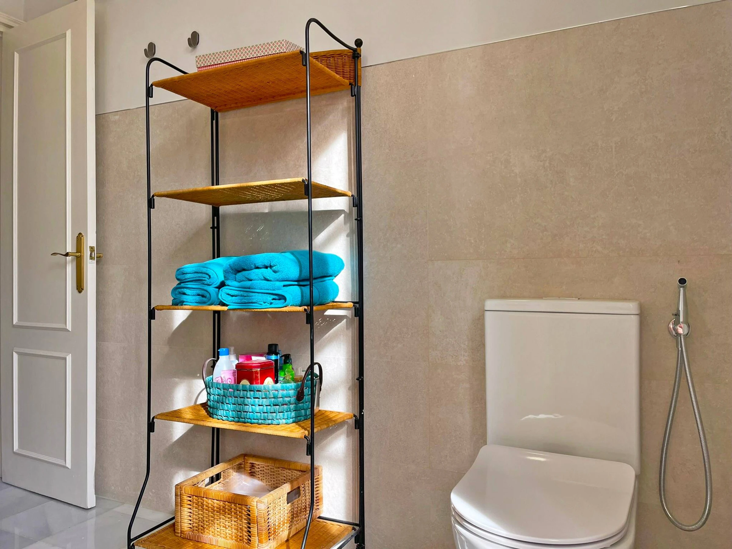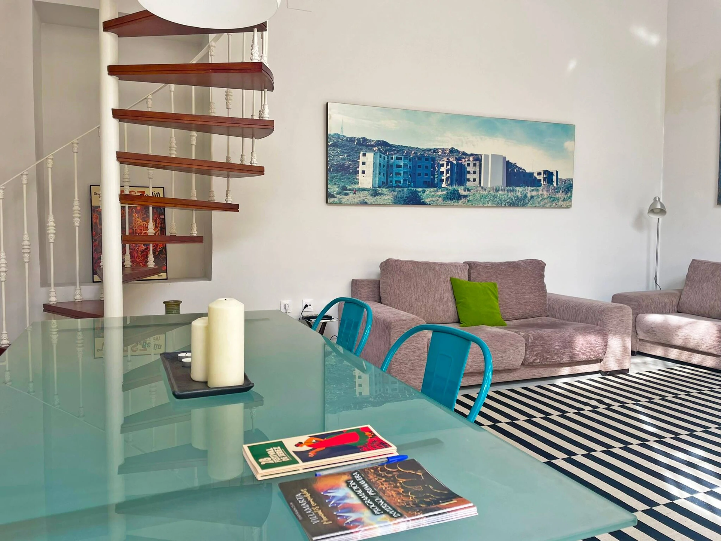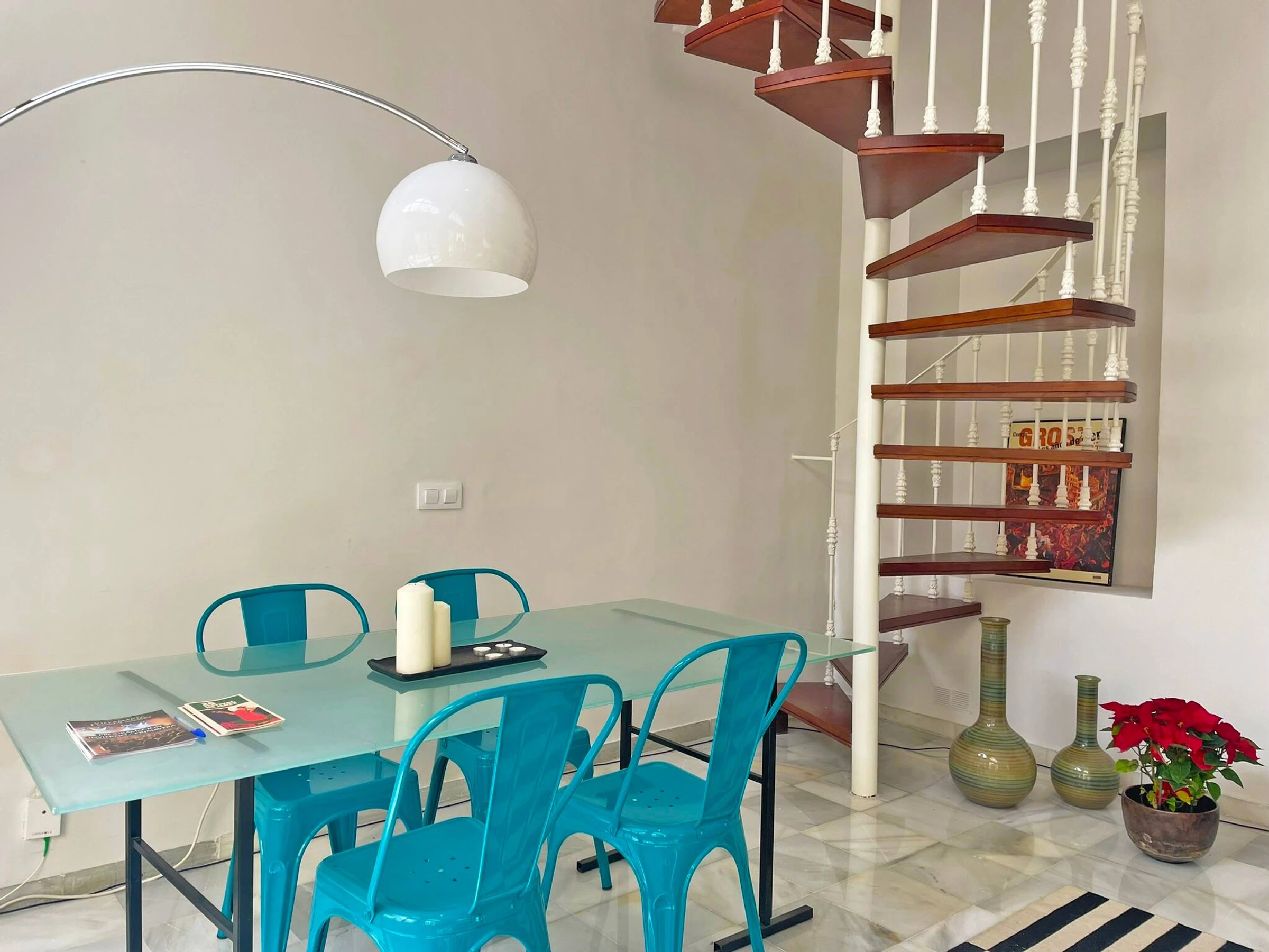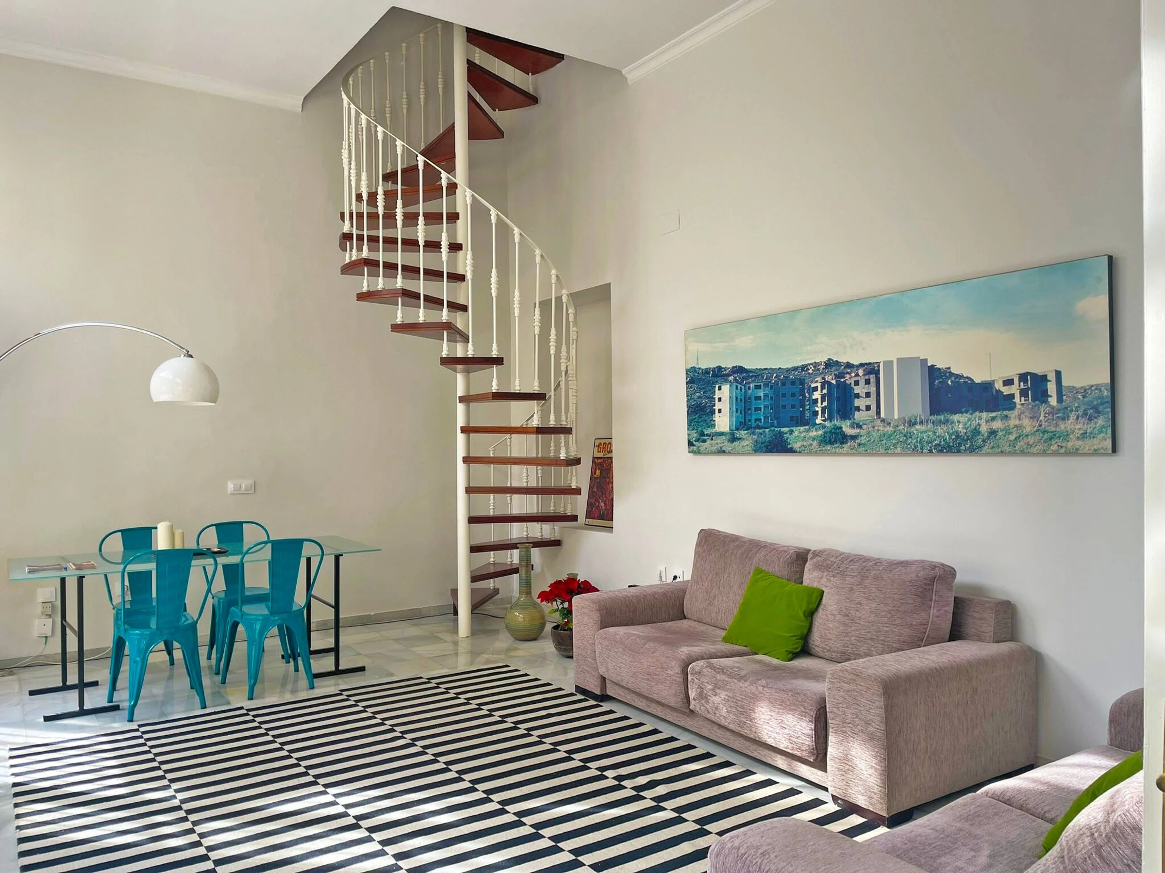 The accommodation is a duplex located on the ground floor of a residential building. You must climb a spiral staircase to access the bedrooms and main bathroom. This lodging has everything necessary for an unbeatable stay, including air conditioning and free internet connection.