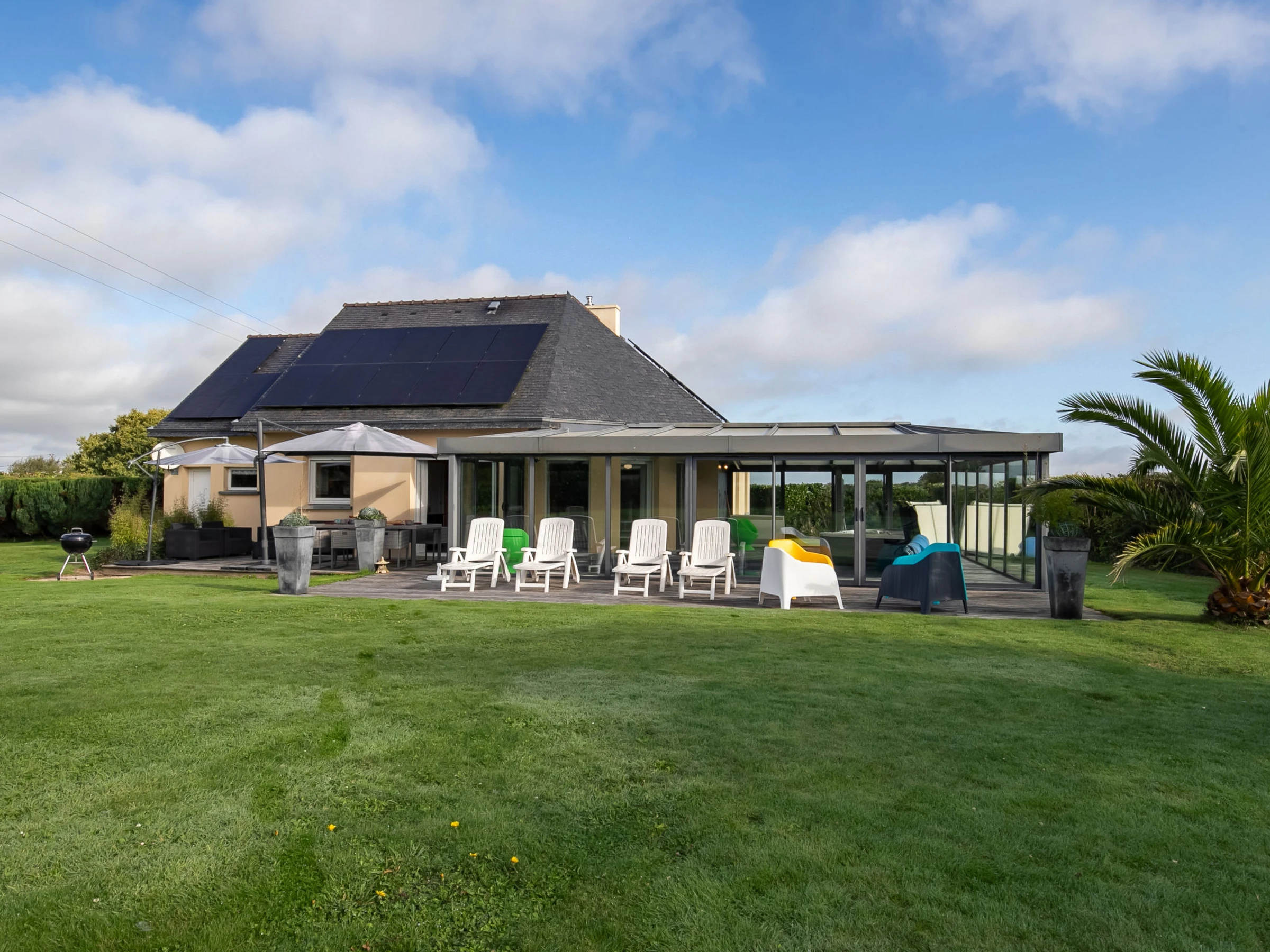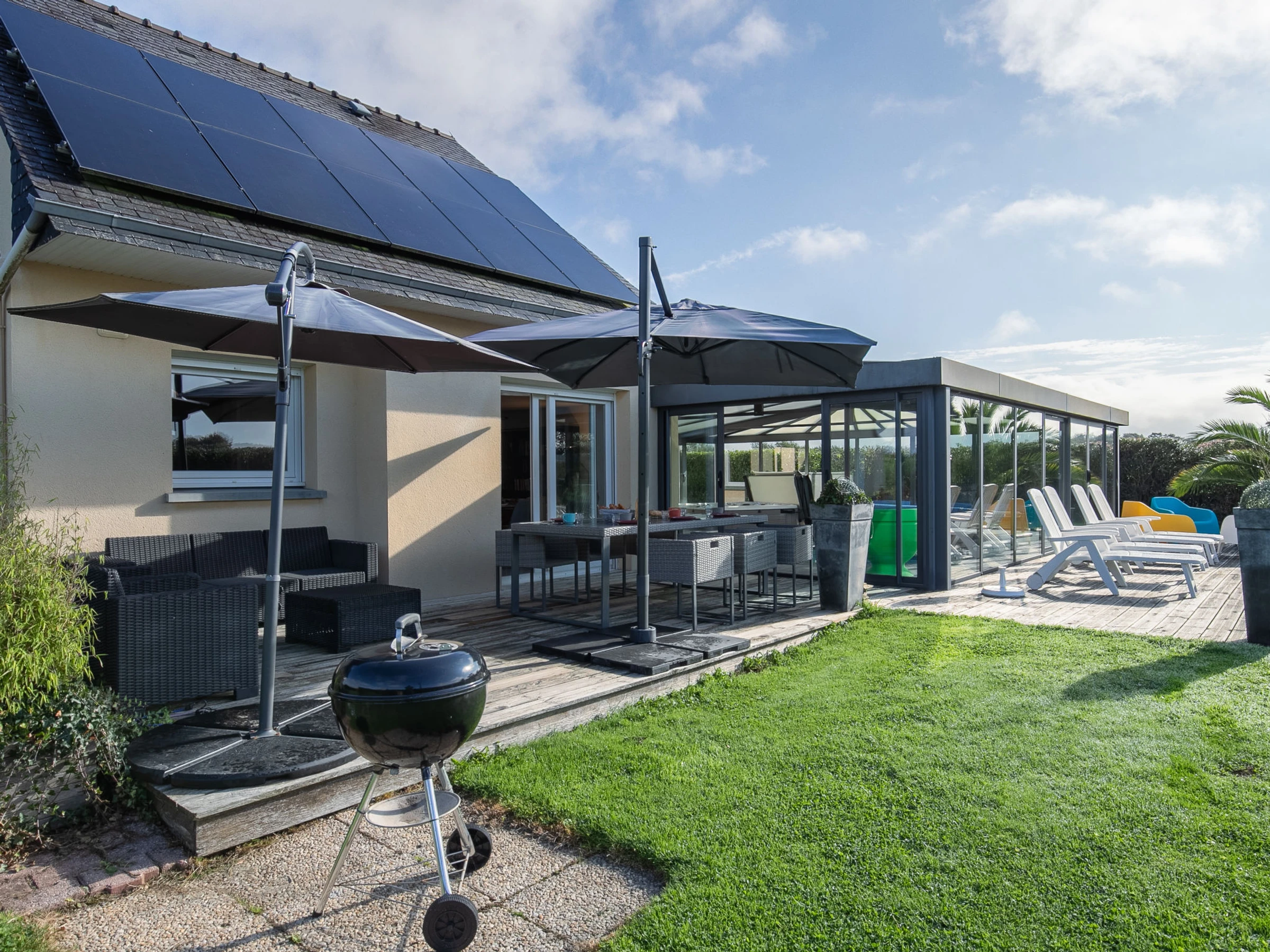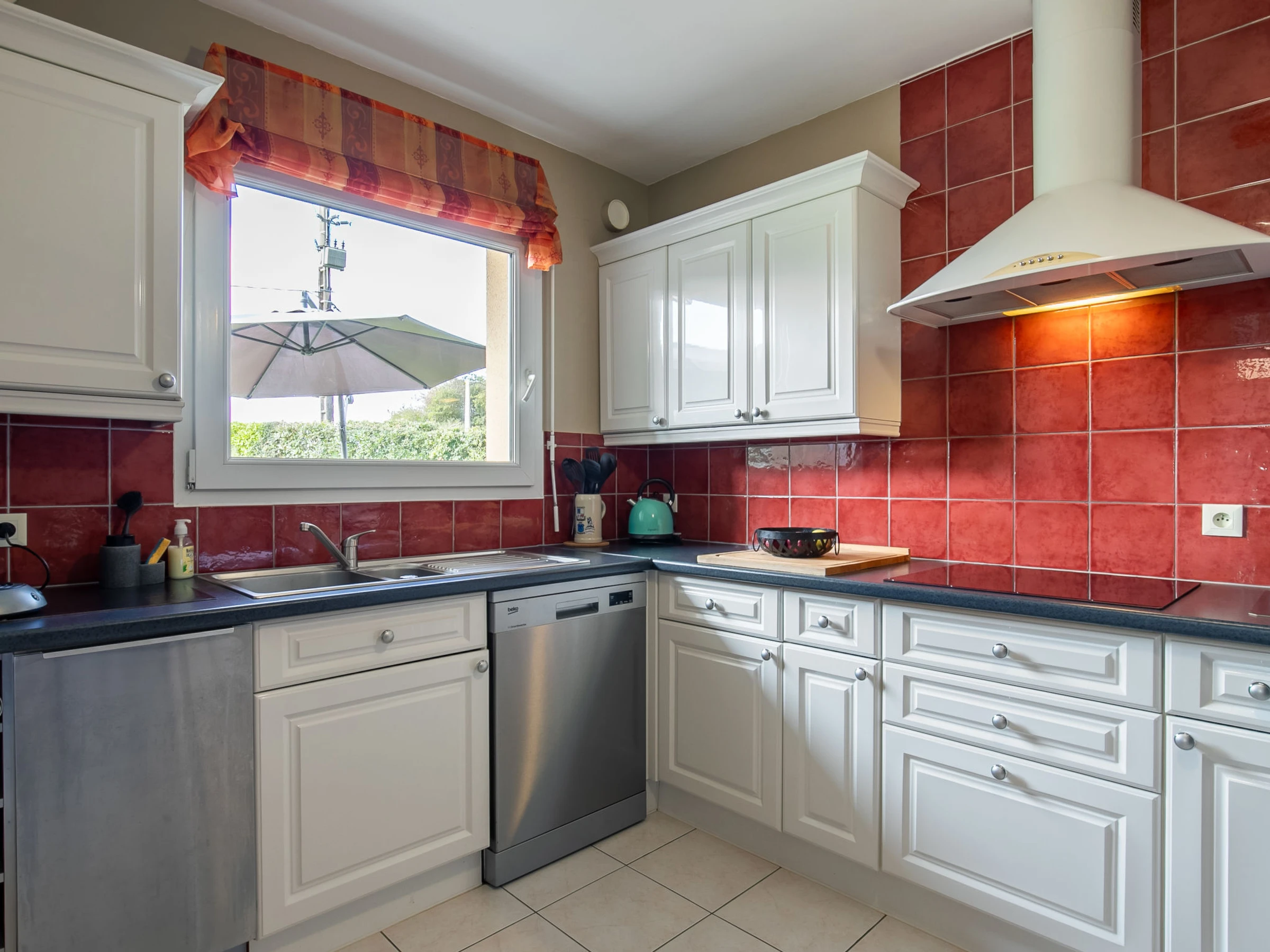 Beautiful, cosy, comfortable single-family house "Chez David". In the hamlet Keradec 1.8 km from the centre of Kersaint-Plabennec, 8.4 km from the centre of Plabennec, in a quiet position, 13 km from the sea, 13 km from the beach. Private: property 1'500 m2 (fenced), well-kept garden with lawn and wildlife garden, indoor pool heated (8 x 4 m, depth 170 cm, seasonal availability: [hidden] and [hidden] Hot tub, pool house with shower, children's playground (slide, swing). In the house: fitness room. Parking (for 2 cars) on the premises. Shop 11 km, supermarket 3 km, shopping centre 15 km, restaurant 1.7 km, bar 1.7 km, bakery 3.7 km, bus stop 1.7 km, sandy beach "Plage du Moulin Blanc" 13 km, indoor swimming pool 15 km. Sports harbour 15 km, golf course (18 hole) 20 km, surf school 15 km, sailing school 15 km. Nearby attractions: Landerneau 12 km, Brest, Océanopolis 16 km, Plougonvelin, Fort Berthaume 40 km, Pointe de St.Mathieu, Le Conquet 43 km, Saint Renan 25 km, Quimper 73 km.