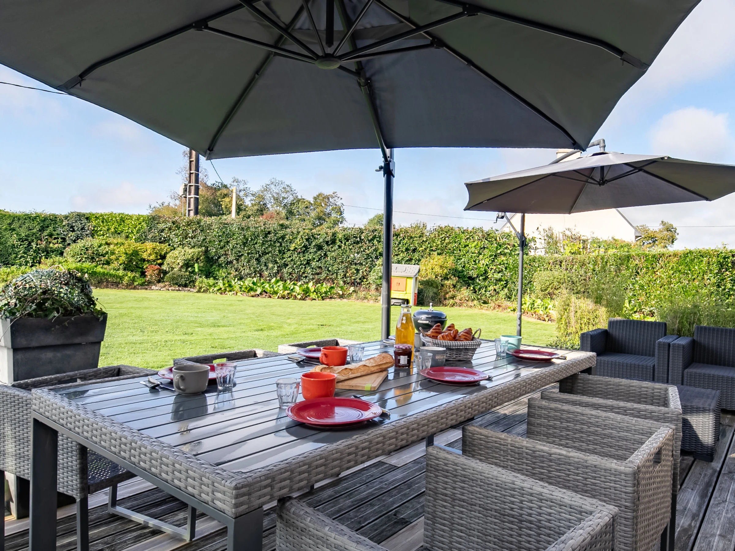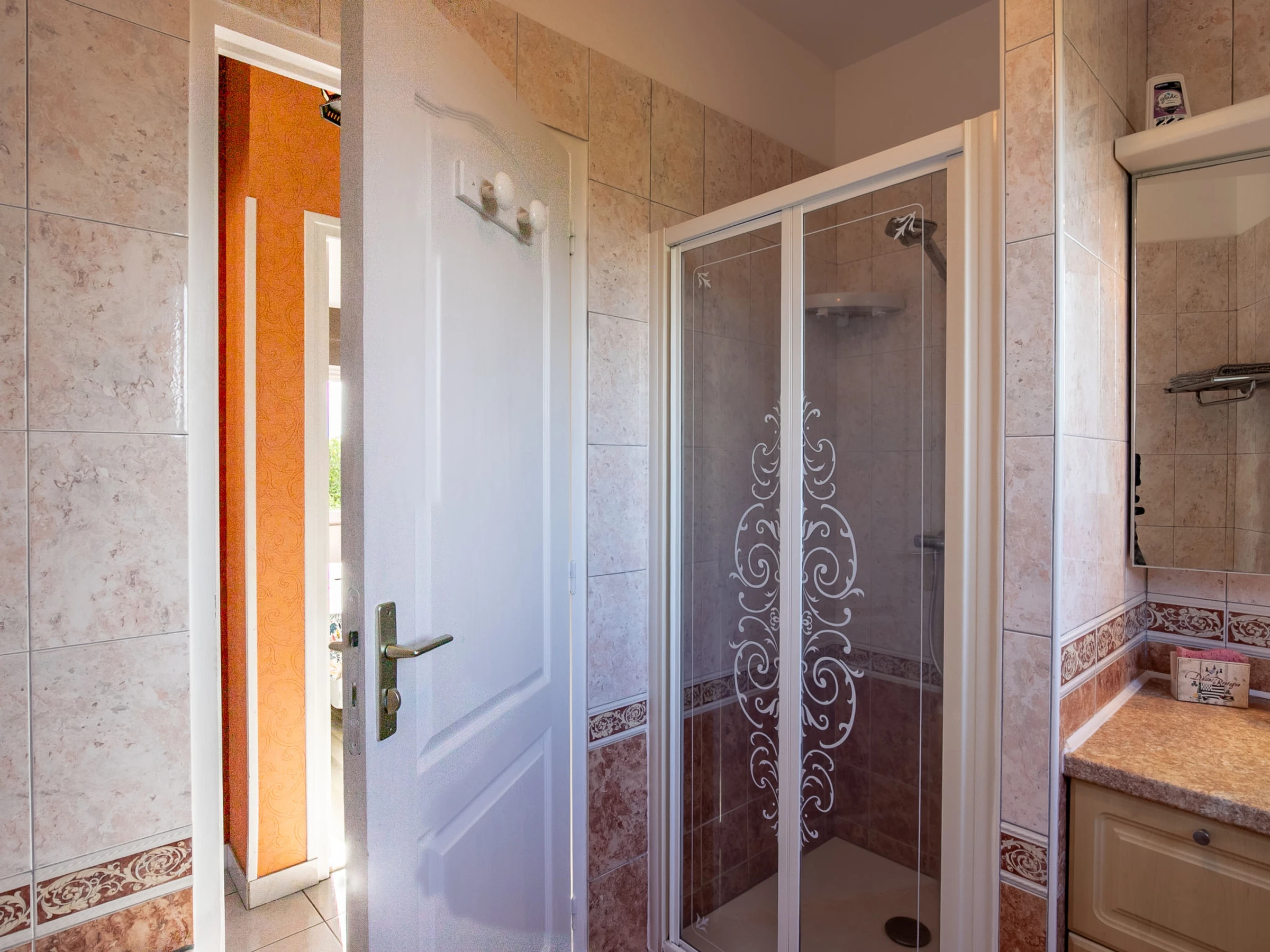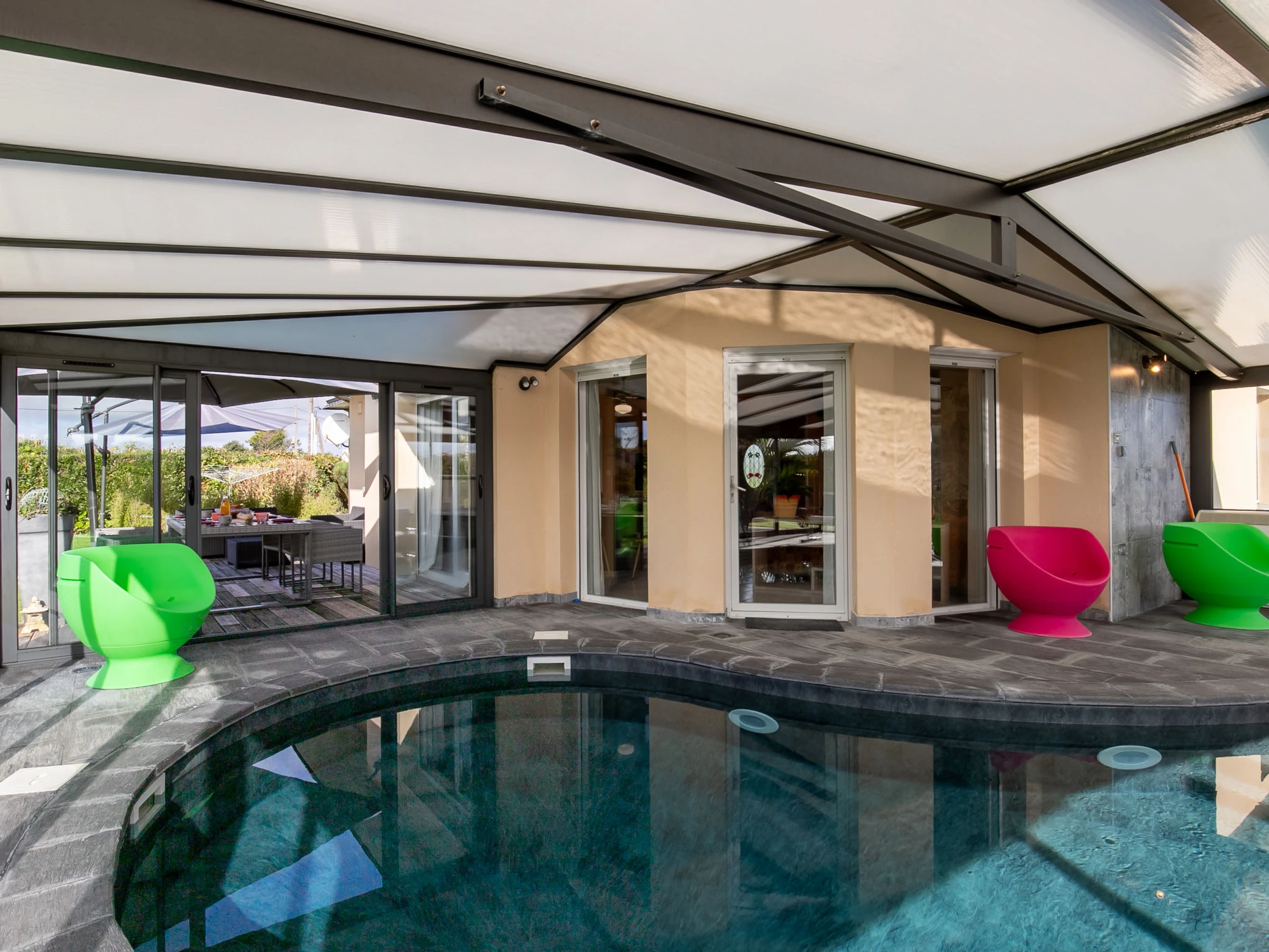 Beautiful, cosy, comfortable single-family house "Chez David". In the hamlet Keradec 1.8 km from the centre of Kersaint-Plabennec, 8.4 km from the centre of Plabennec, in a quiet position, 13 km from the sea, 13 km from the beach. Private: property 1'500 m2 (fenced), well-kept garden with lawn and wildlife garden, indoor pool heated (8 x 4 m, depth 170 cm, seasonal availability: [hidden] and [hidden] Hot tub, pool house with shower, children's playground (slide, swing). In the house: fitness room. Parking (for 2 cars) on the premises. Shop 11 km, supermarket 3 km, shopping centre 15 km, restaurant 1.7 km, bar 1.7 km, bakery 3.7 km, bus stop 1.7 km, sandy beach "Plage du Moulin Blanc" 13 km, indoor swimming pool 15 km. Sports harbour 15 km, golf course (18 hole) 20 km, surf school 15 km, sailing school 15 km. Nearby attractions: Landerneau 12 km, Brest, Océanopolis 16 km, Plougonvelin, Fort Berthaume 40 km, Pointe de St.Mathieu, Le Conquet 43 km, Saint Renan 25 km, Quimper 73 km.