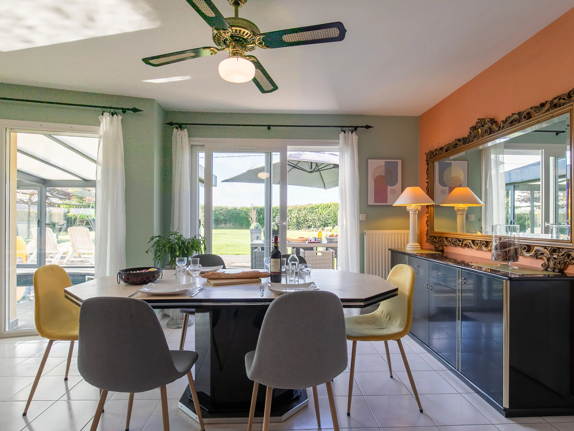 "Chez David", 4-room house 110 m2. Bright, comfortable and tasteful furnishings: living/dining room 35 m2 with satellite TV, international TV channels, flat screen, radio and wood-burning stove. Exit to the terrace, to the swimming pool. 1 room with 1 french bed (140 cm, length 190 cm), TV and flat screen. 1 room with 1 double bed (2 x 80 cm, length 190 cm). 1 room with 2 beds (80 cm, length 190 cm). Open kitchen (oven, dishwasher, 4 gas rings, toaster, kettle, microwave, freezer, electric coffee machine). Bath/shower, sep. WC. Heating. Terrace 28 m2, south facing position. Terrace furniture, barbecue, deck chairs. Facilities: washing machine, dryer, iron, children's high chair, baby cot for up to 2 year olds, hair dryer. Internet (WiFi, free). Please note: non-smoking house. Maximum 1 small pet/ dog allowed. Smoke alarm, fire extinguisher. Offer by a private individual according to Art. 155, IV of CGI.