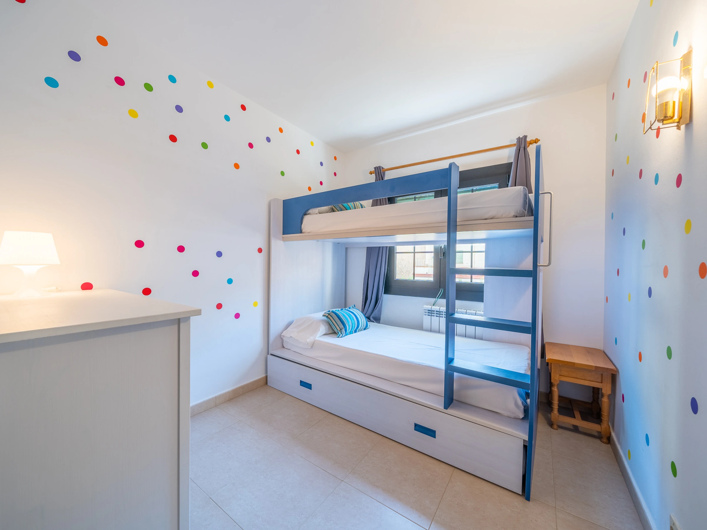 This accommodation has two bedrooms: a bedroom with a double bed (160 cm), and a bedroom with a bunk which consists of 3 single beds (90 cm). All beds offer linen, duvets or blankets and pillows.