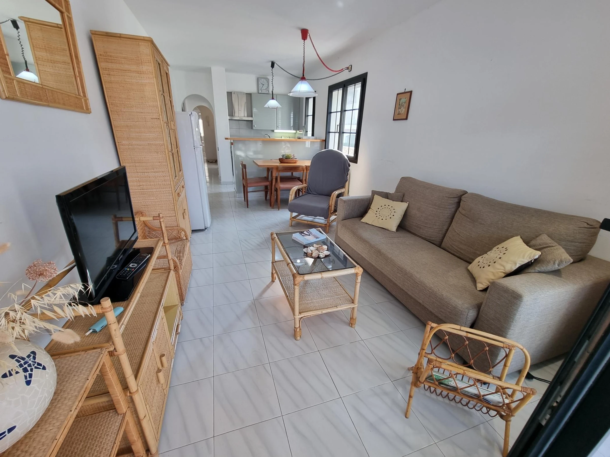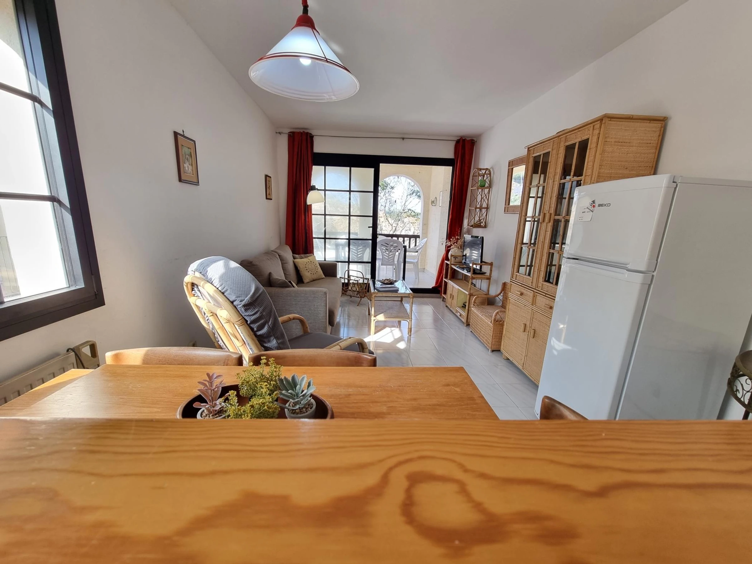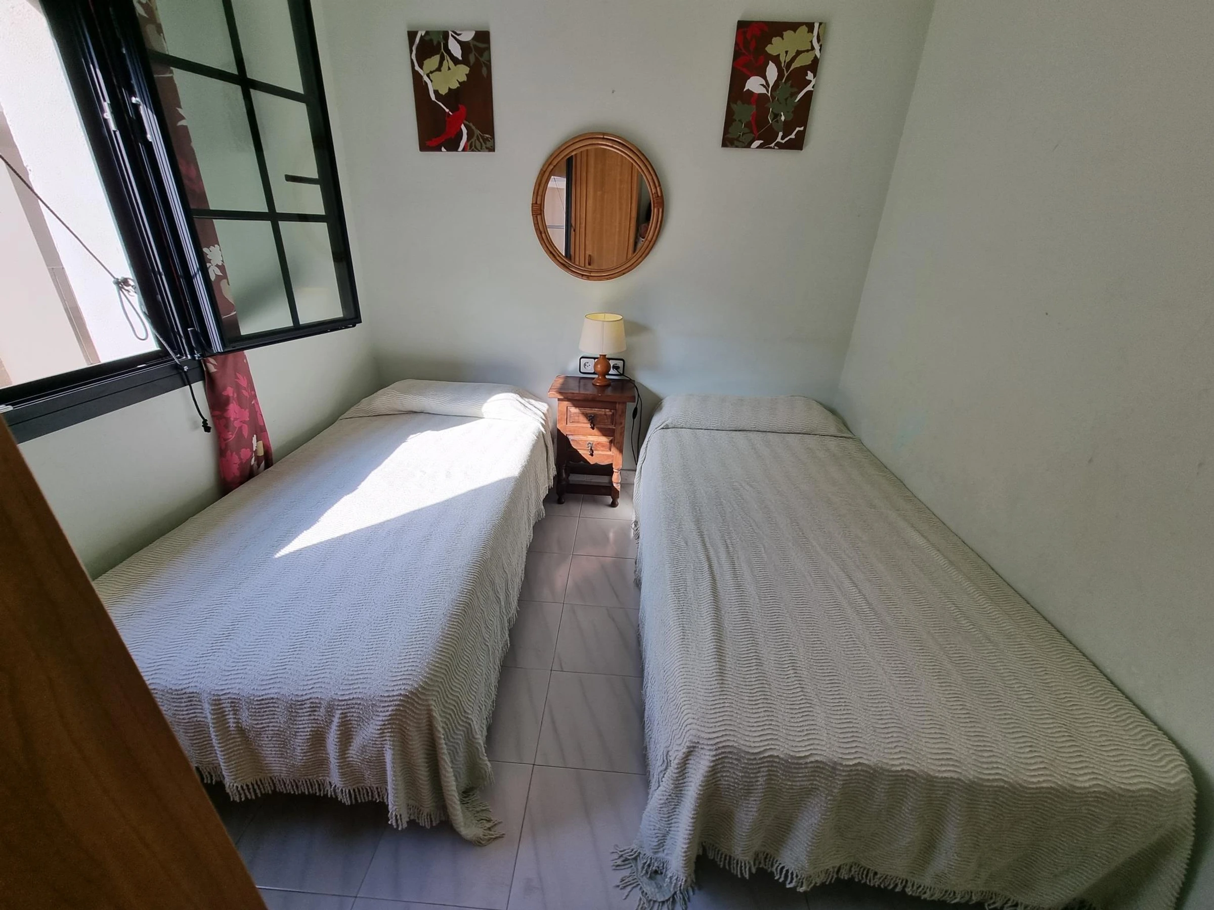 It features three bedrooms, one of them a suite, a full bathroom, and a living-dining room with an open kitchen, providing everything you need for a comfortable stay. What makes it special is its terrace with sea views, where you can enjoy a morning coffee or relax at sunset. The building also has a communal pool, perfect for cooling off without leaving home.