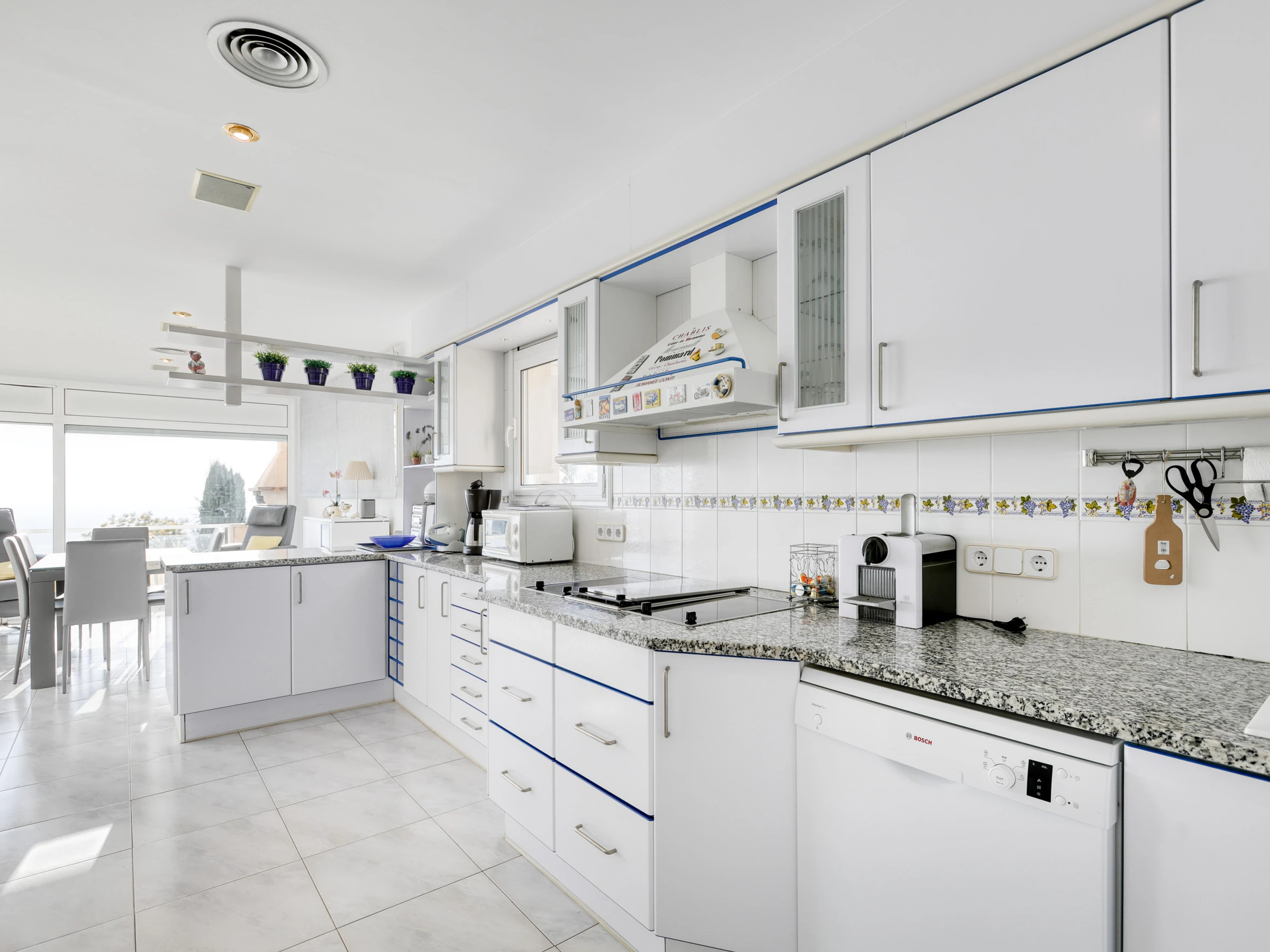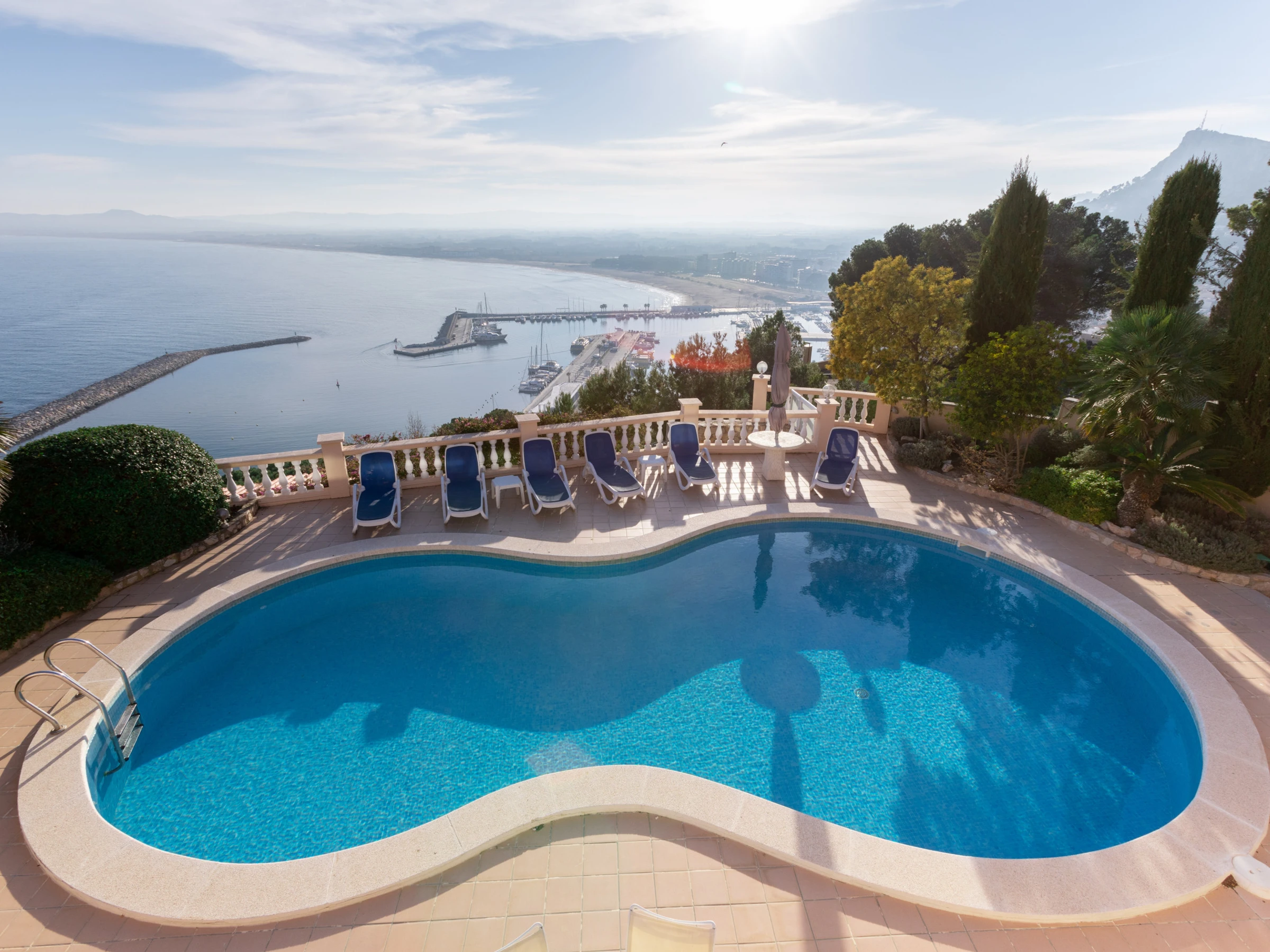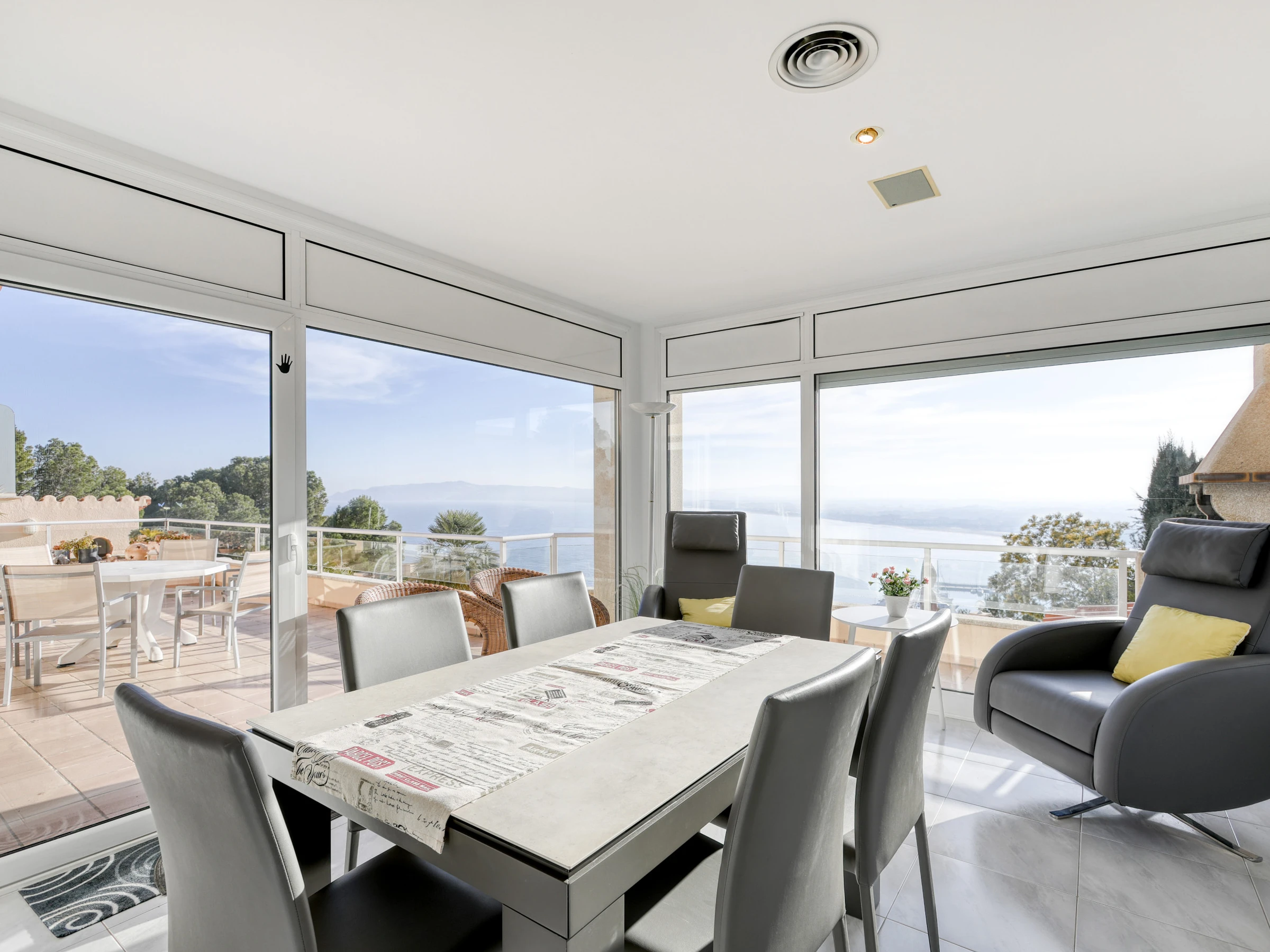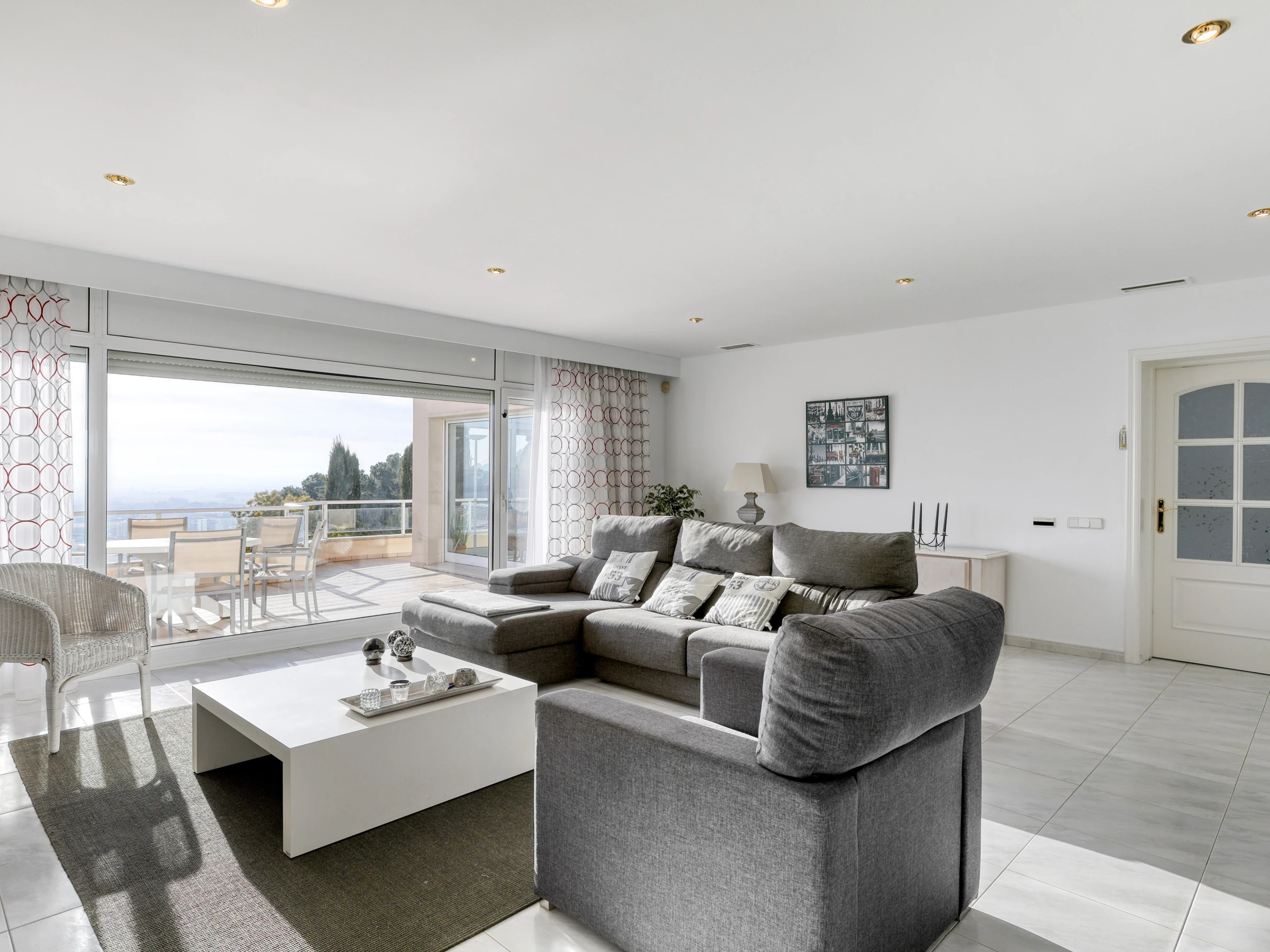 With an area of 312 m², the villa has been designed to guarantee spaciousness, comfort and luminosity in every corner. It has 3 bedrooms and capacity for 6 people, an elegant living room with direct access to sunny terraces, garden with outdoor furniture and private pool with sea views. In addition, it offers barbecue area, fenced plot and two outdoor parking spaces, all in a serene environment surrounded by mountains.
