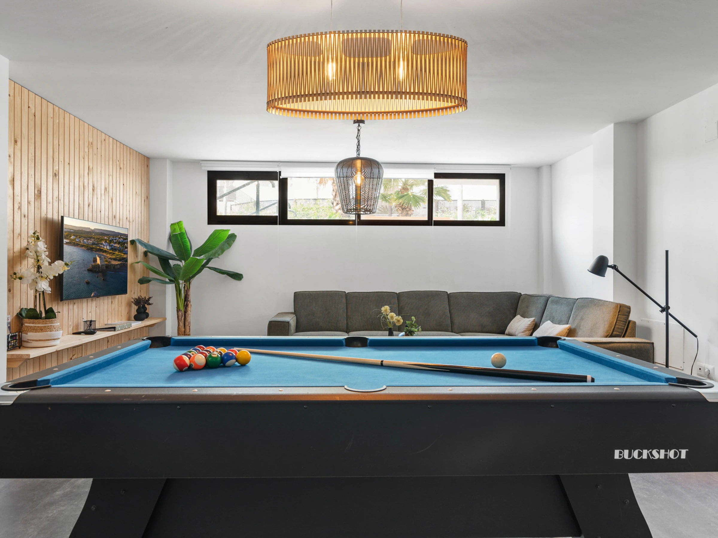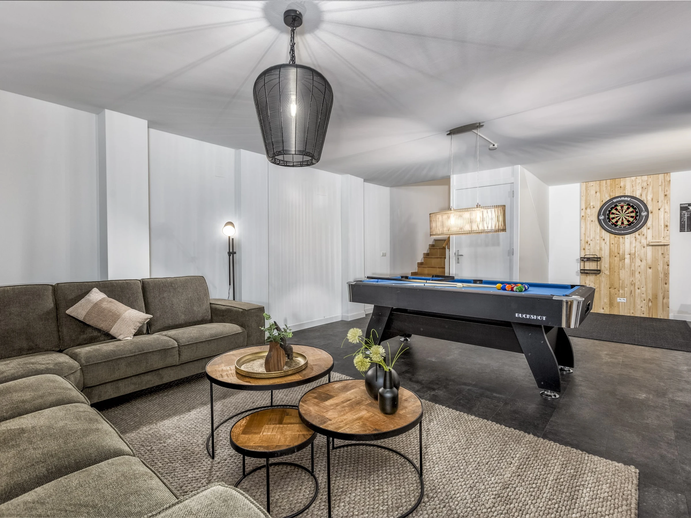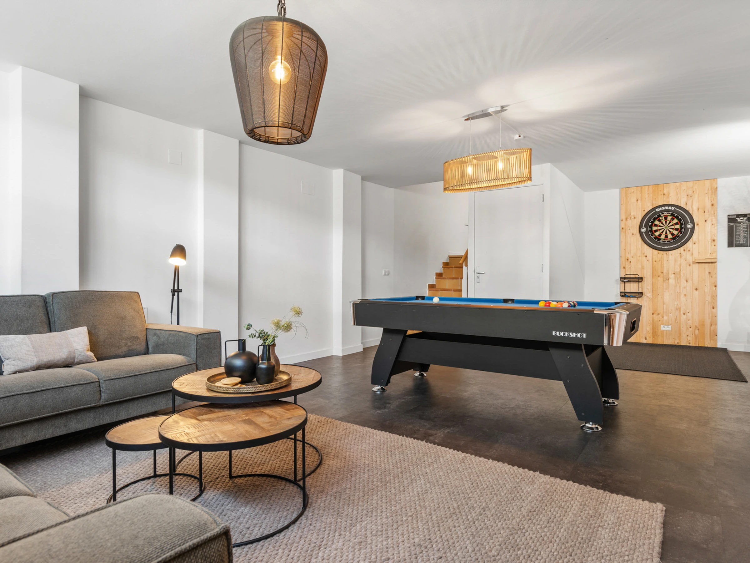 The apartment is equipped with a pool table and a dartboard for a fun game night.