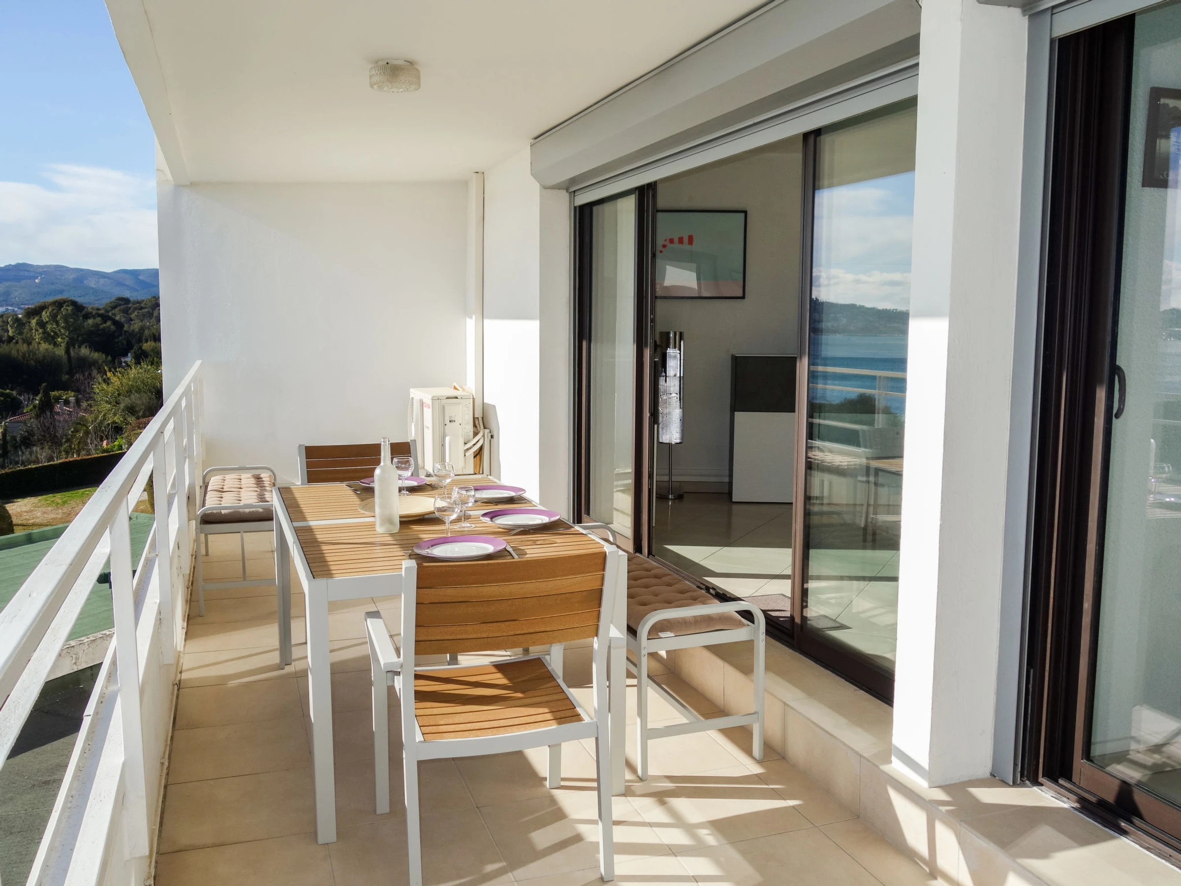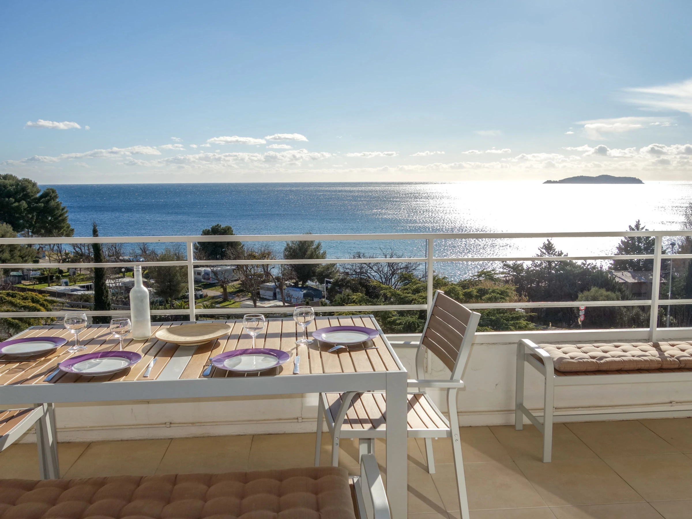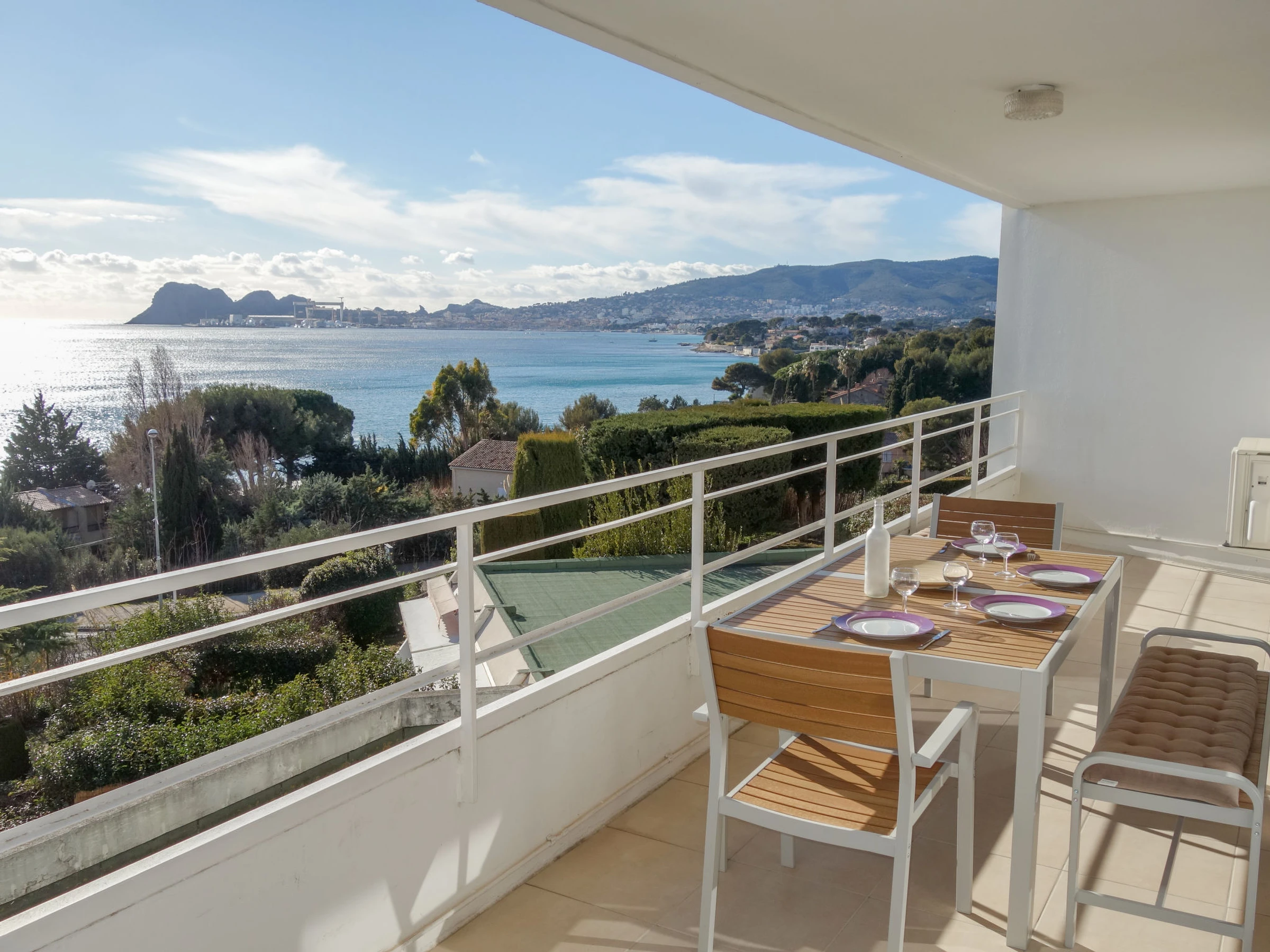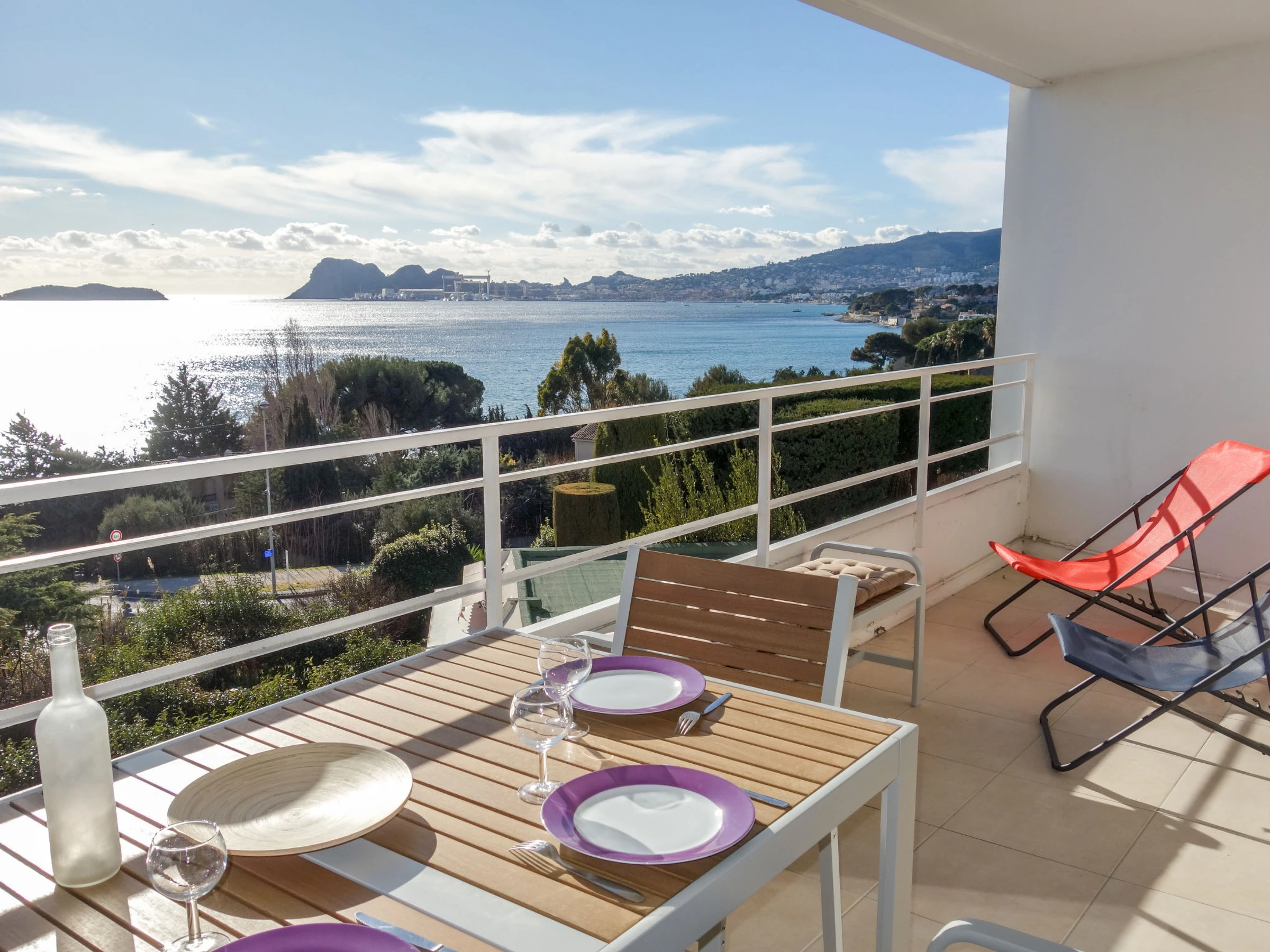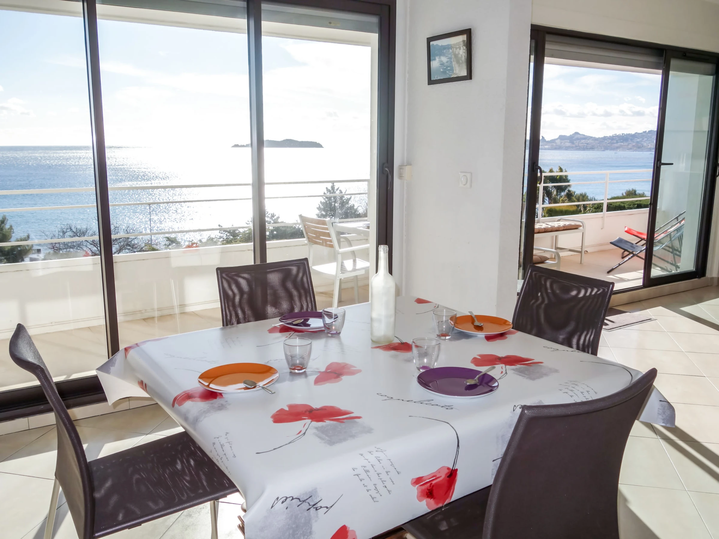 3-room apartment 56 m2 on 1st floor. Comfortable and beautiful furnishings: living/dining room with TV (flat screen), air conditioning. Exit to the terrace. 1 room with 2 beds (90 cm, length 190 cm), TV. 1 small room, window onto the living room with 1 french bed (140 cm, length 190 cm). Open kitchen (oven, dishwasher, 4 induction hot plates, toaster, kettle, microwave, freezer, electric coffee machine, Capsules for coffee machine (SENSEO) extra). Shower, sep. WC. Forced-air heating. Terrace 16 m2, roofed, south-west facing position. Terrace furniture, electric barbecue. Very beautiful panoramic view of the sea. Facilities: washing machine, iron. Internet (WiFi, free). Parking space n 646. Please note: TV only FR. Smoke alarm. [hidden]