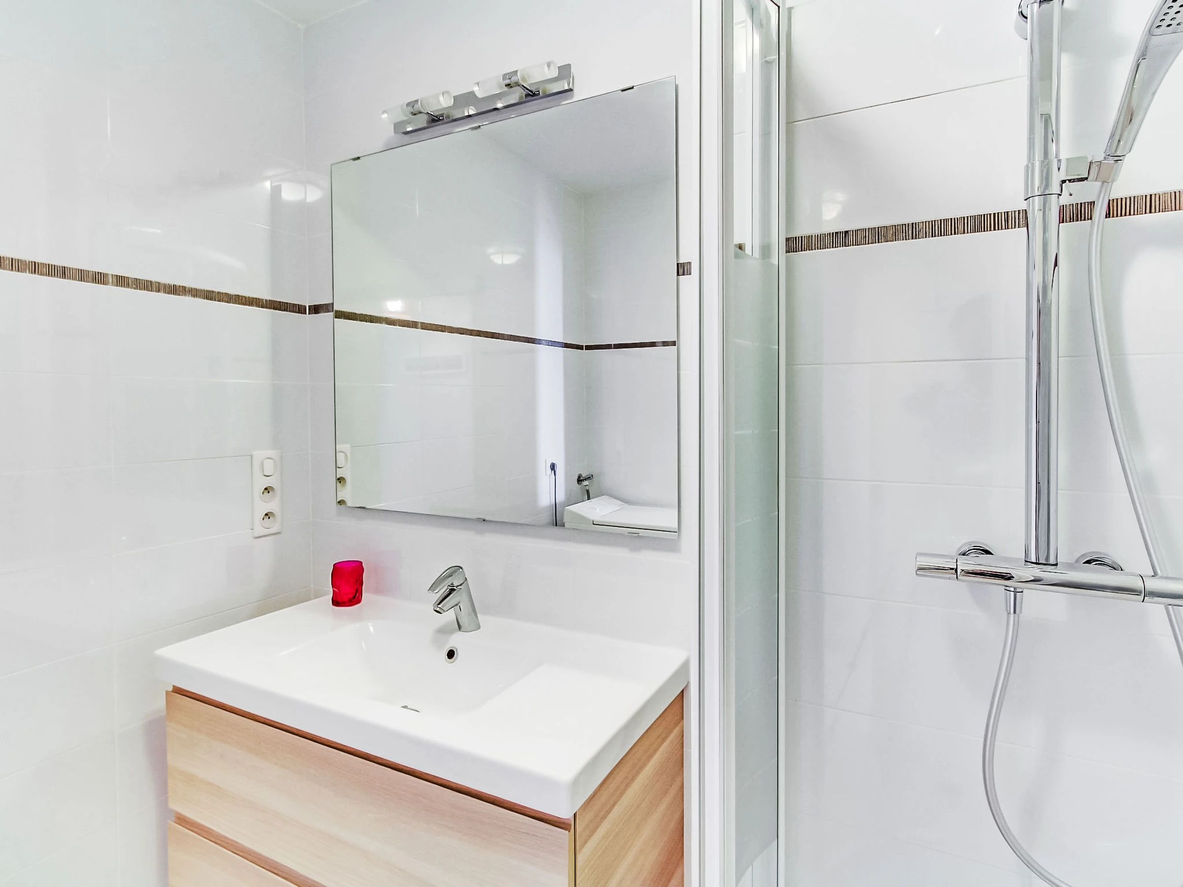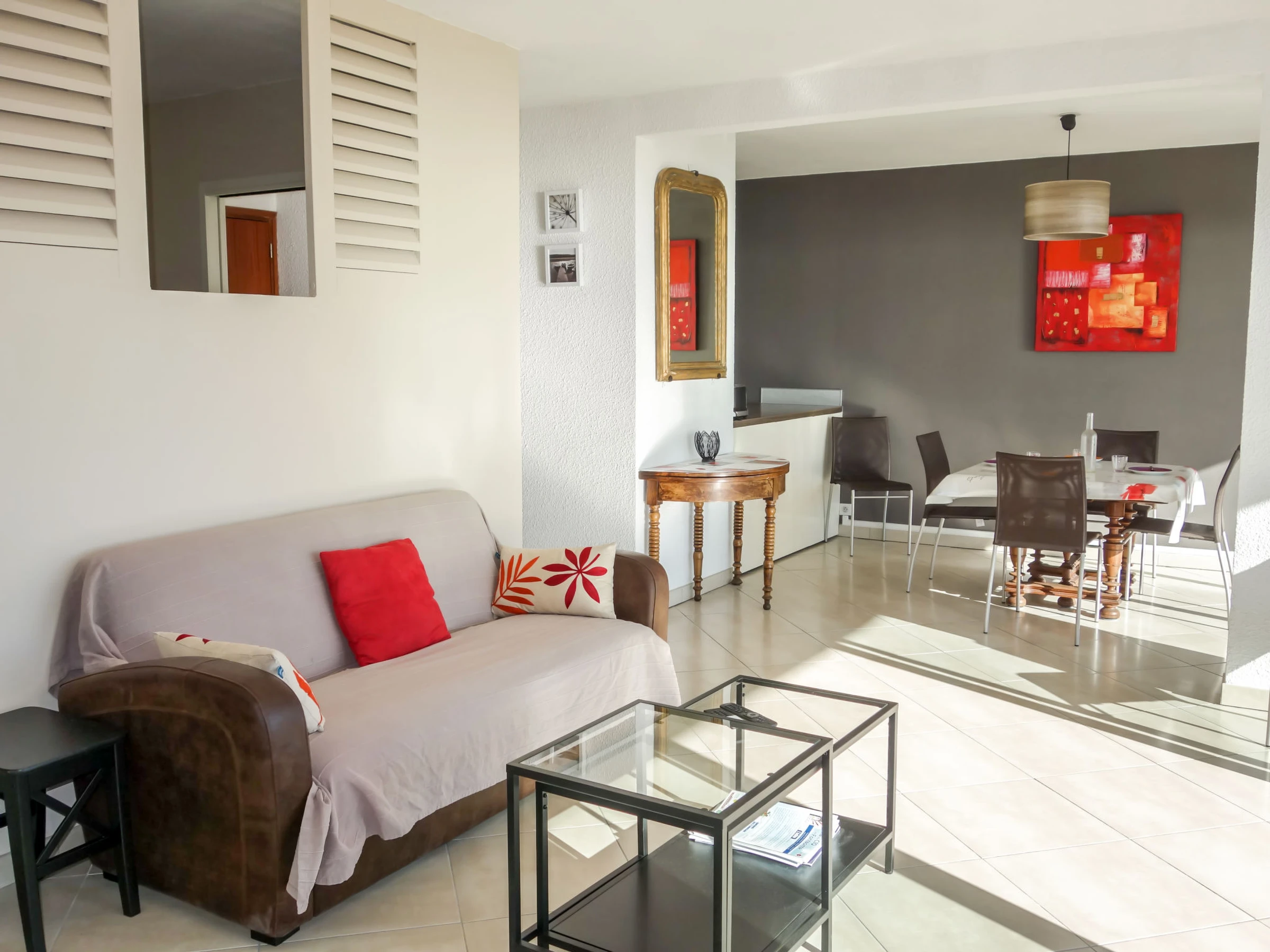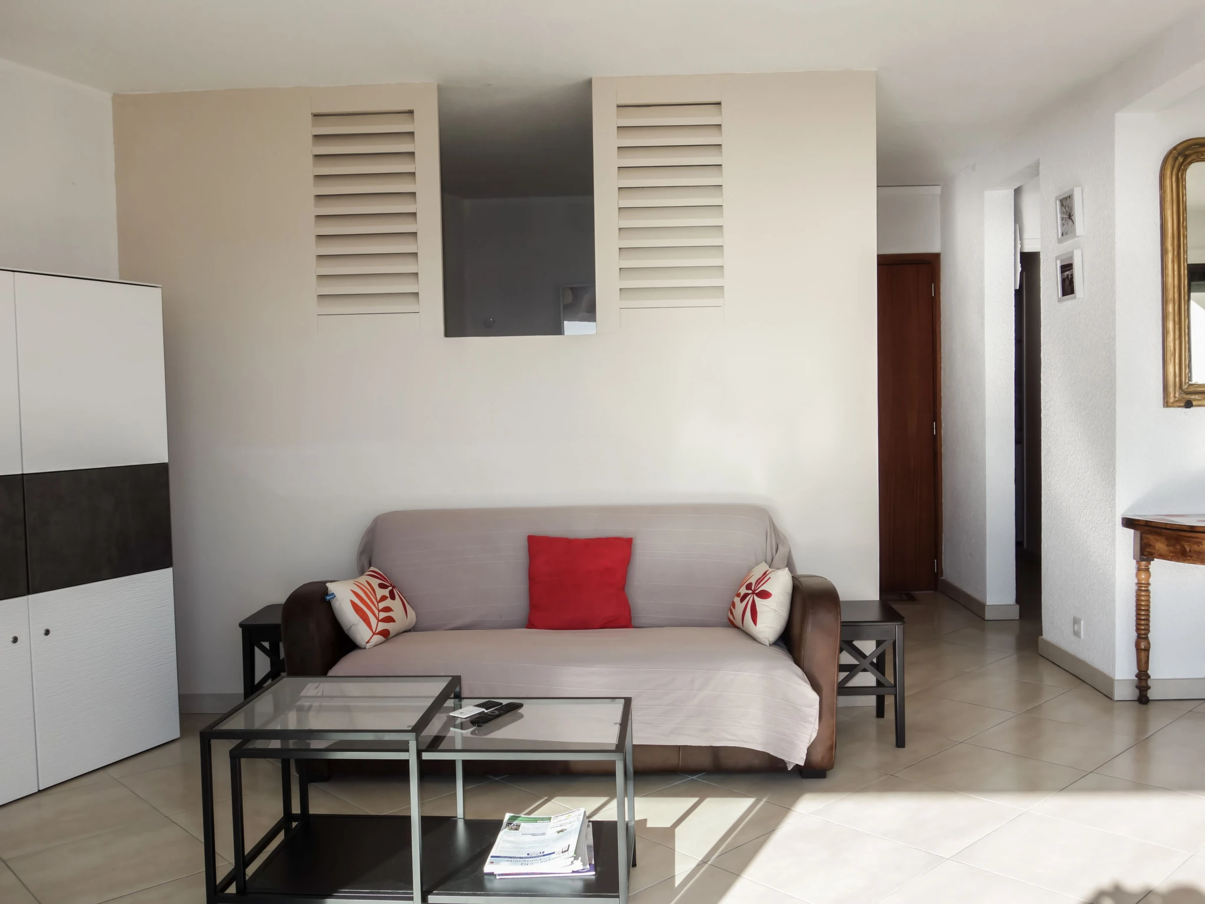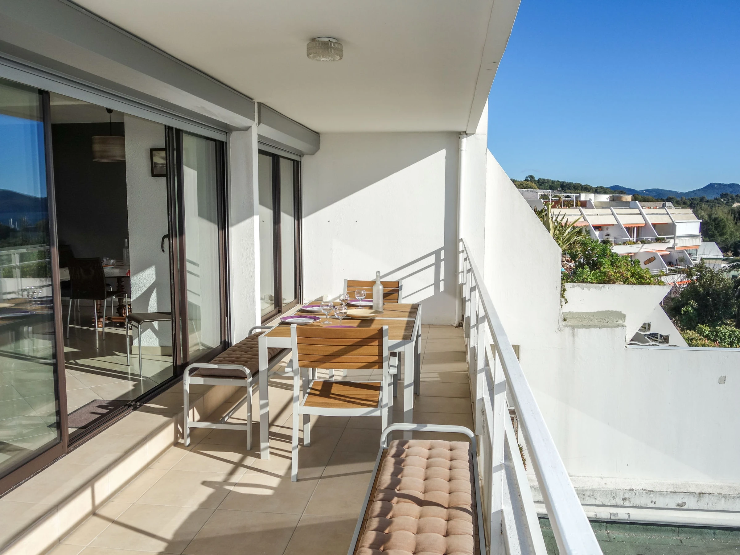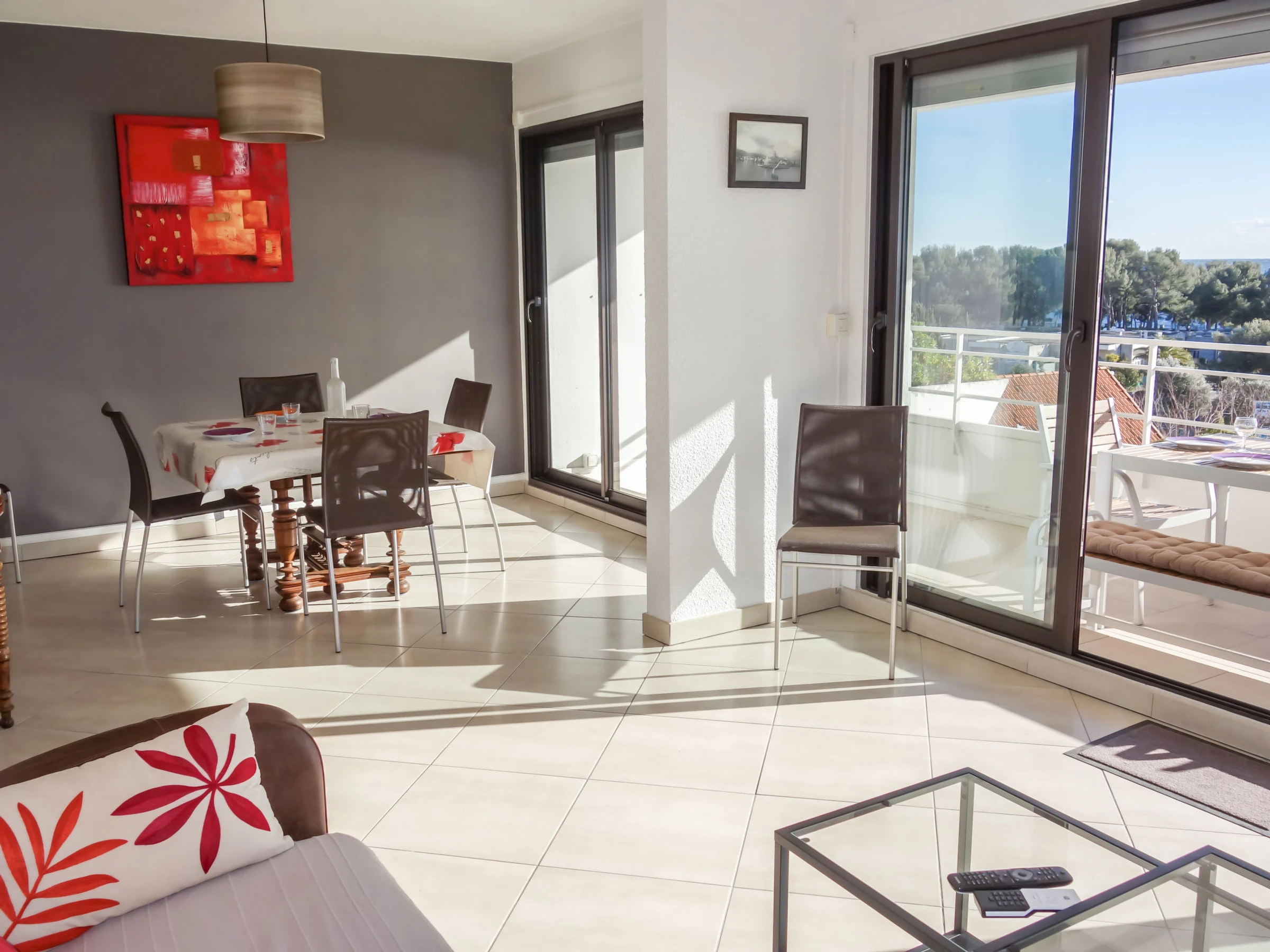 3-room apartment 56 m2 on 1st floor. Comfortable and beautiful furnishings: living/dining room with TV (flat screen), air conditioning. Exit to the terrace. 1 room with 2 beds (90 cm, length 190 cm), TV. 1 small room, window onto the living room with 1 french bed (140 cm, length 190 cm). Open kitchen (oven, dishwasher, 4 induction hot plates, toaster, kettle, microwave, freezer, electric coffee machine, Capsules for coffee machine (SENSEO) extra). Shower, sep. WC. Forced-air heating. Terrace 16 m2, roofed, south-west facing position. Terrace furniture, electric barbecue. Very beautiful panoramic view of the sea. Facilities: washing machine, iron. Internet (WiFi, free). Parking space n 646. Please note: TV only FR. Smoke alarm. [hidden]