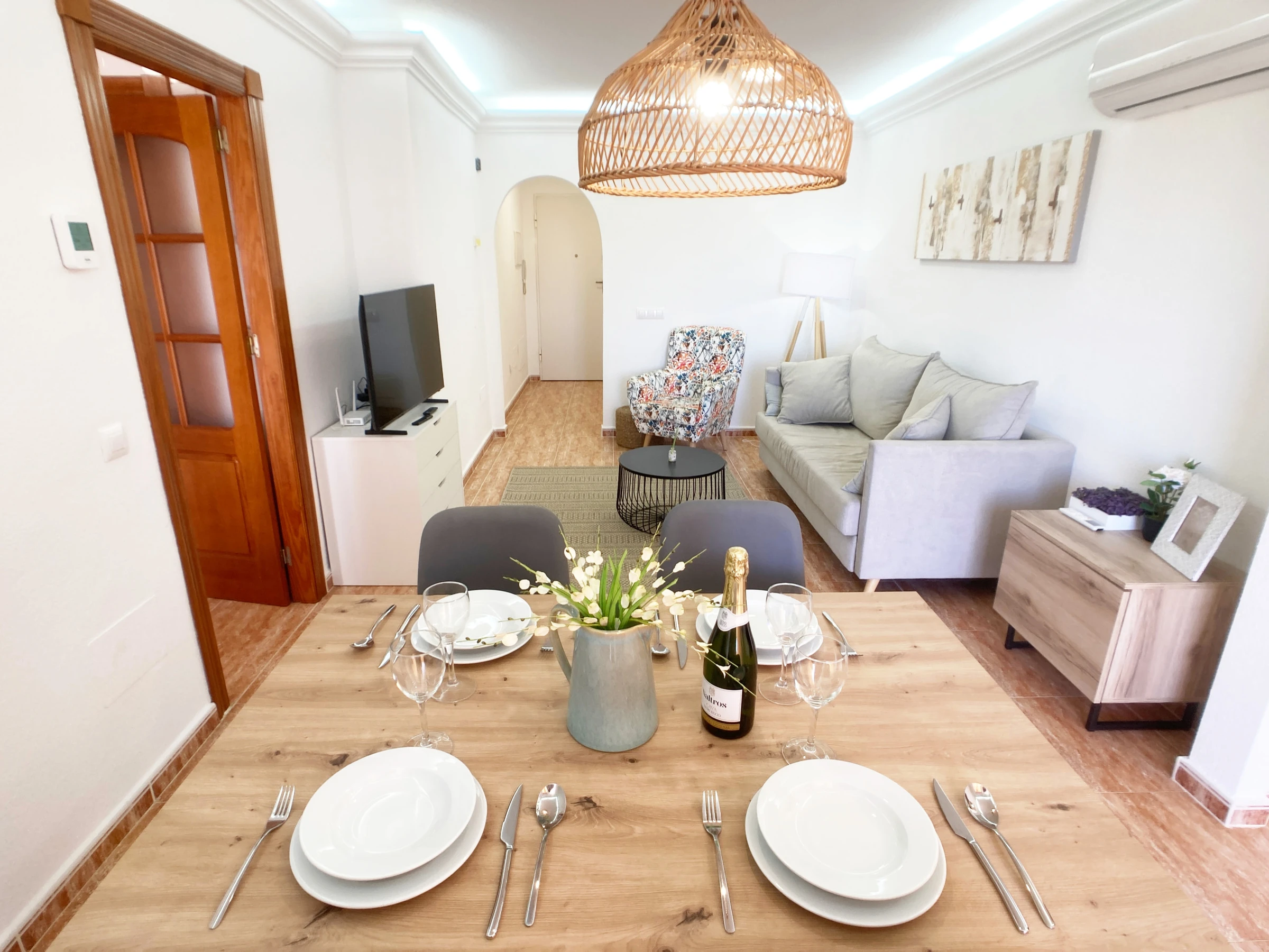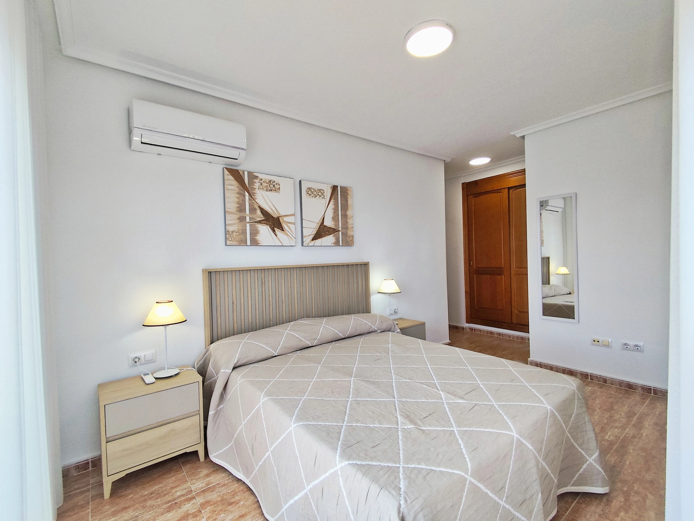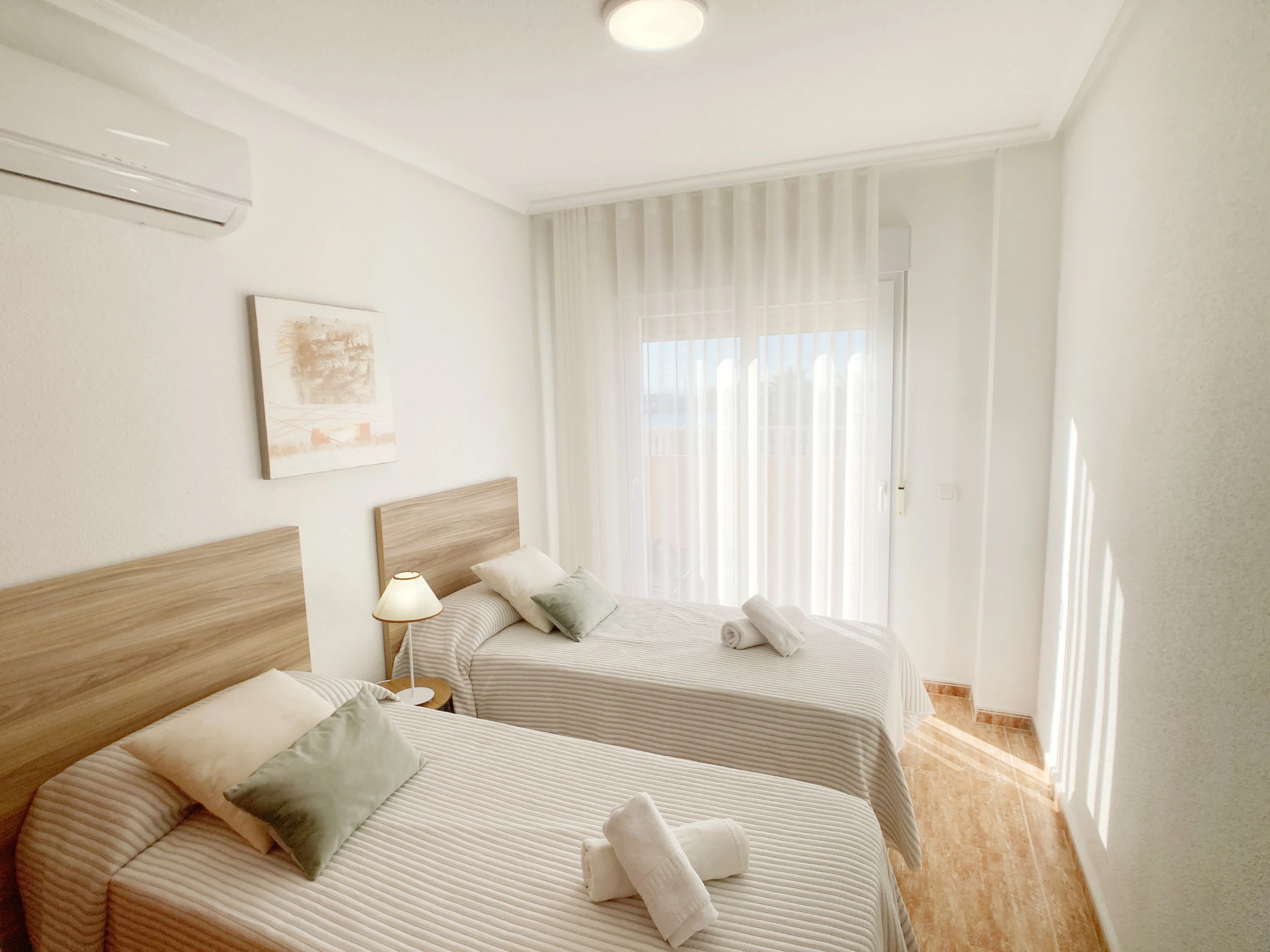 The apartment has WiFi connection and air conditioning units in the living room and bedrooms.