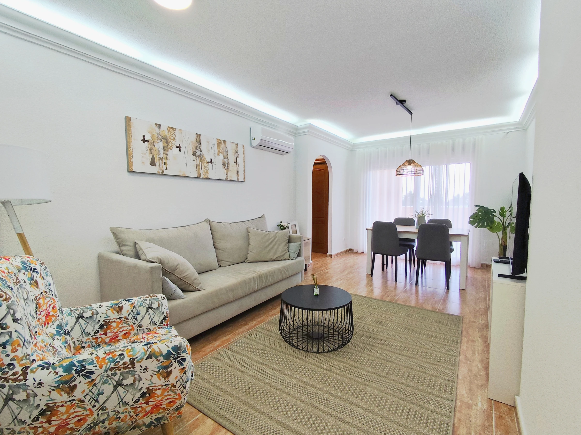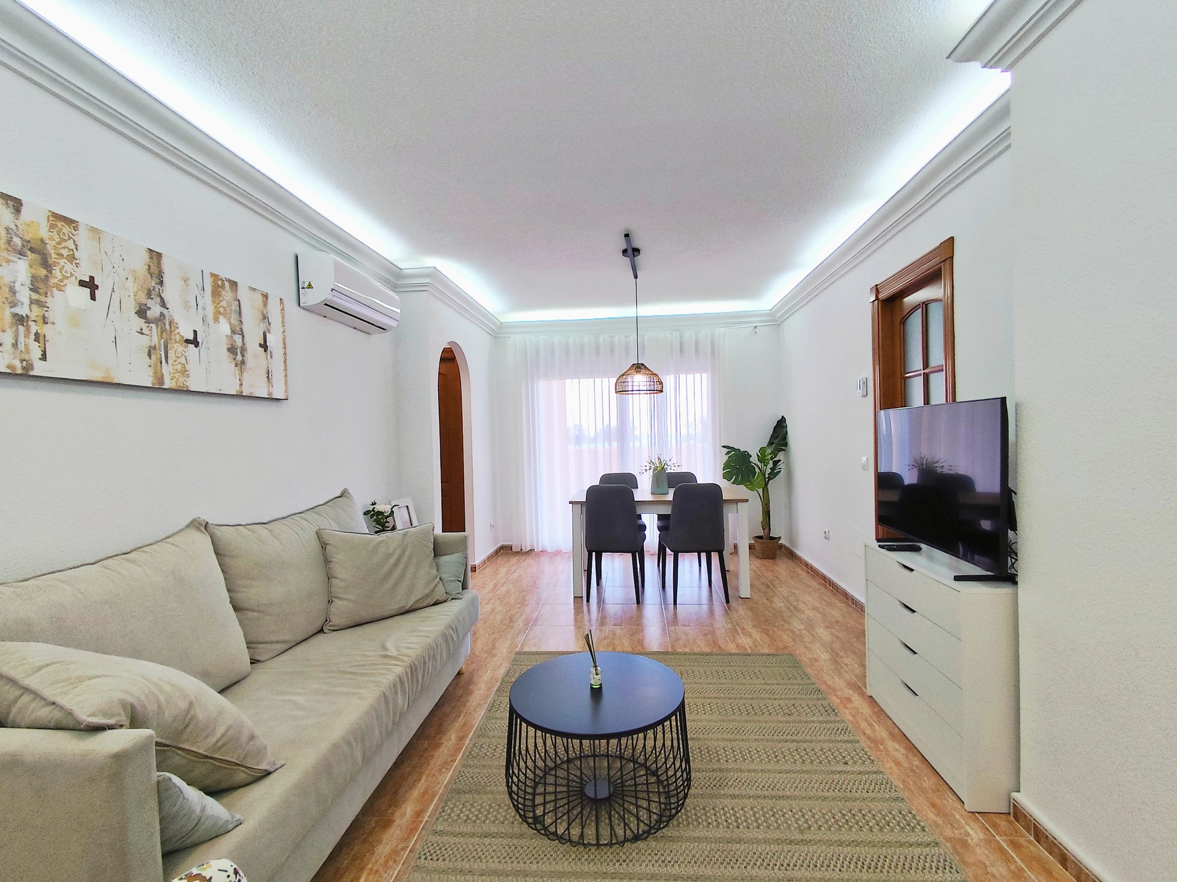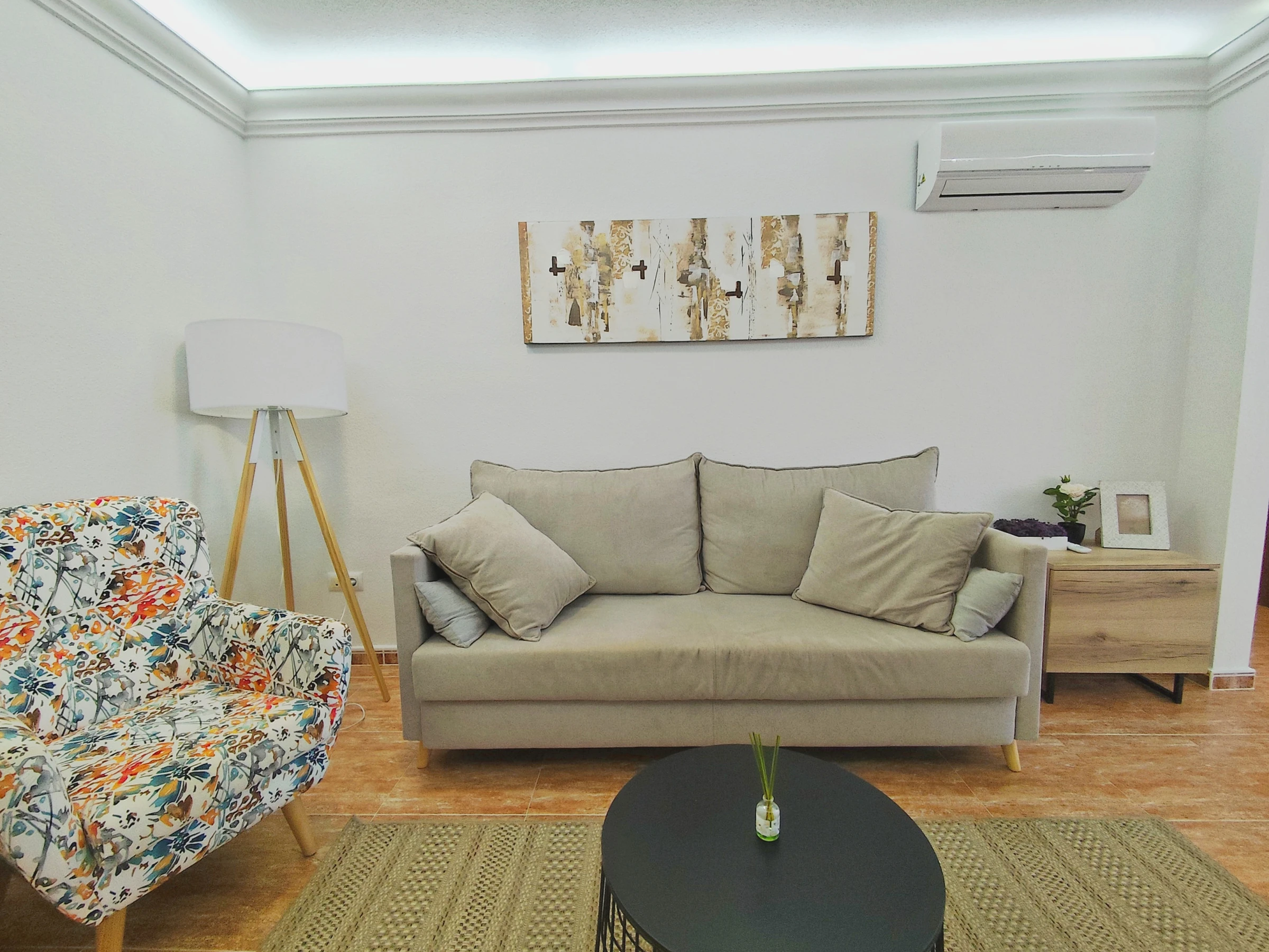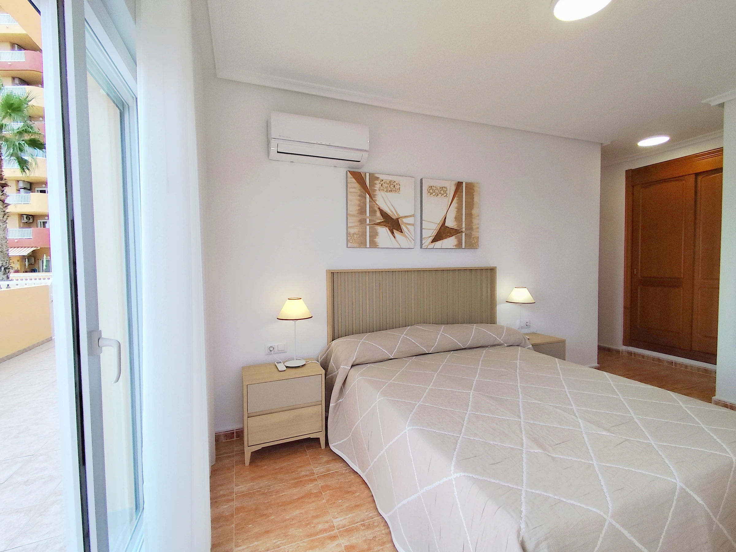 The apartment has WiFi connection and air conditioning units in the living room and bedrooms.