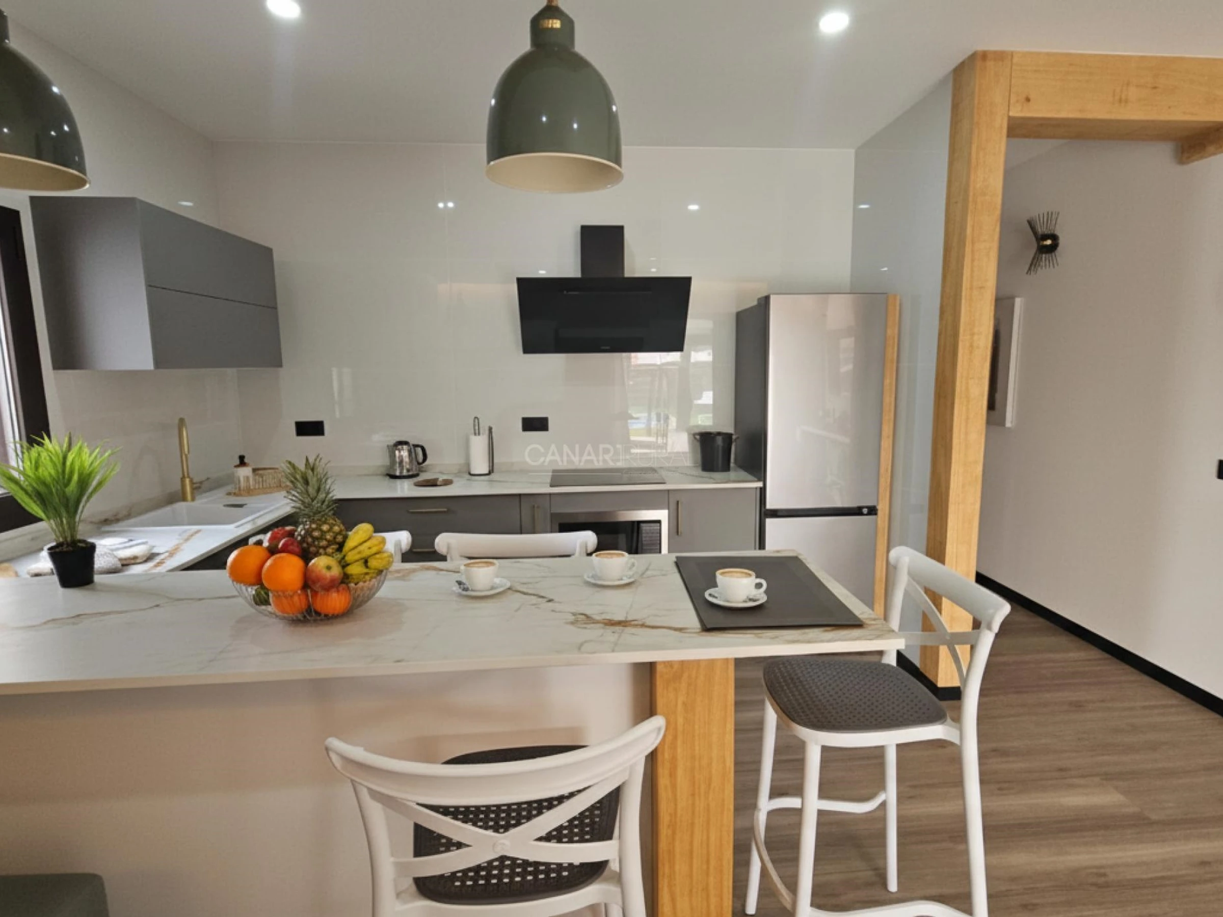 •Kitchen entirely equipped with vitroceramic hobs, washing machine, fridge with freezer, microwave, coffee machine, and kettle.