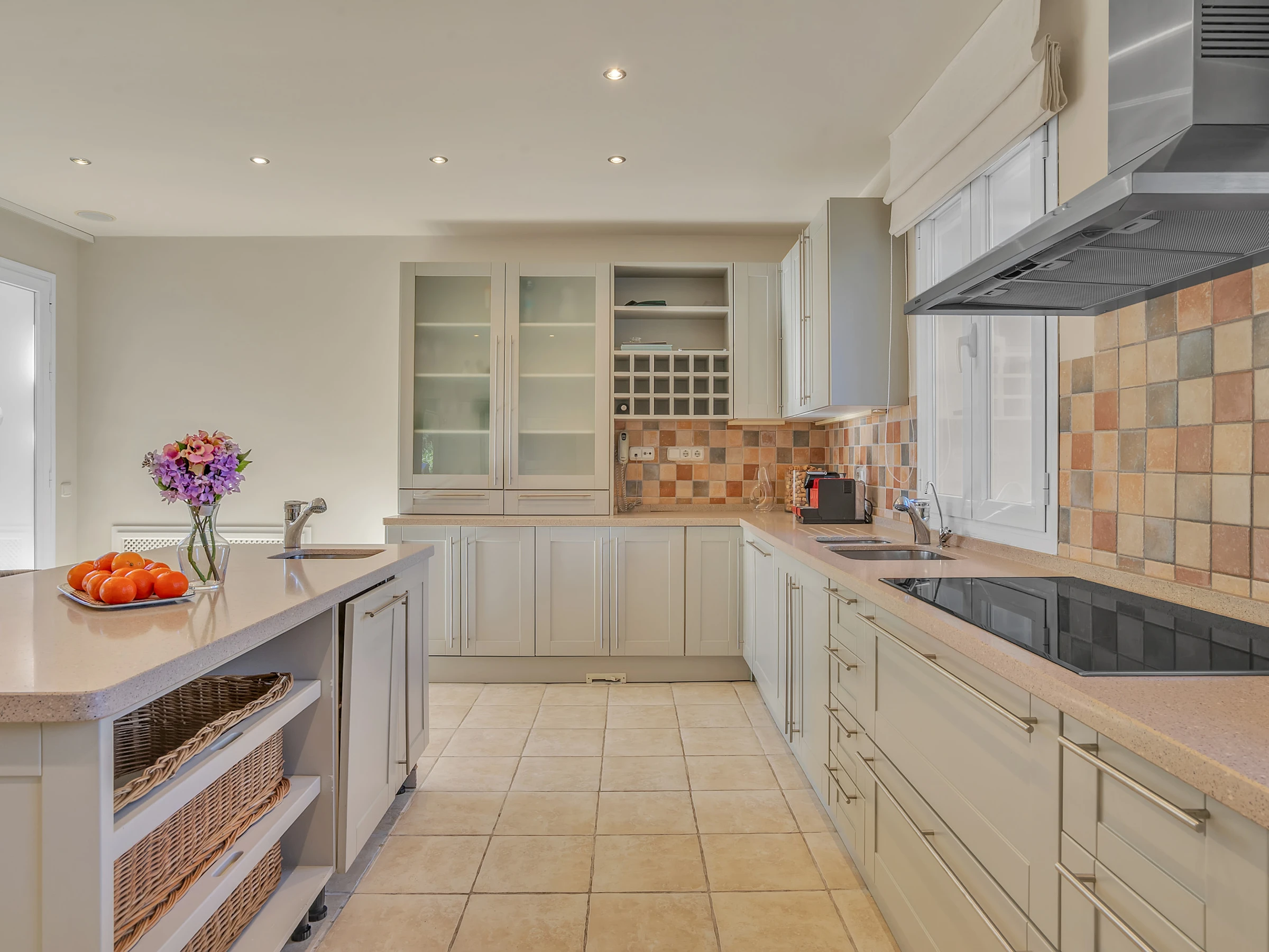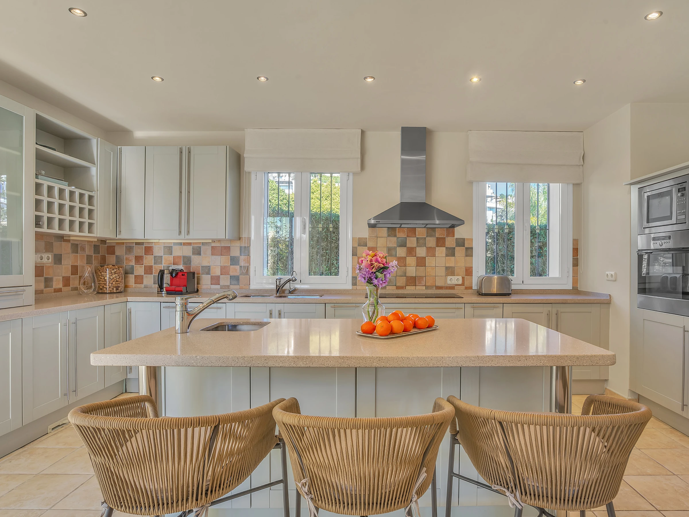 This immaculate, south-facing five-bedroom villa is distributed across three levels. Upon entering the main floor, guests are greeted by an impressive entrance hall showcasing a sweeping staircase, an elegant chandelier, and a Renaissance-inspired domed ceiling. The space flows seamlessly into a bright and expansive living and dining area, enhanced by a cosy fireplace—ideal for relaxed evenings. Adjacent is a more informal sitting room with HD television, which leads into a sleek, fully equipped kitchen featuring a central island. A guest cloakroom is conveniently located near the kitchen, and this level also hosts a charming guest bedroom suite.