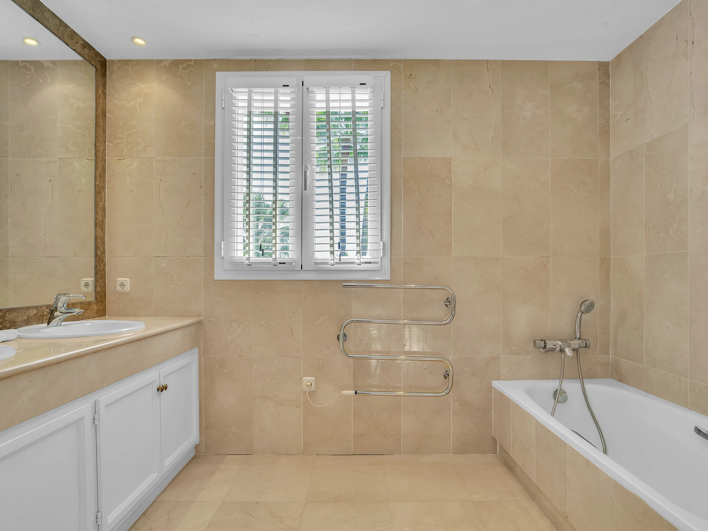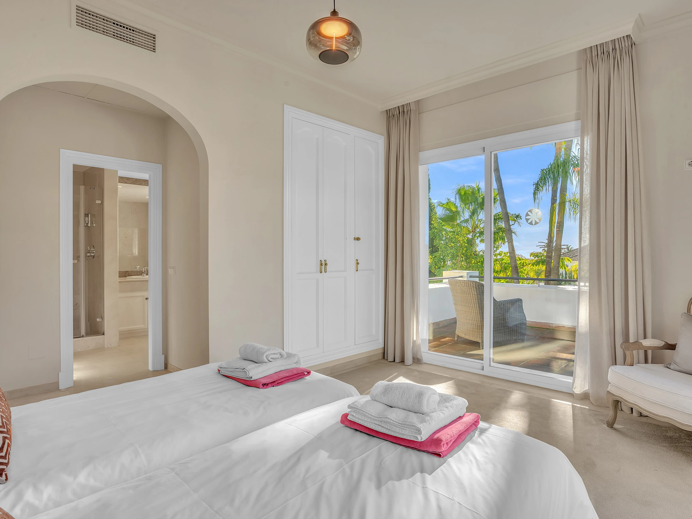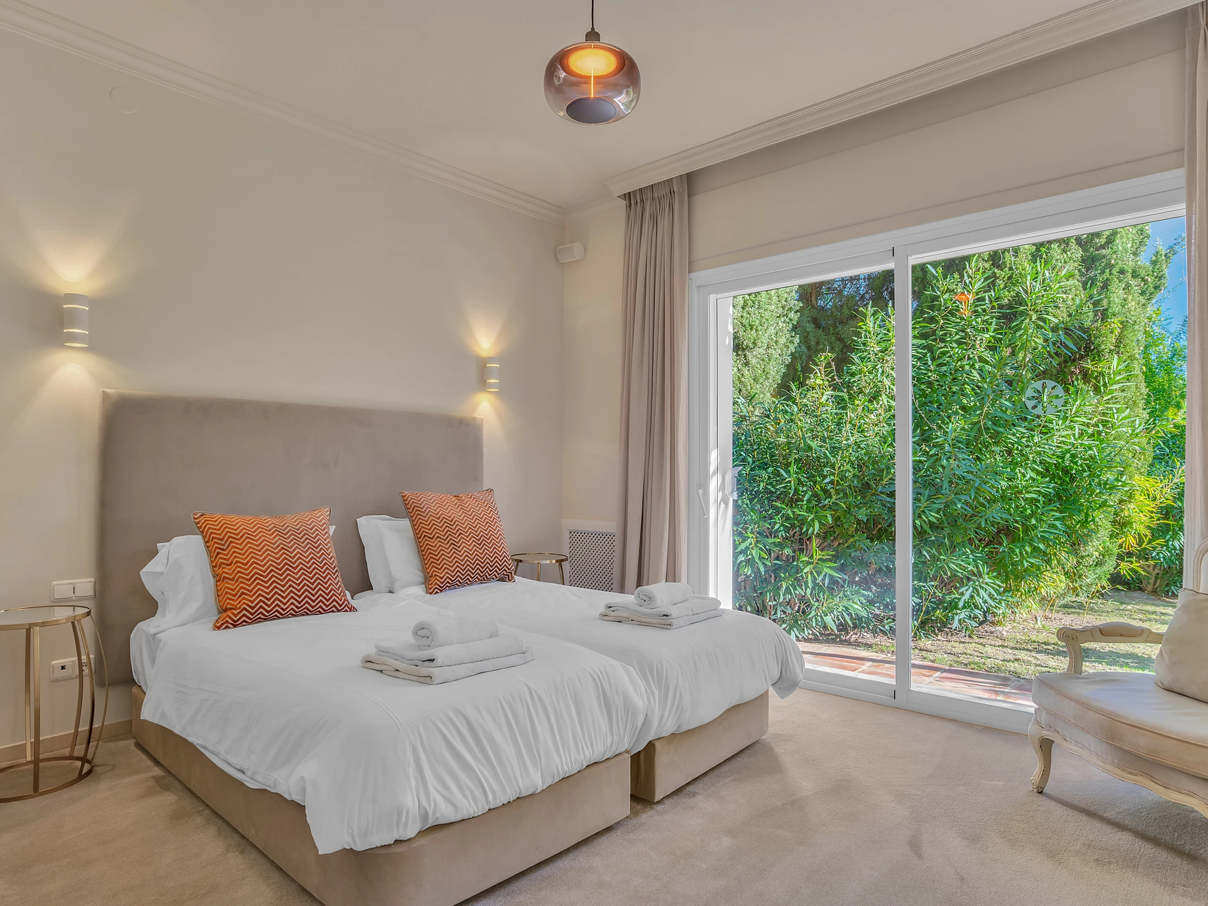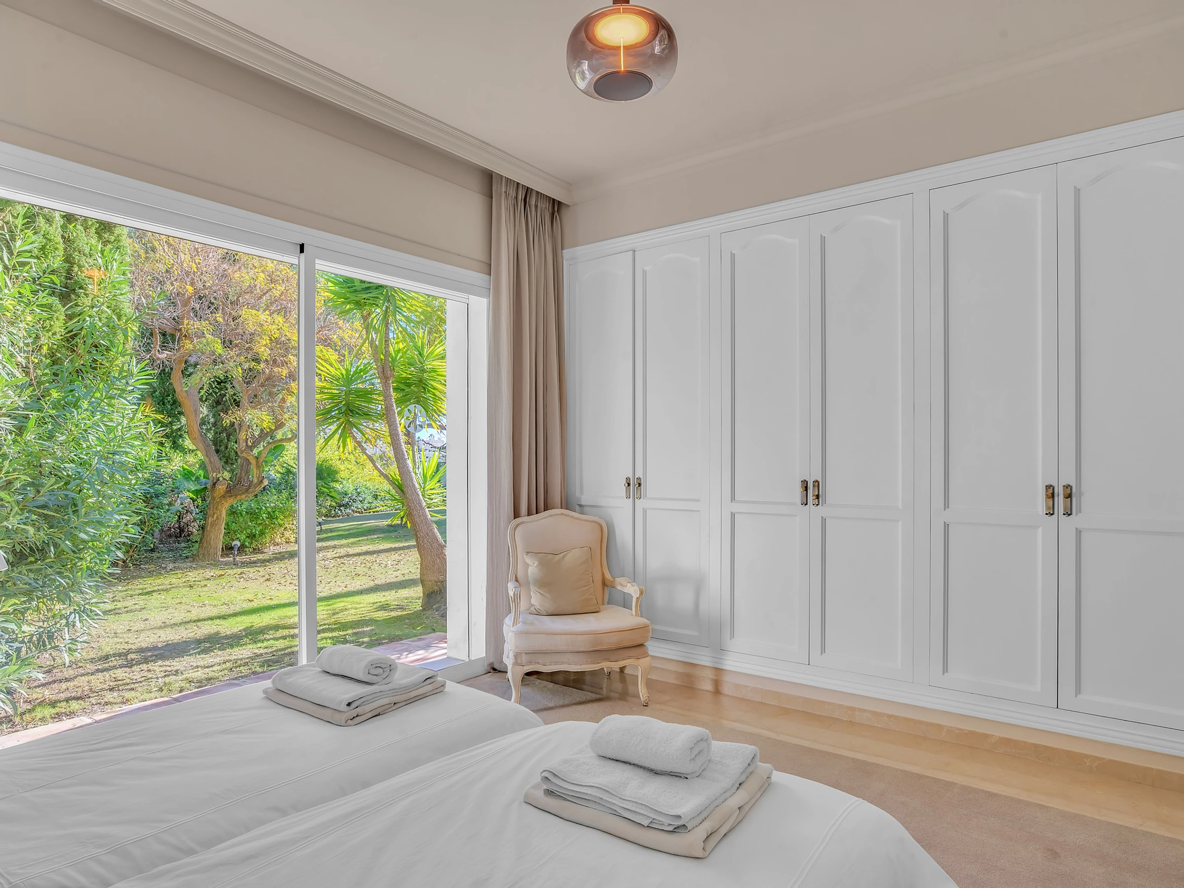 The upper level is dedicated to rest and relaxation. The elegant master suite features a private lounge area, walk-in wardrobe, and a luxurious bathroom complete with jacuzzi and separate shower. The suite opens onto a south-facing terrace overlooking the gardens. Two additional en-suite guest bedrooms are also located on this floor, sharing a sun-drenched terrace.