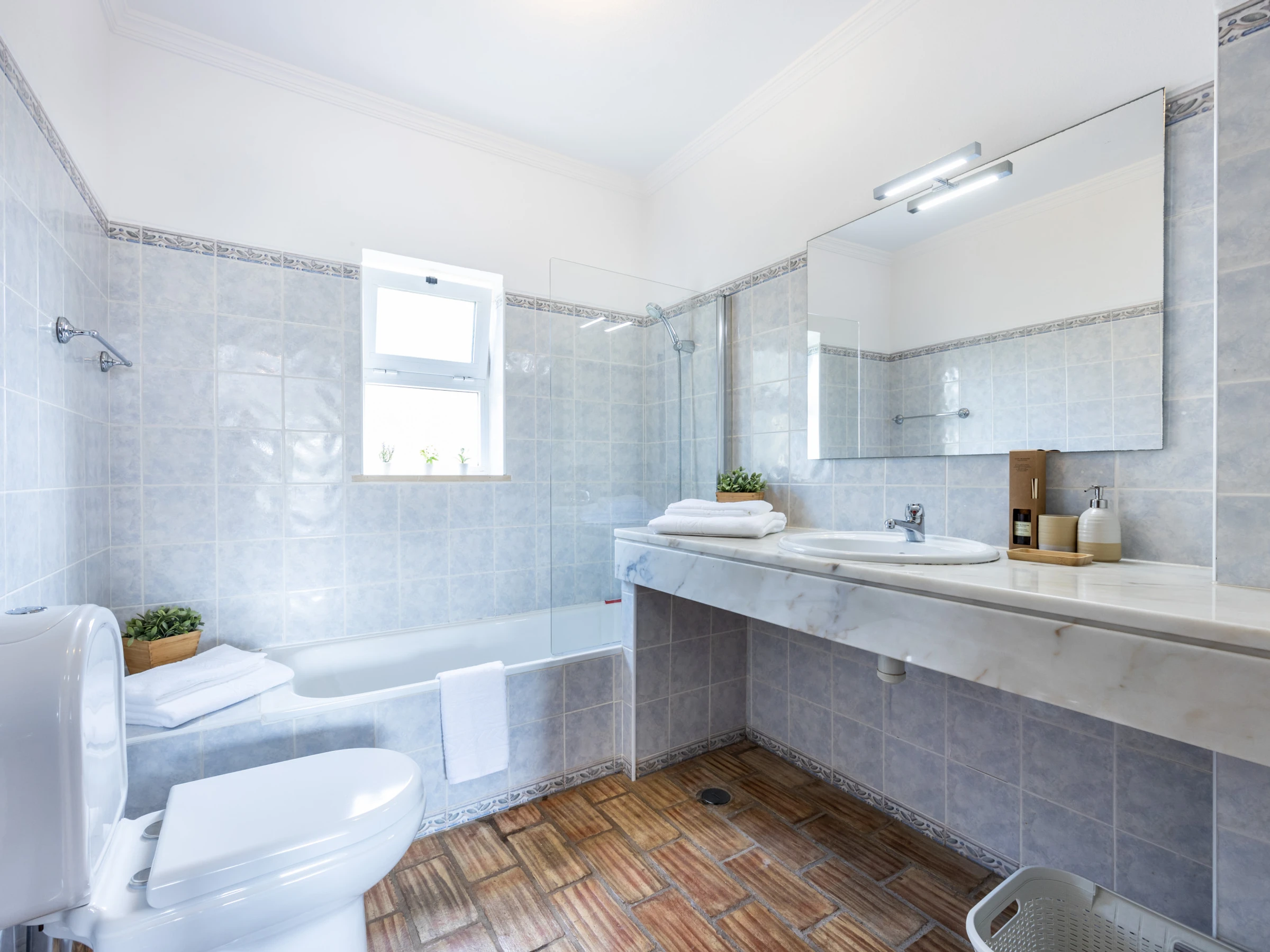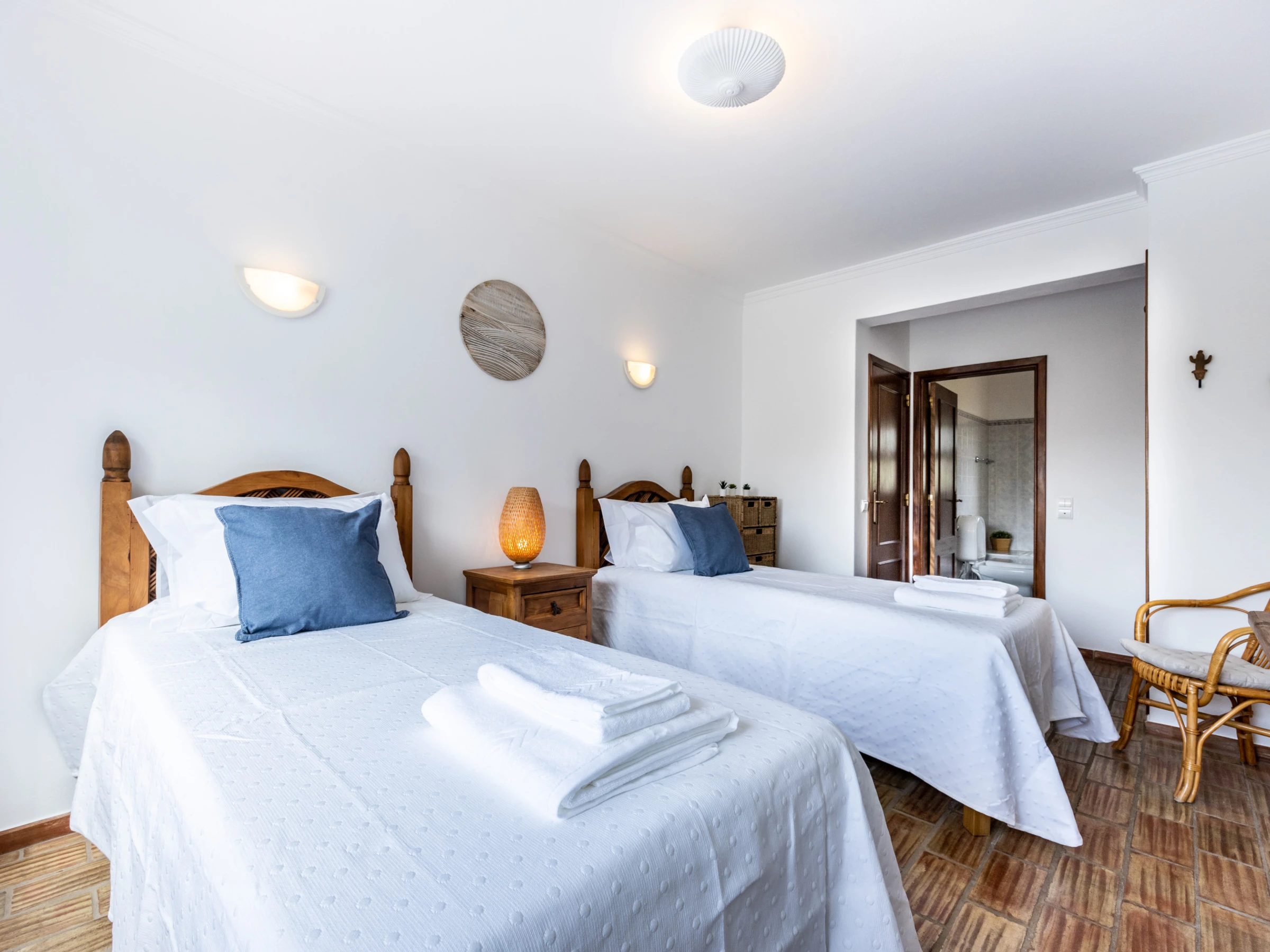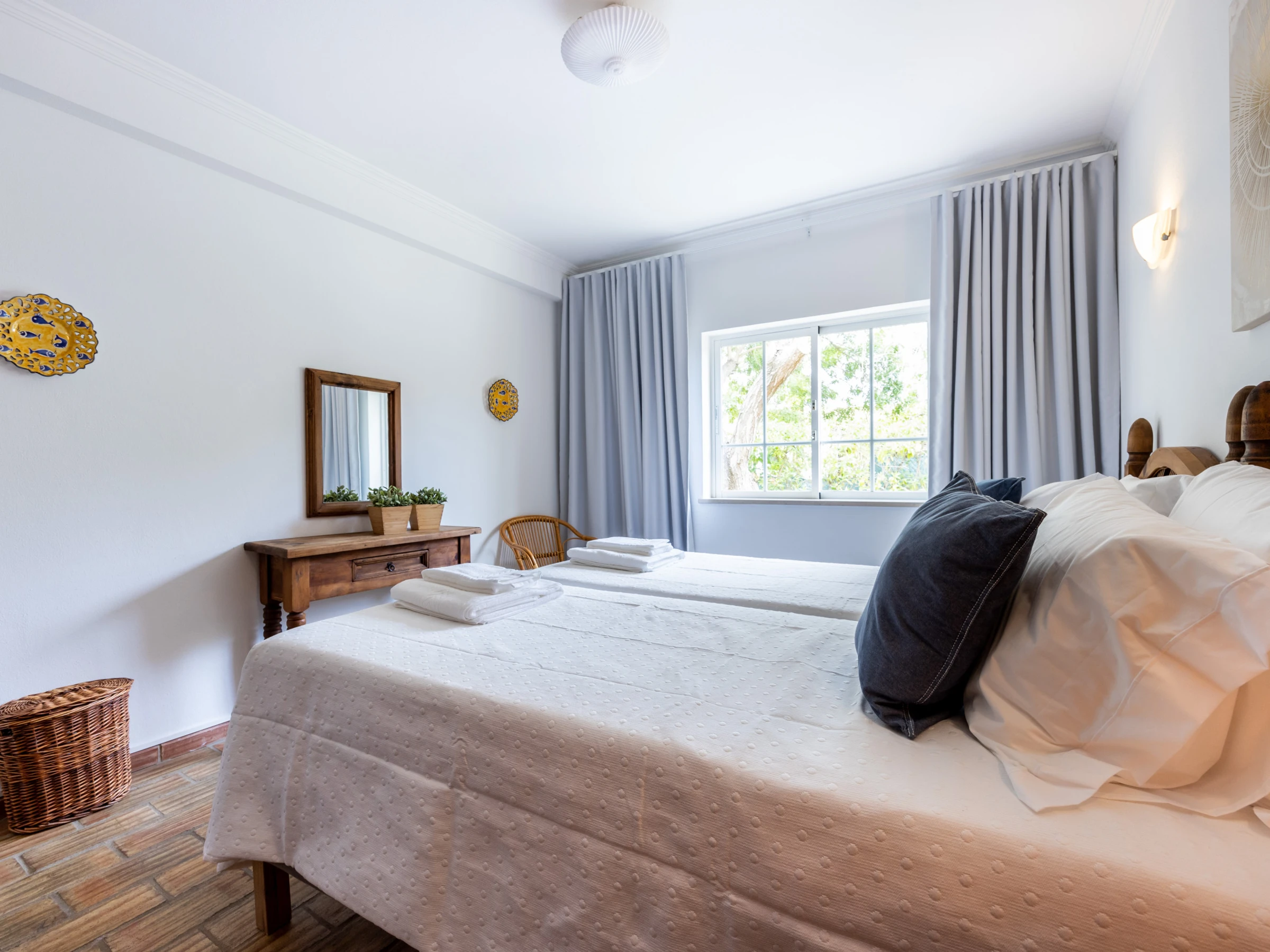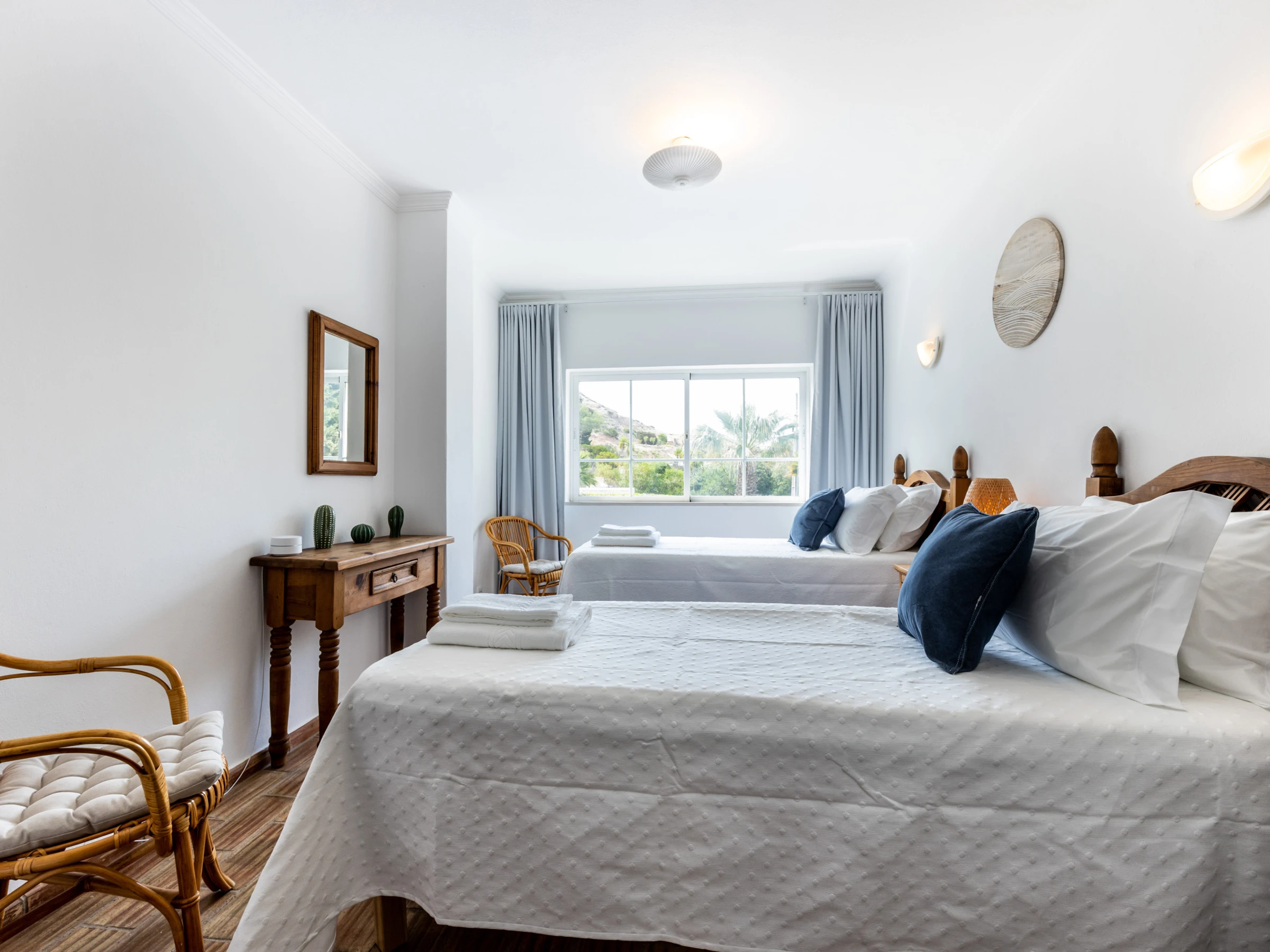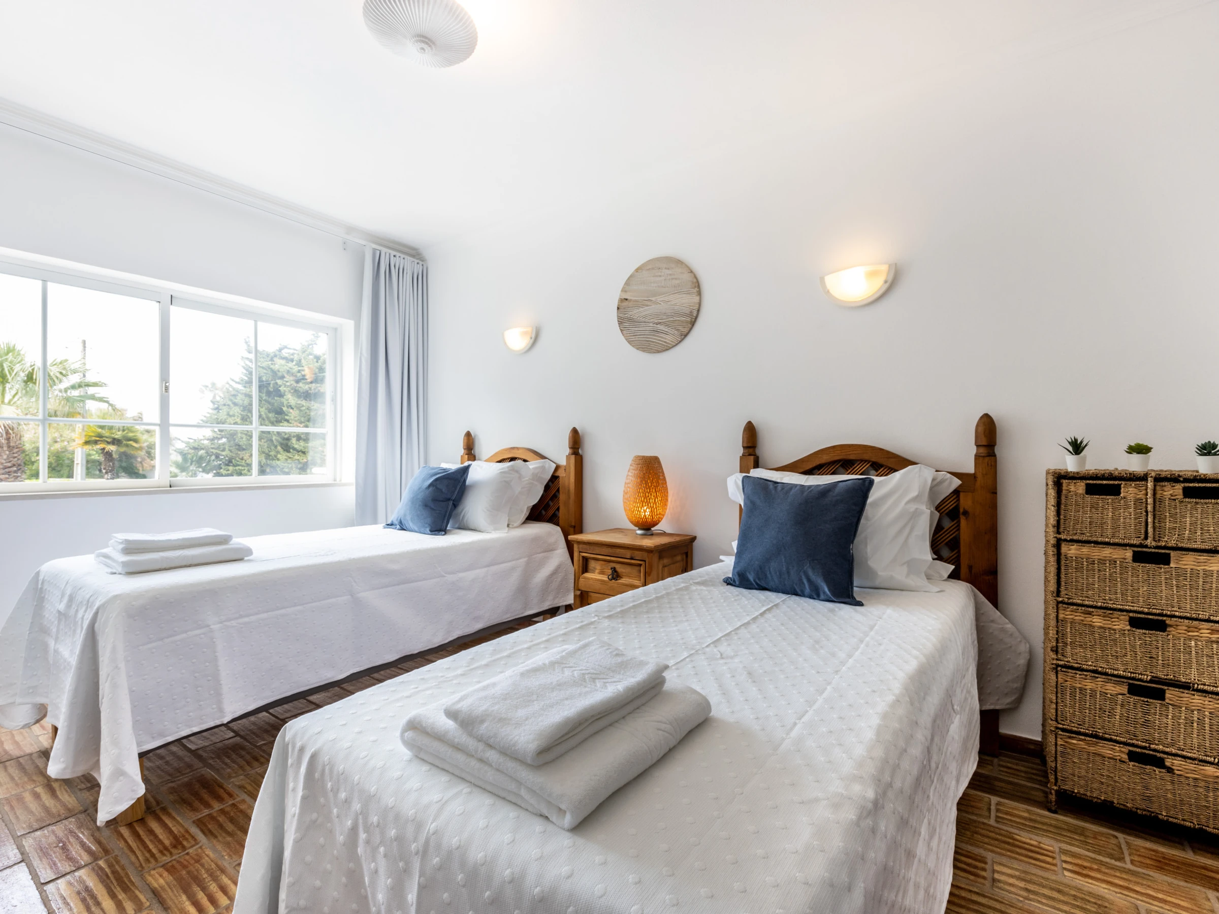 Bedroom 2 with 2 single beds, wardrobe and window with view over the garden and pool area. Private, complete bathroom with bathtub and shower fittings.