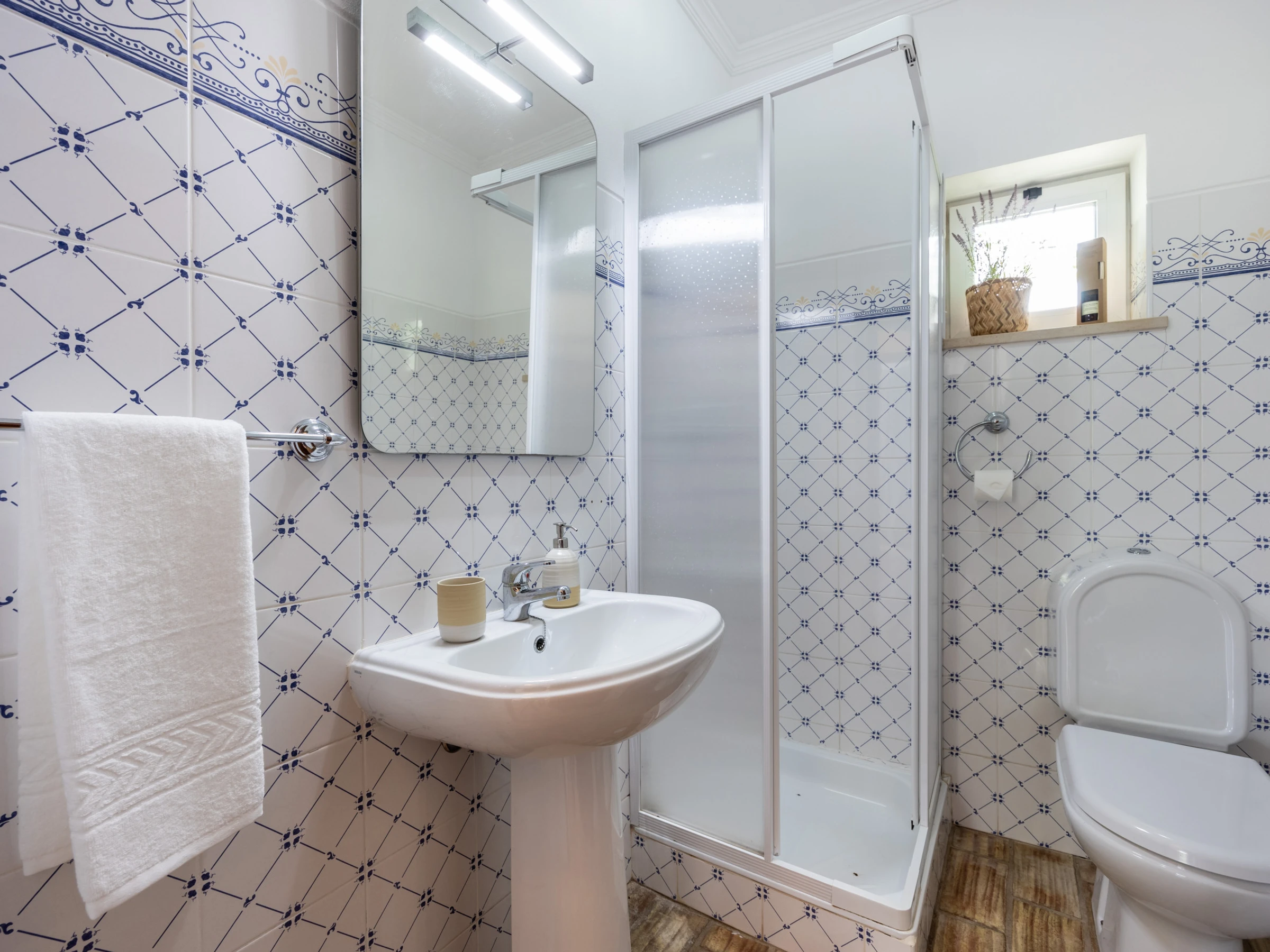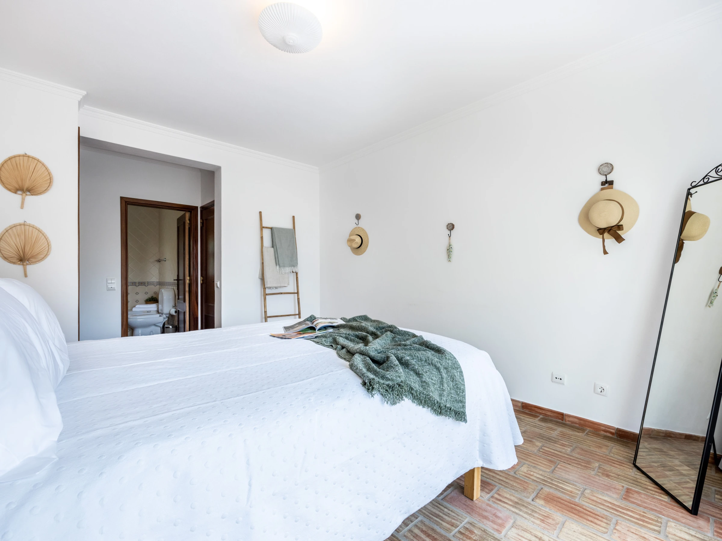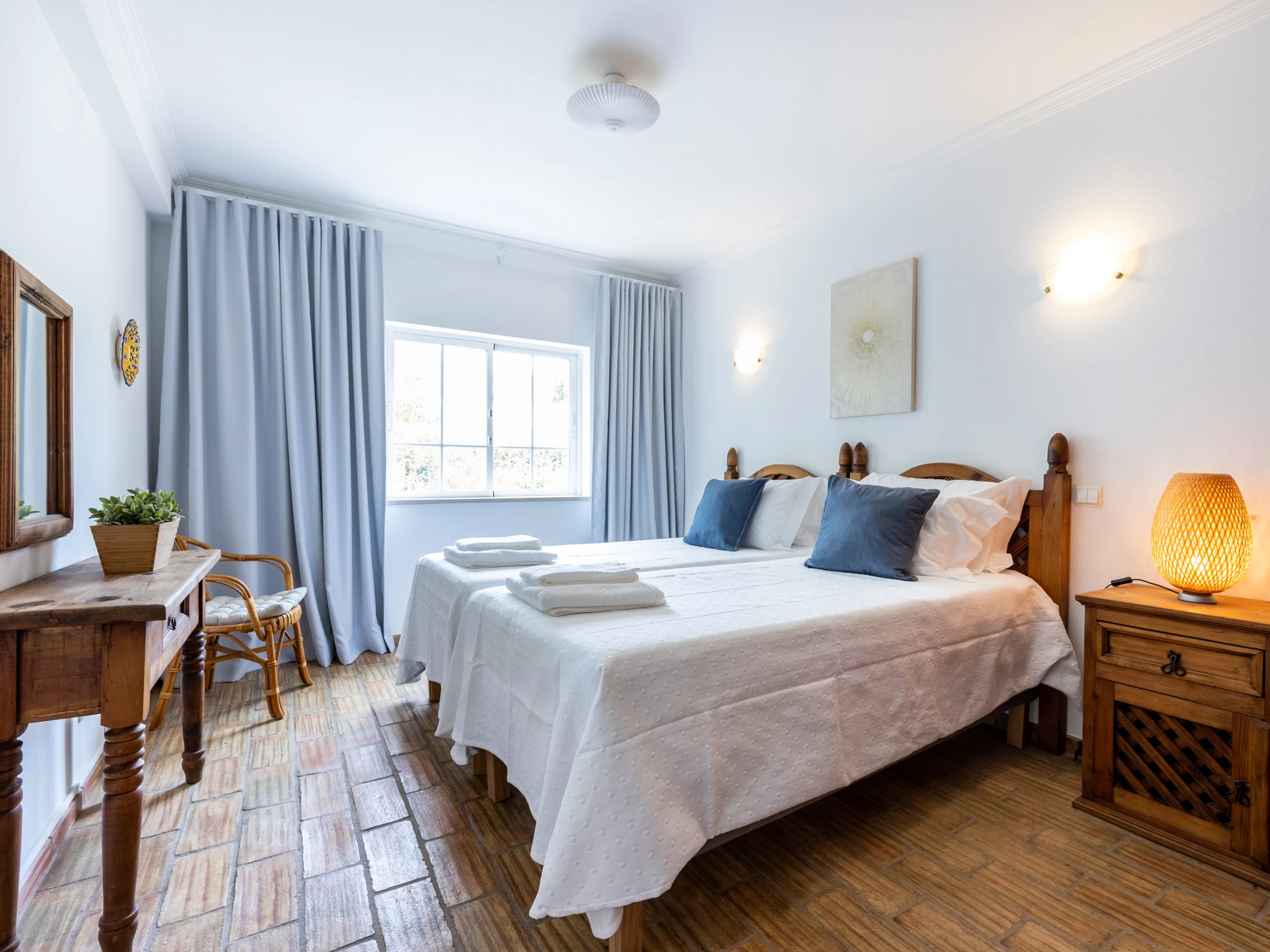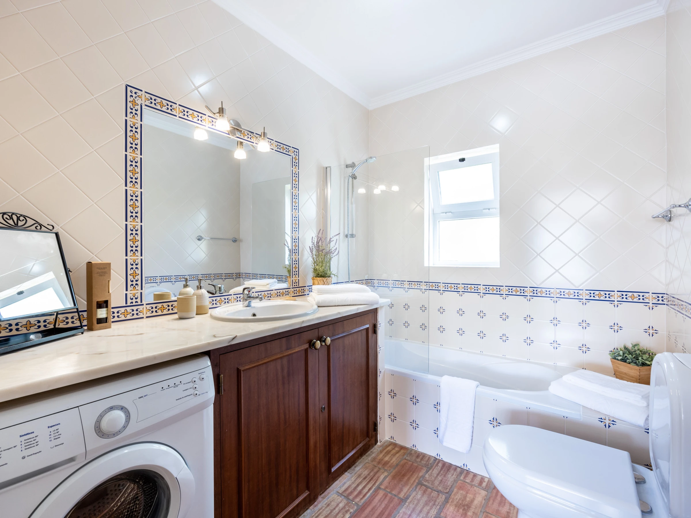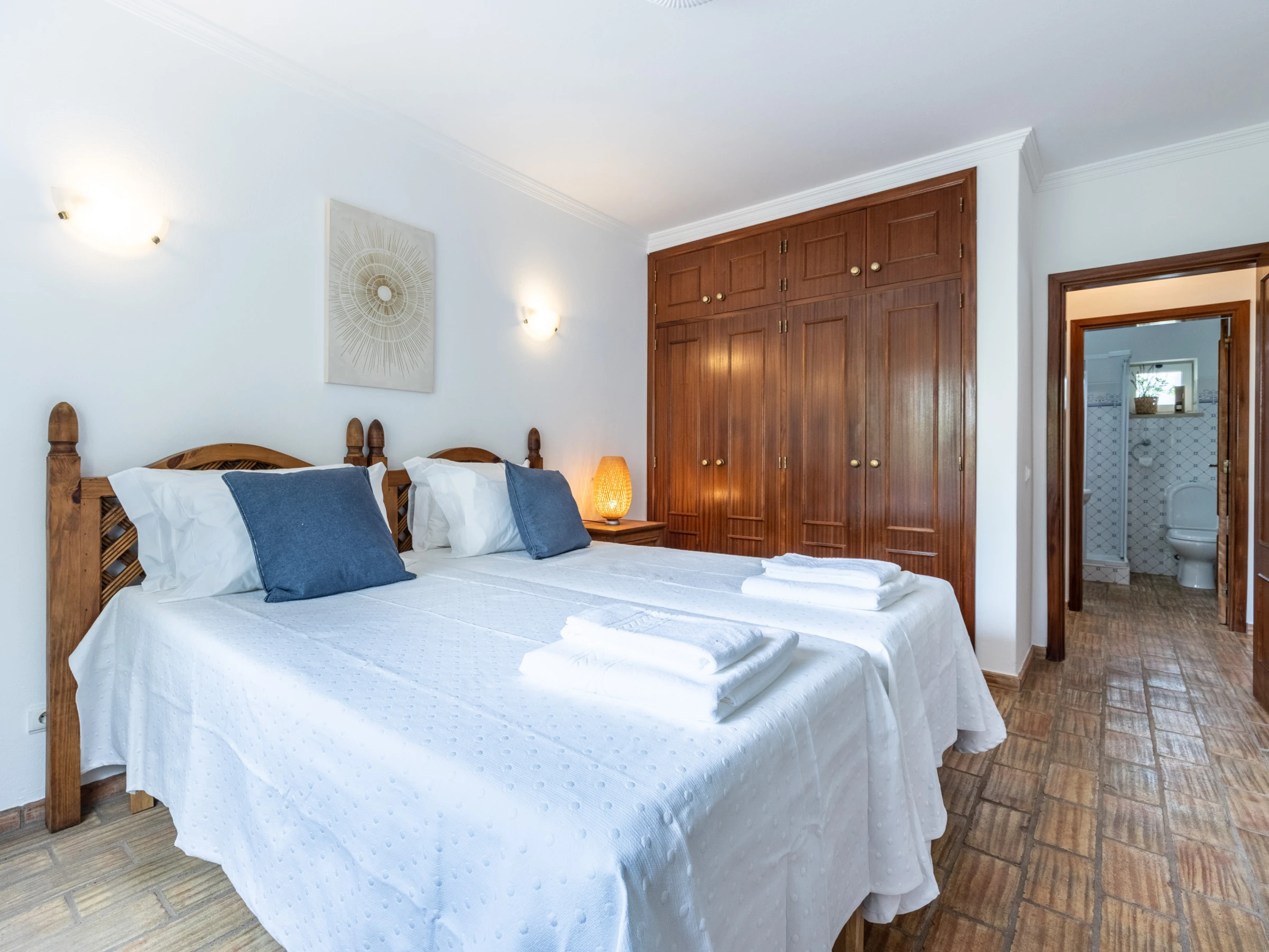 Bedroom 2 with 2 single beds, wardrobe and window with view over the garden and pool area. Private, complete bathroom with bathtub and shower fittings.