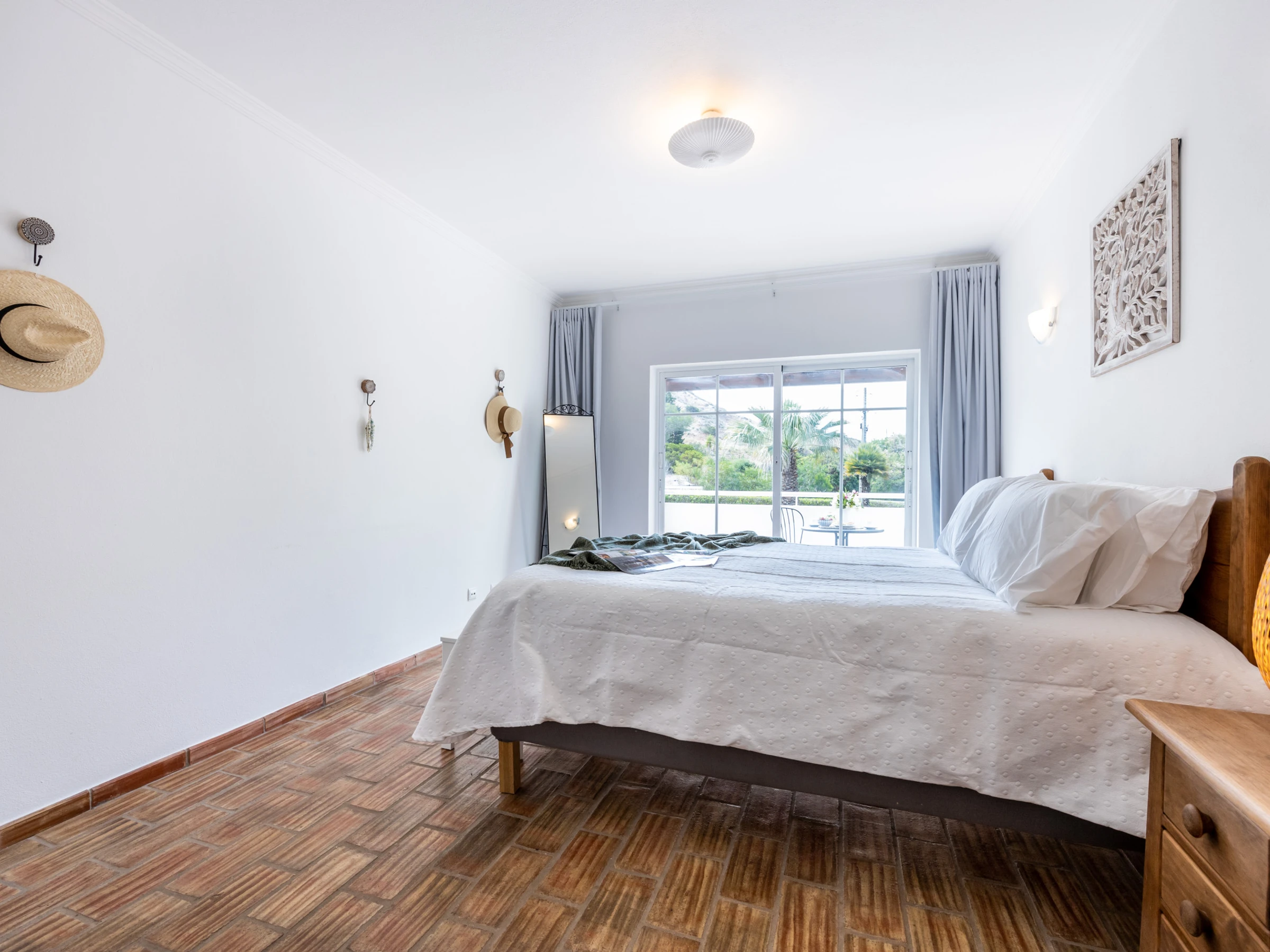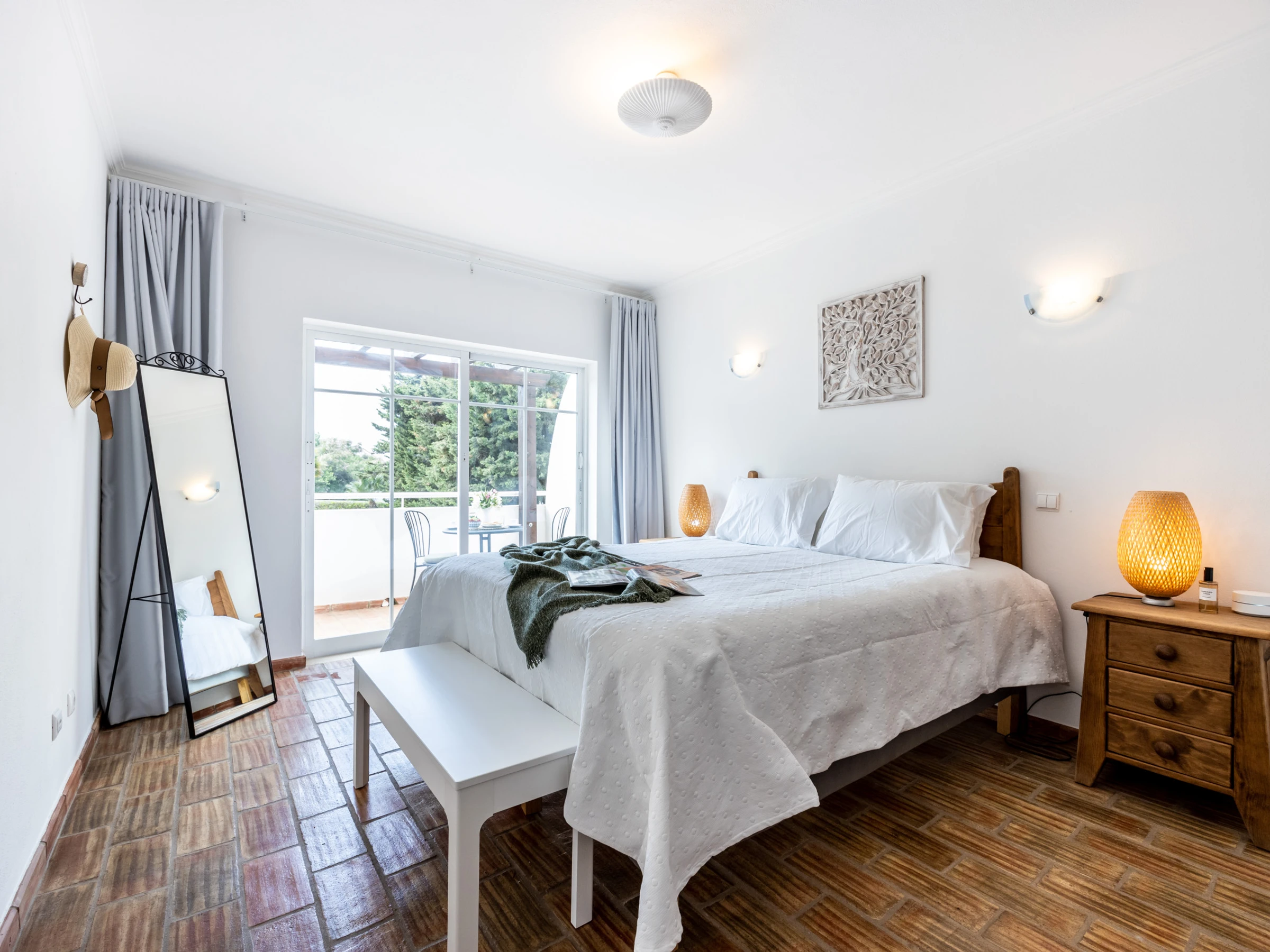 Bedroom 3 with a double bed (160x200), wardrobe and balcony with a view of the condominium garden and pool.