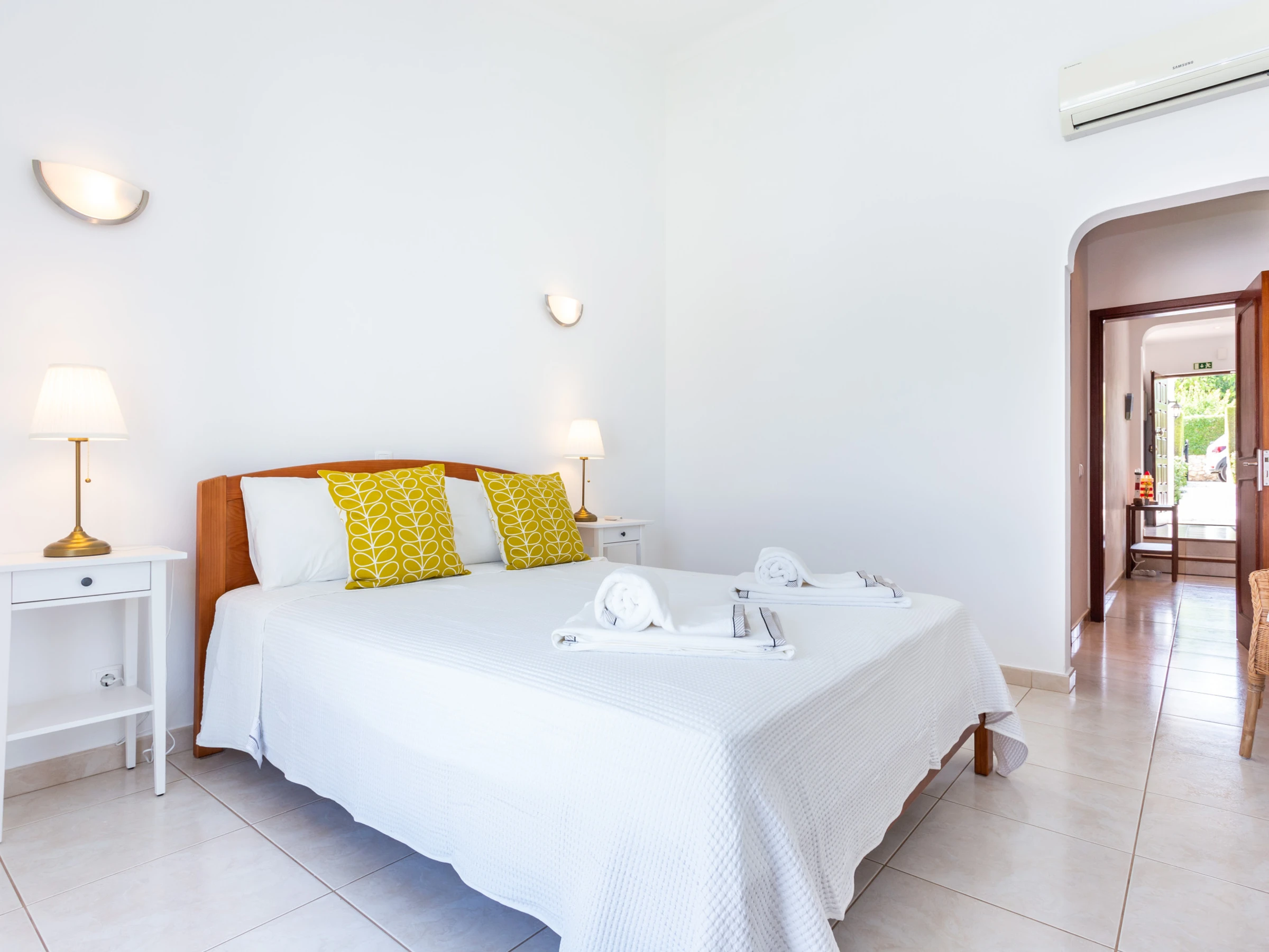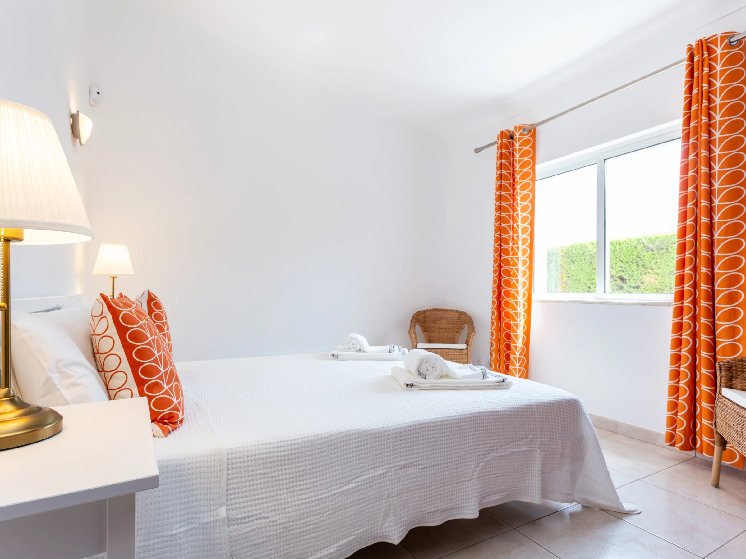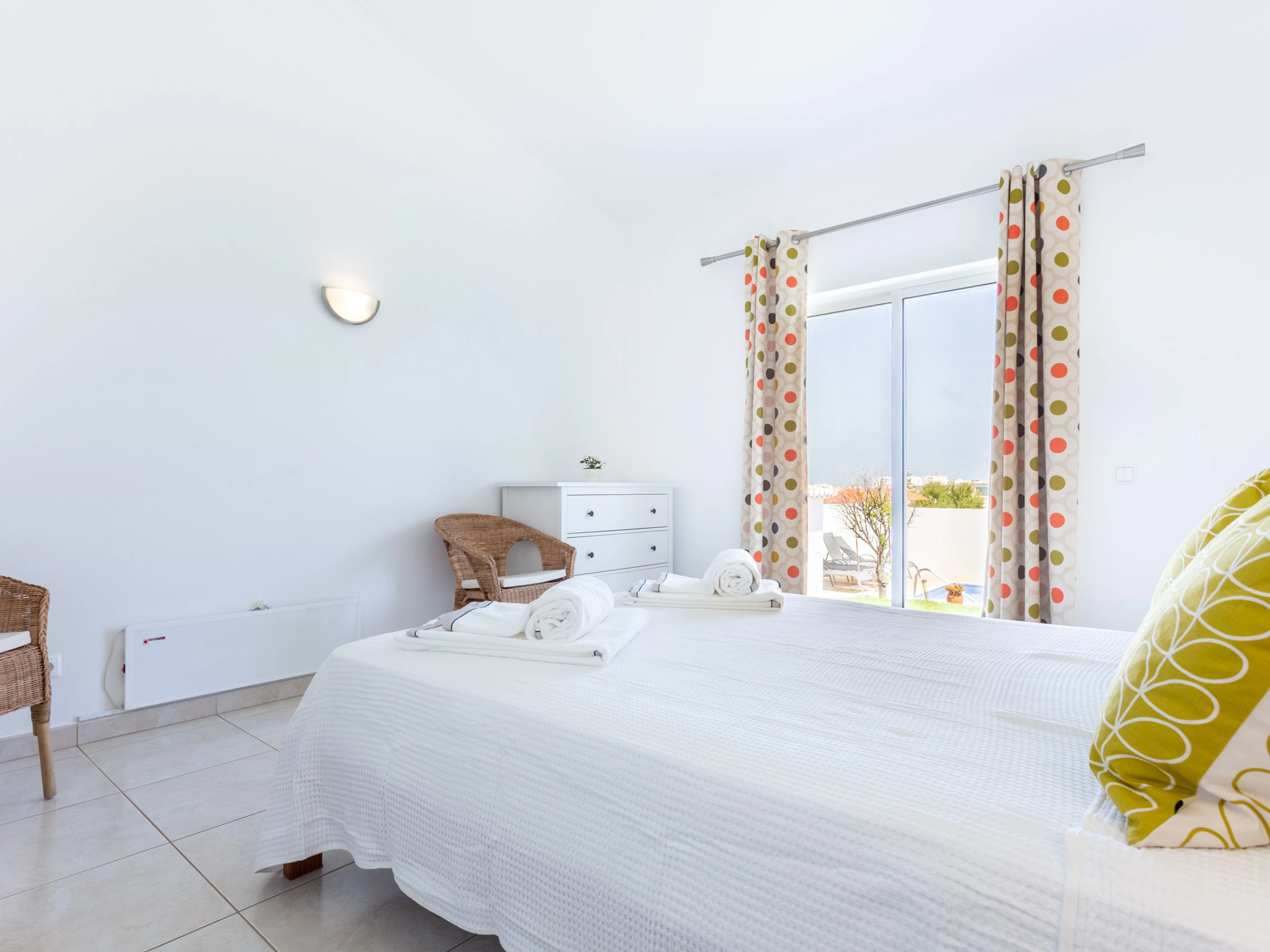 Bed linen and towels are provided, including pool towels.
