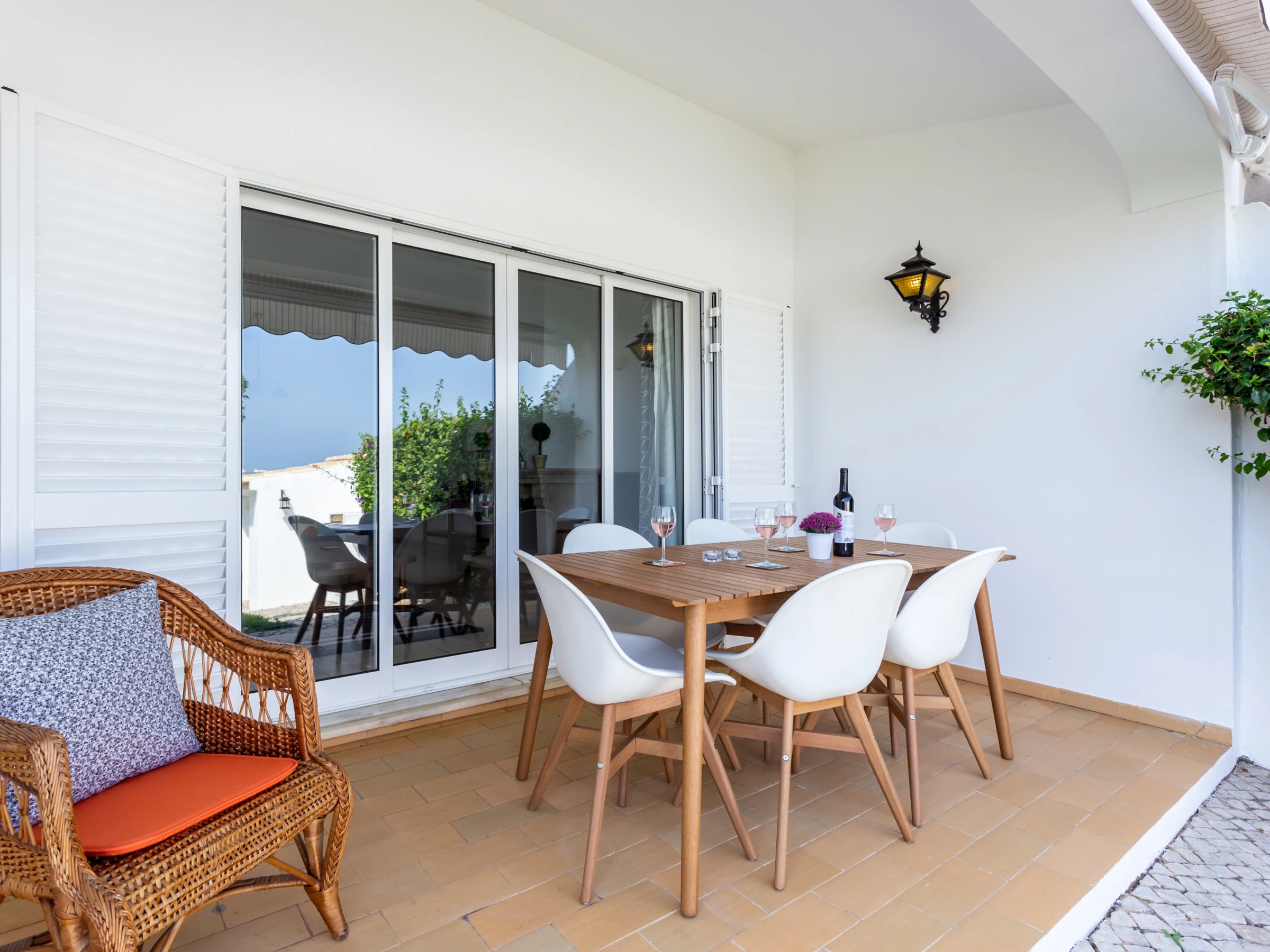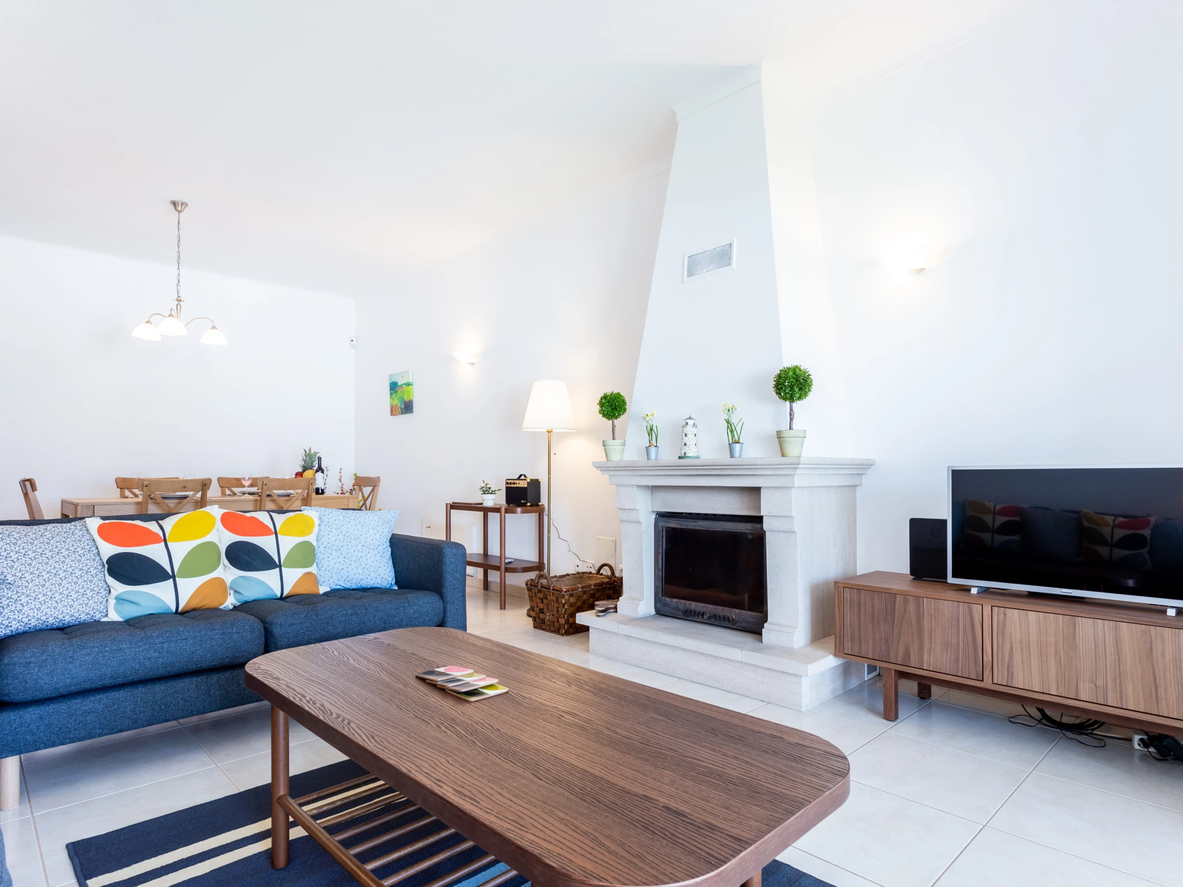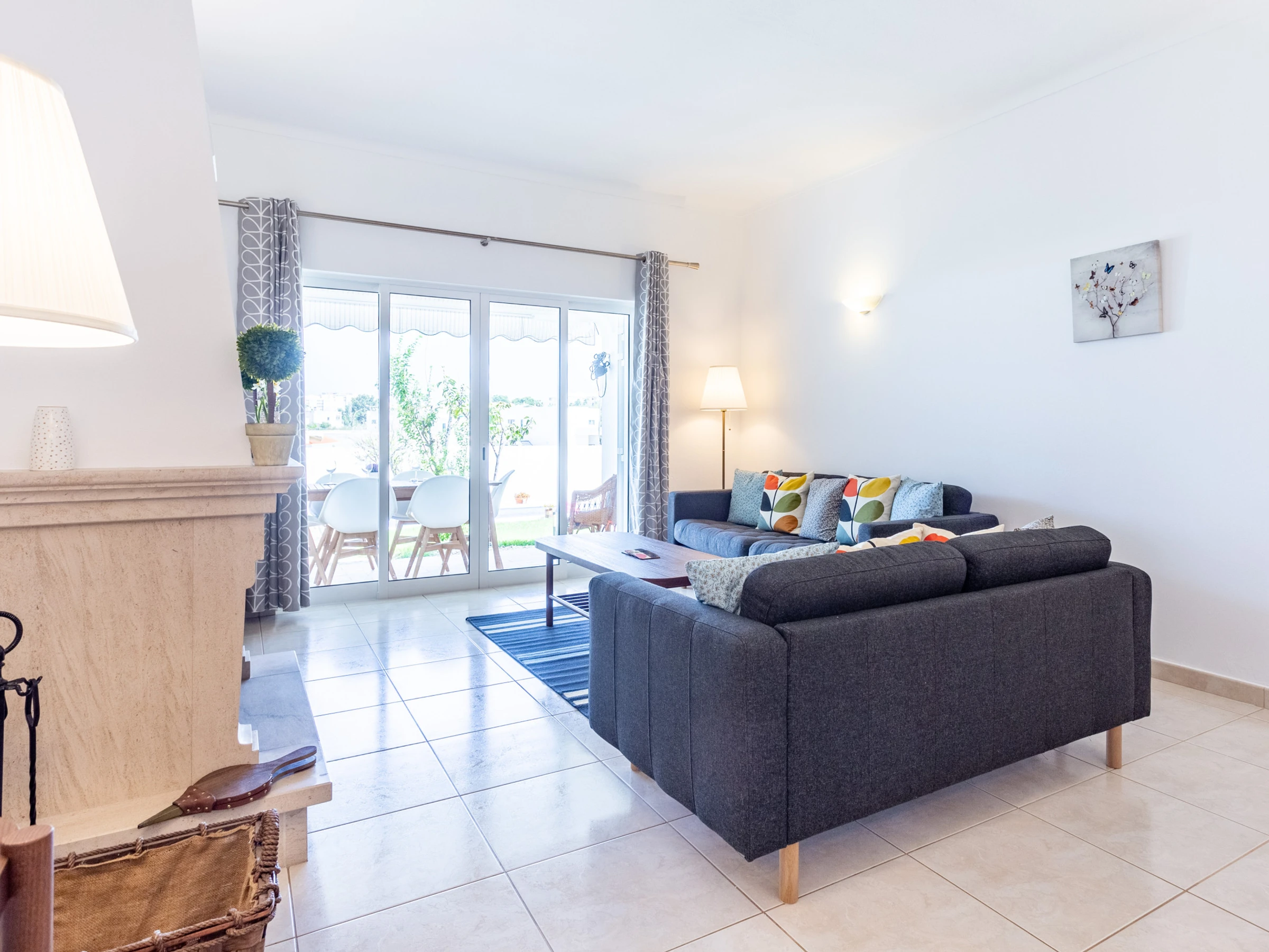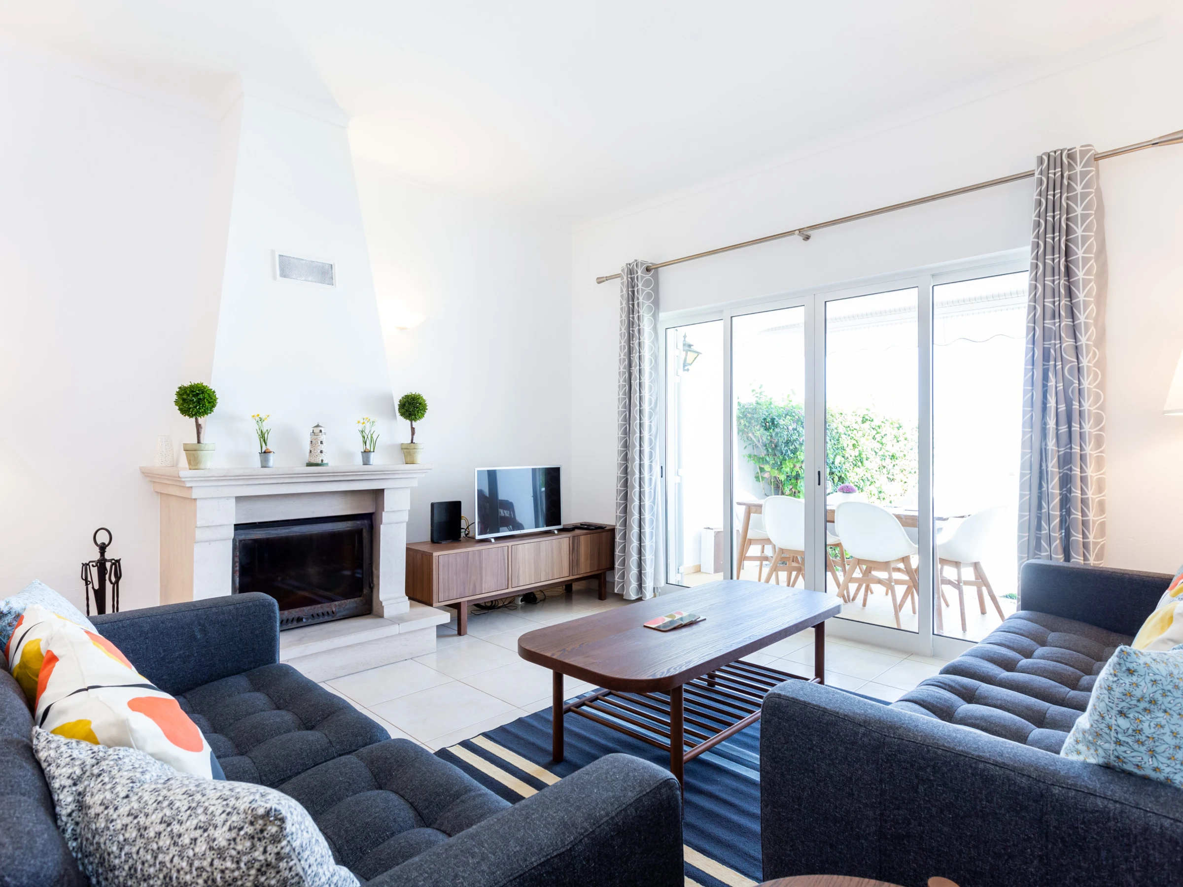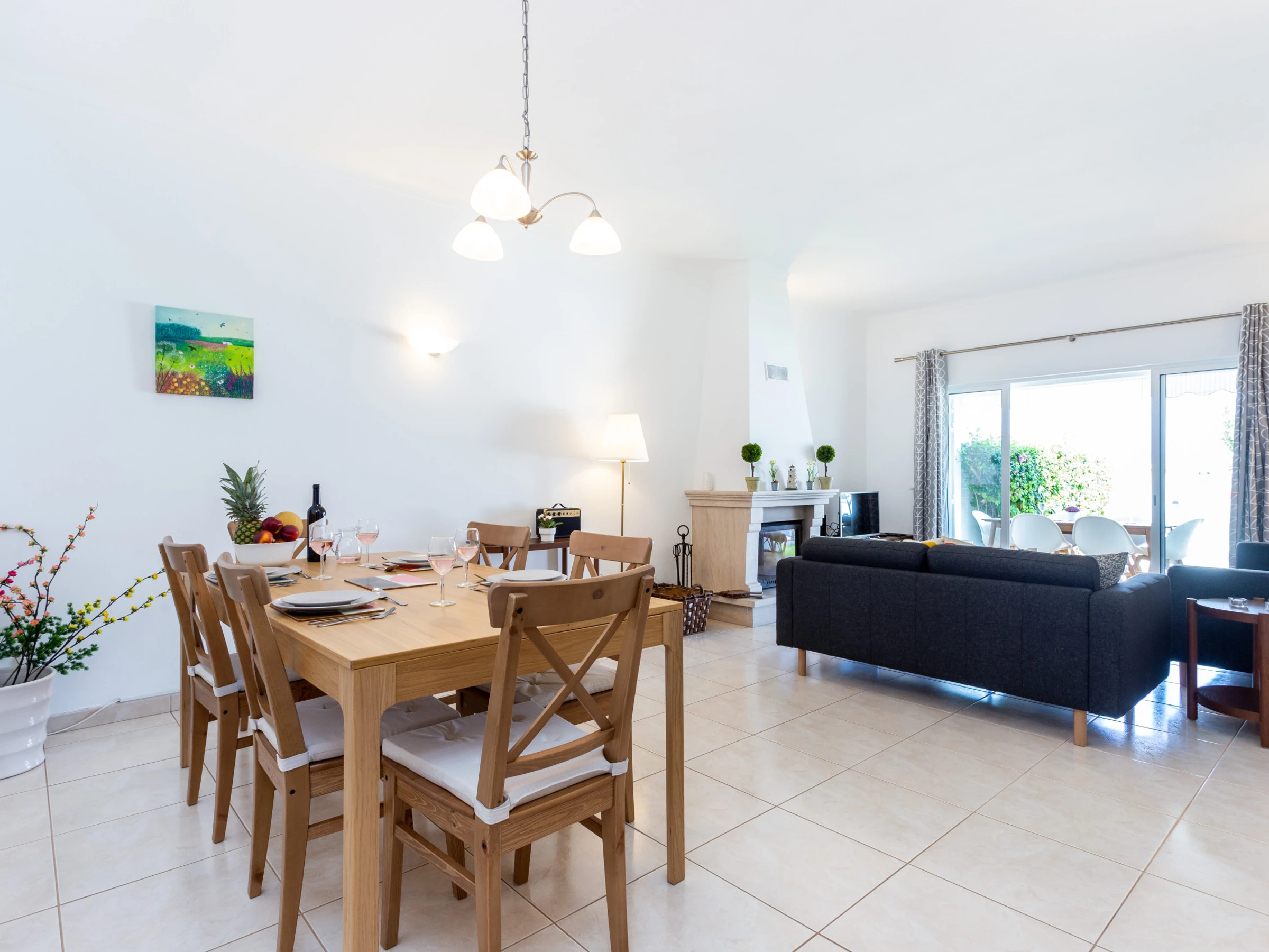 Spacious living room, fireplace with log burning fire and heat recovery, dining area. Smart TV with cable channels and WiFi. Sliding doors open to a partially covered terrace with an extensible awning, with dining table and chairs. Charcoal barbecue.