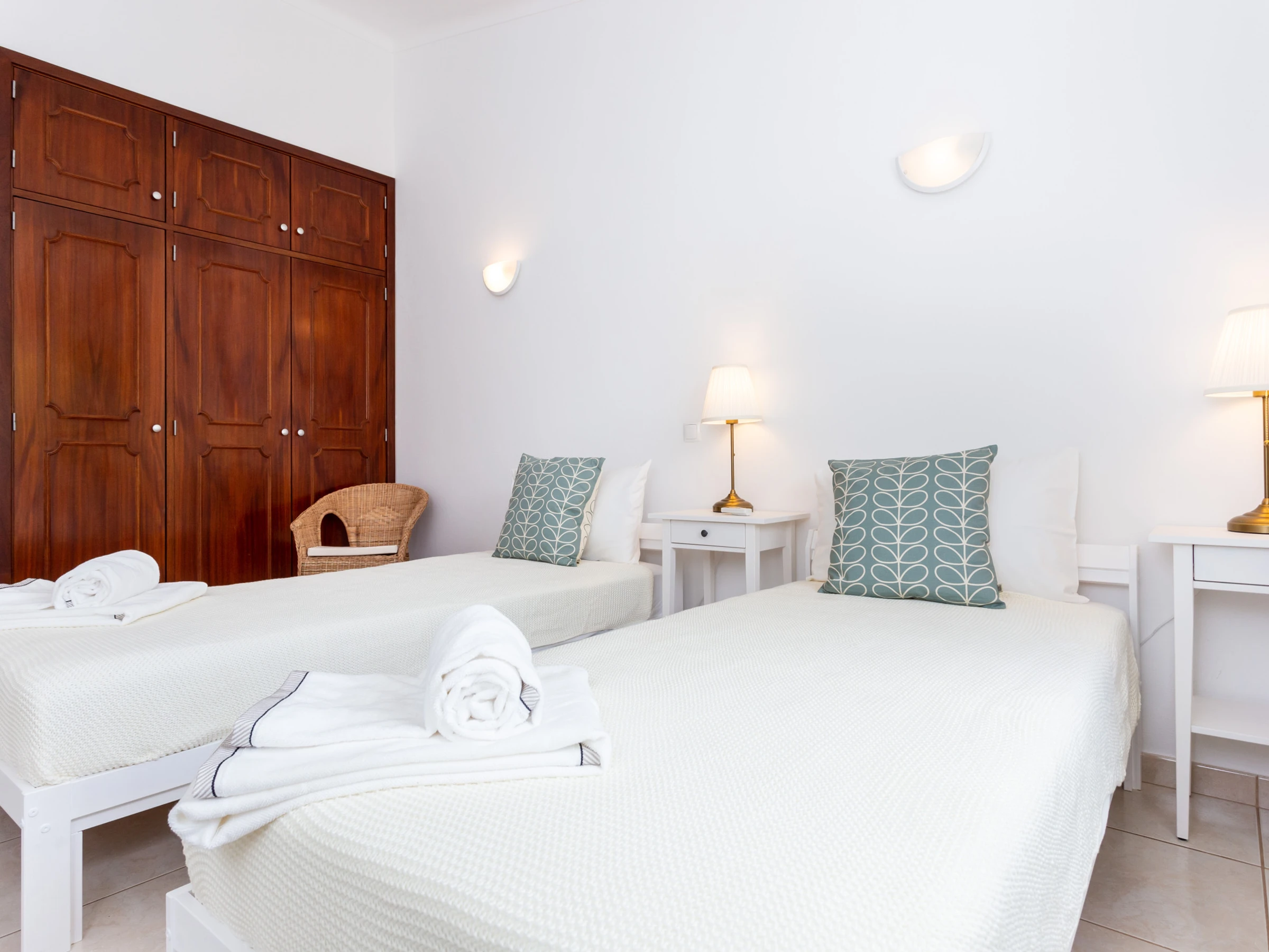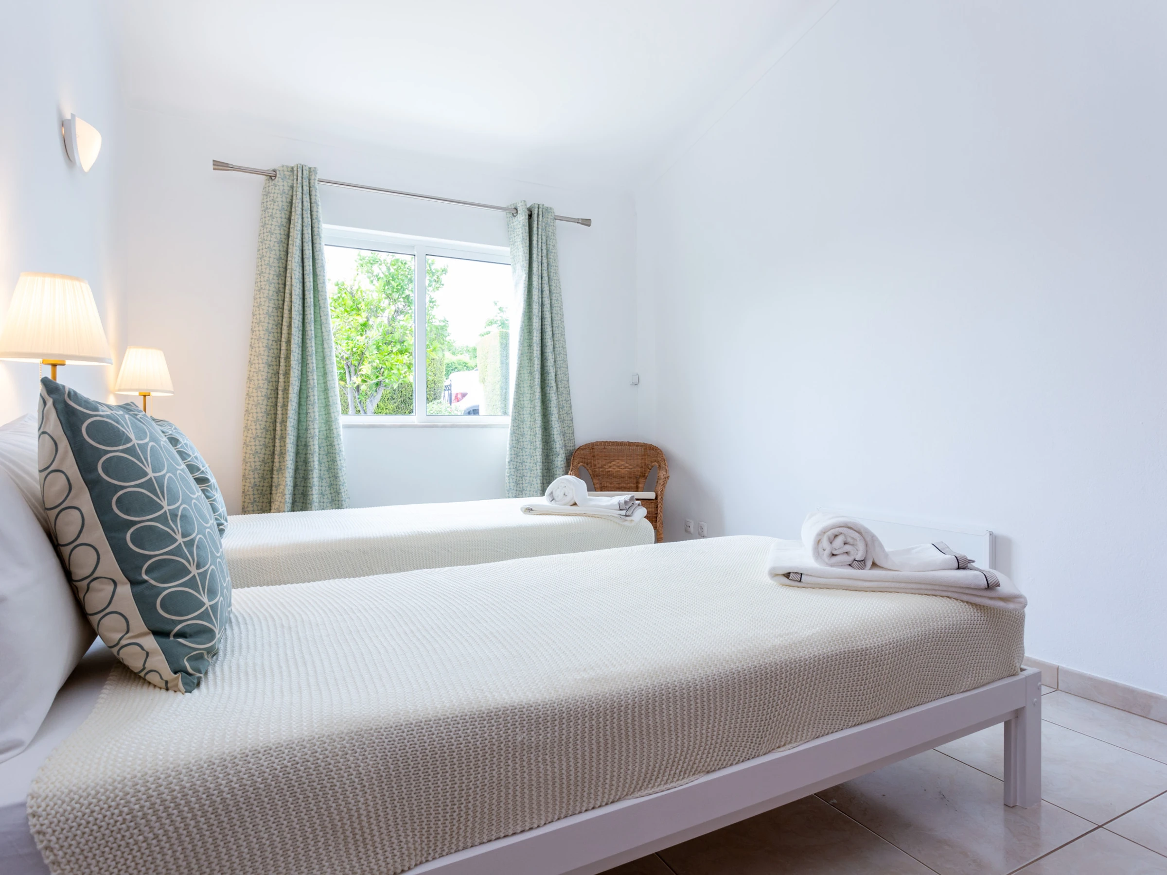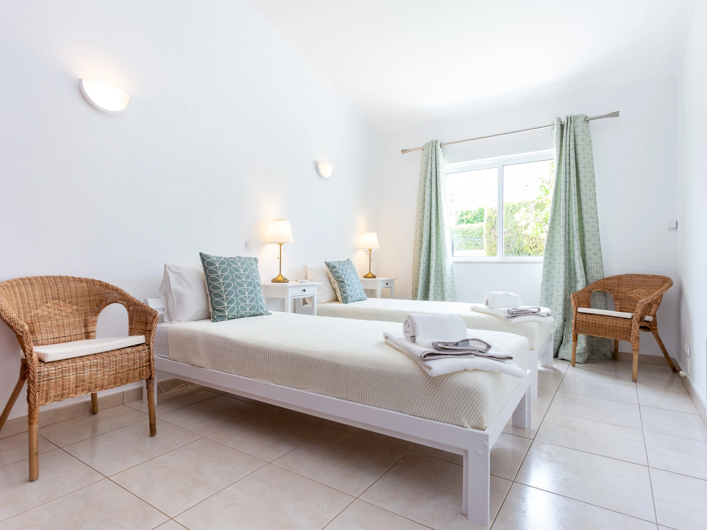 1 bedroom with 2 single beds, wardrobe, and window overlooking the house's entrance garden.