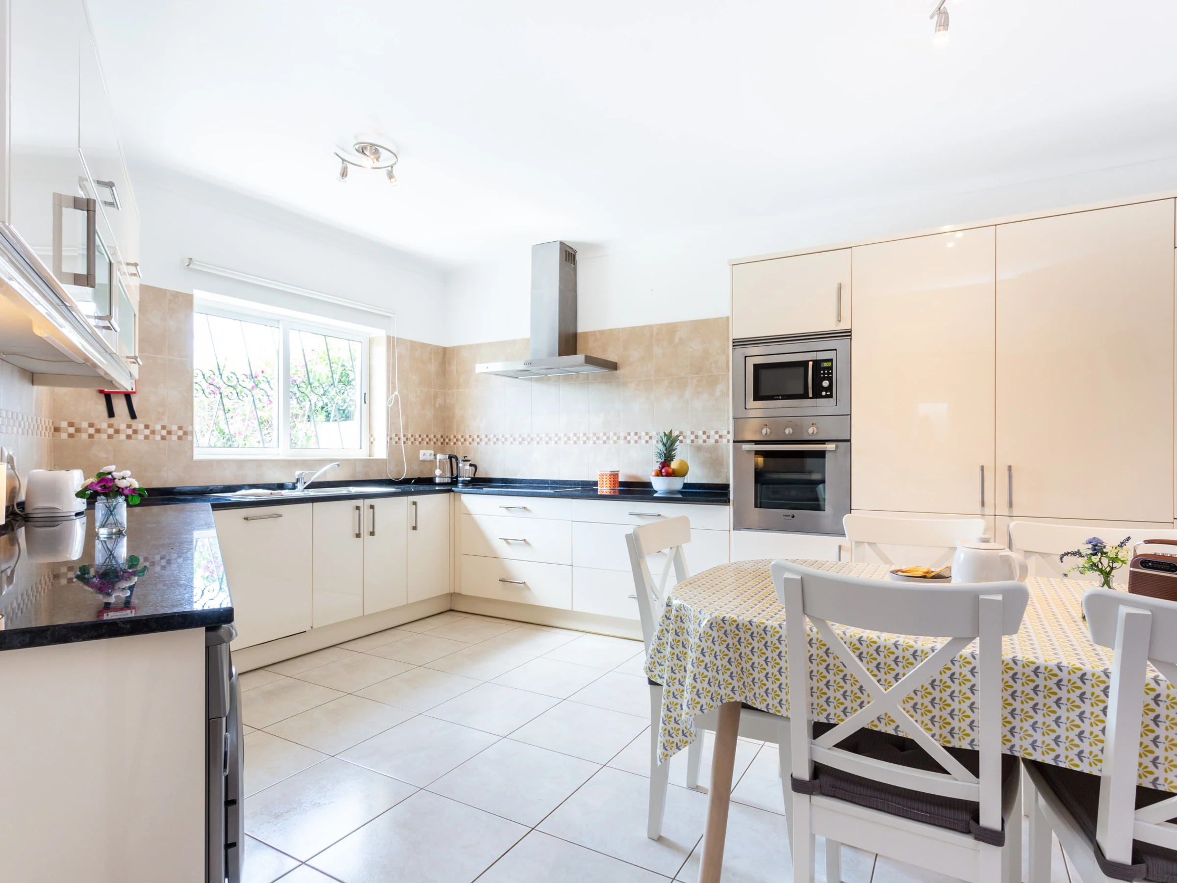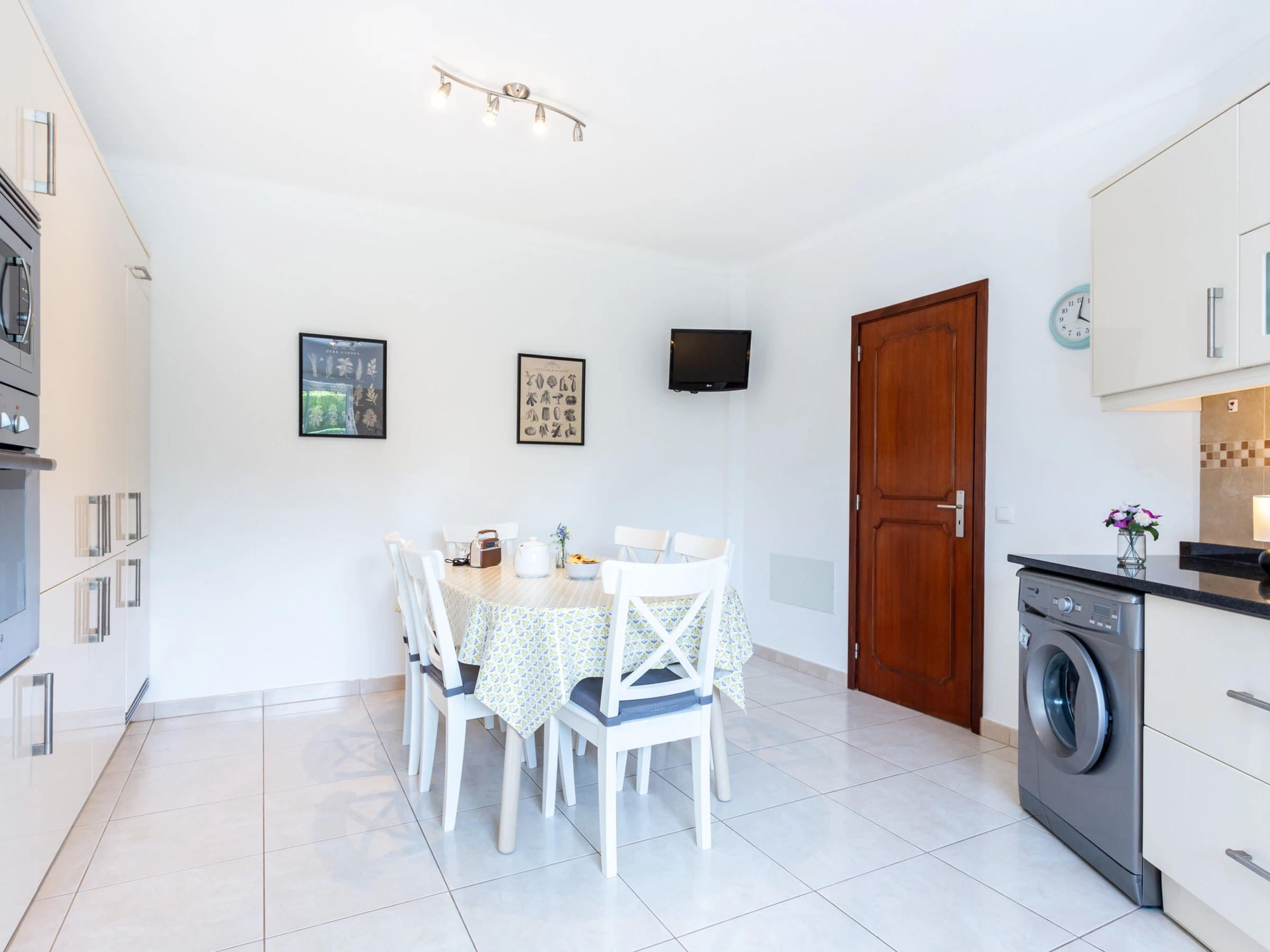 Modern kitchen with dining area, fully equipped with fridge/freezer, induction hob, electric oven, microwave, washing machine and dishwasher. Several other small appliances (toaster, kettle, hand blender, etc...)