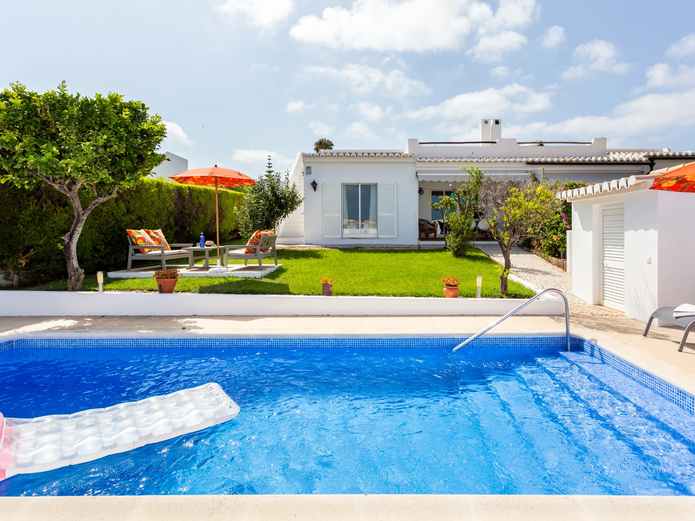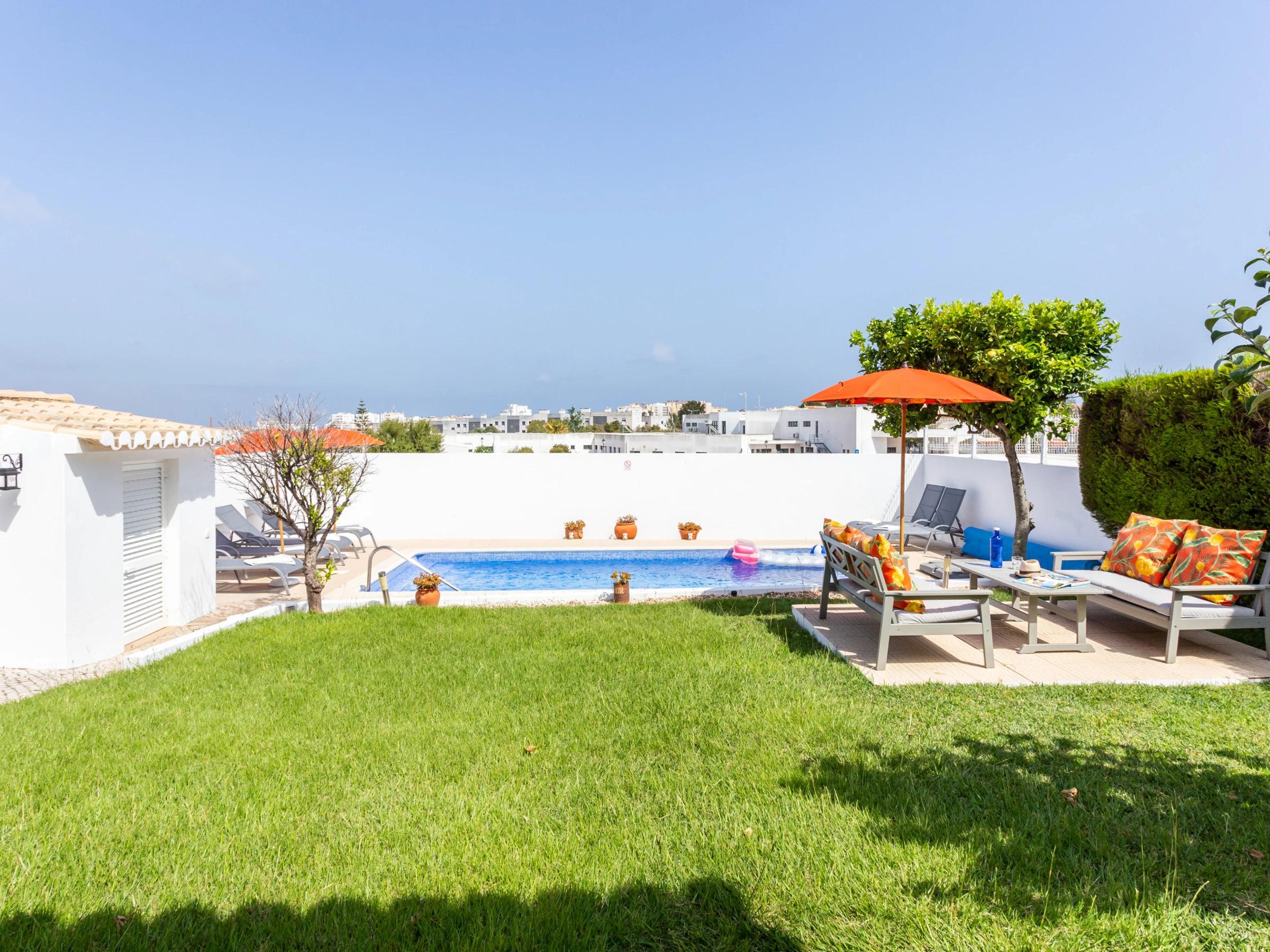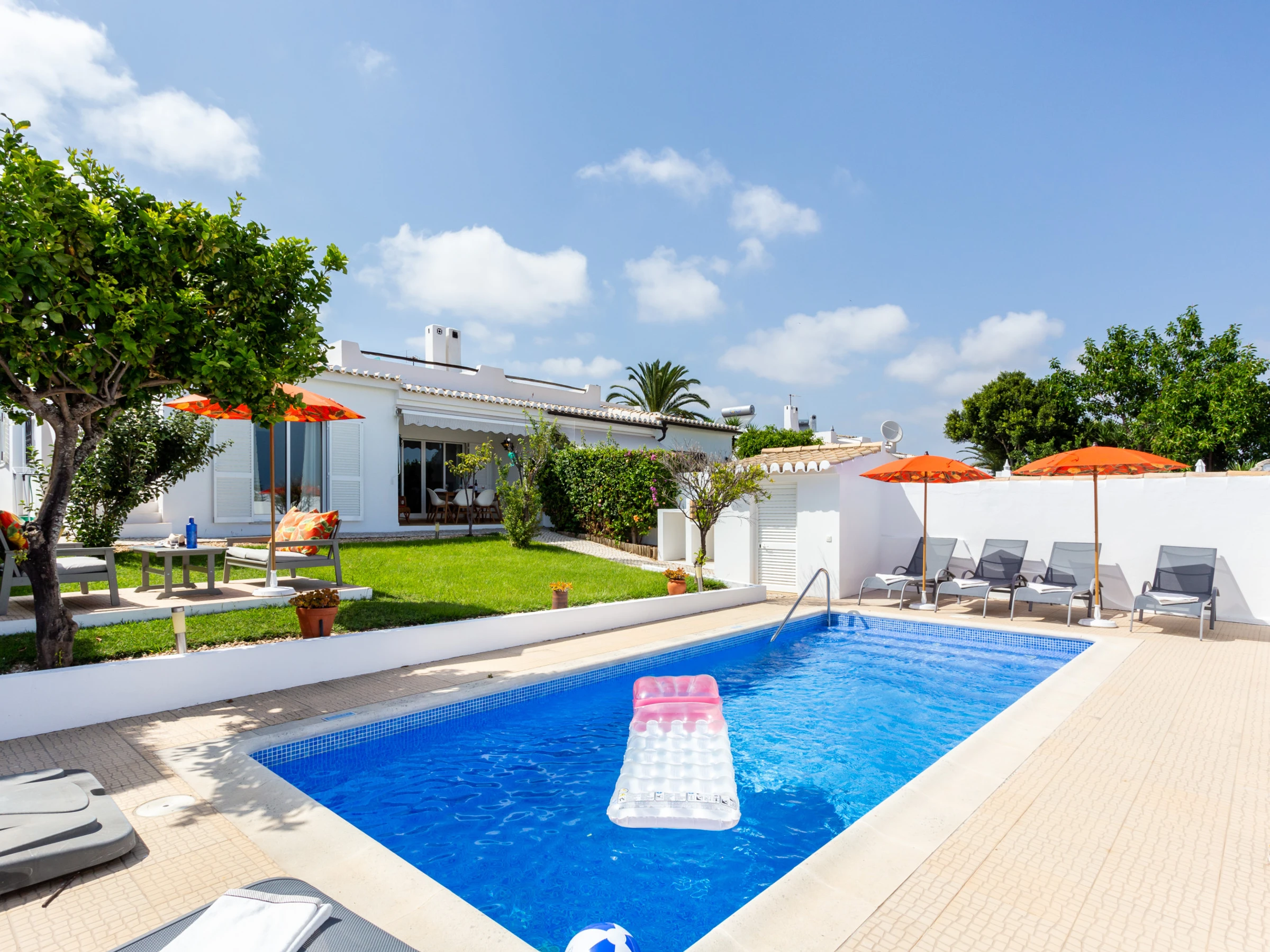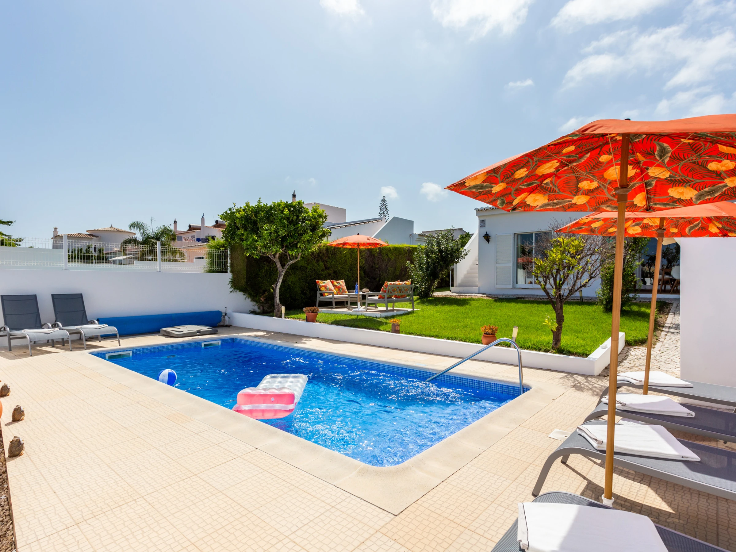 Swimming pool that can be heated, garden with lawn area, terrace for sunbathing and shaded dining area.