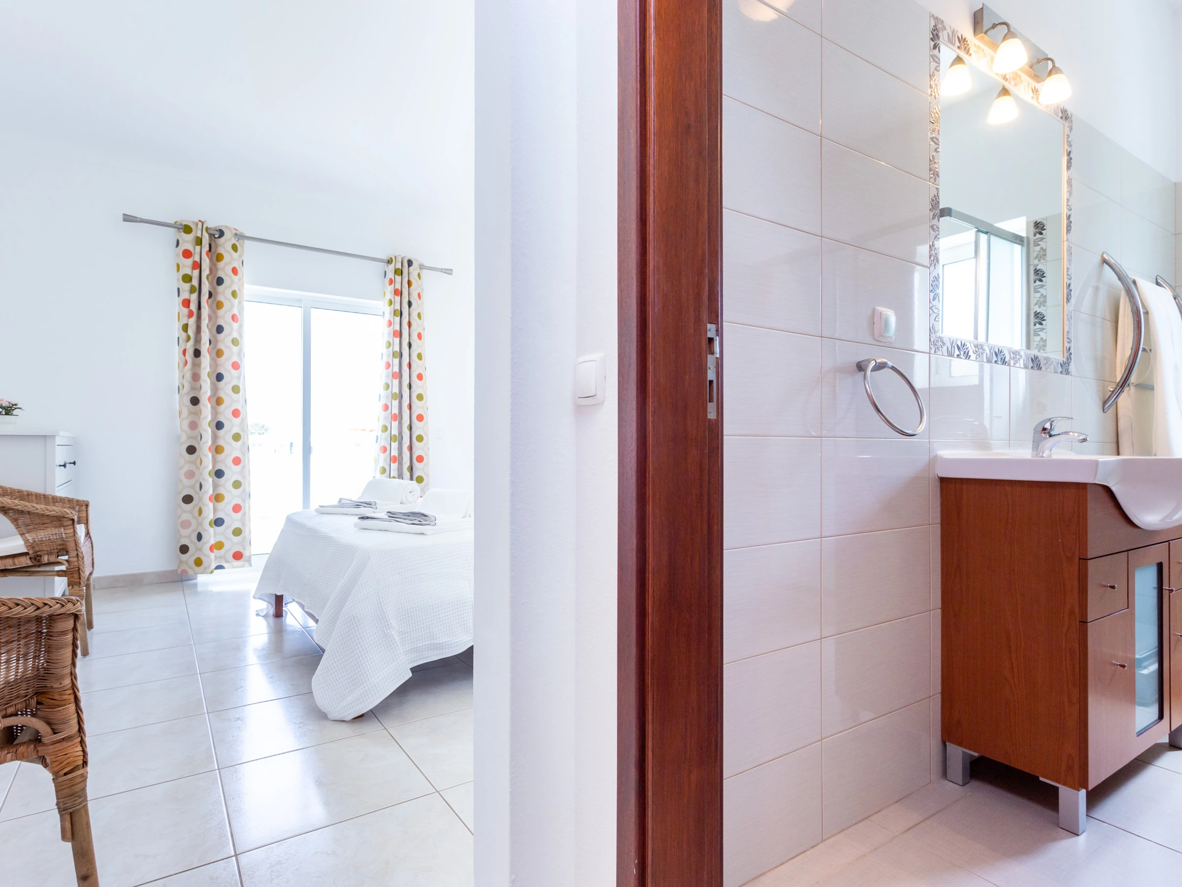 1 en suite room with a double bed, wardrobe, and private bathroom with shower cabin. Sliding doors open to the garden and pool area.