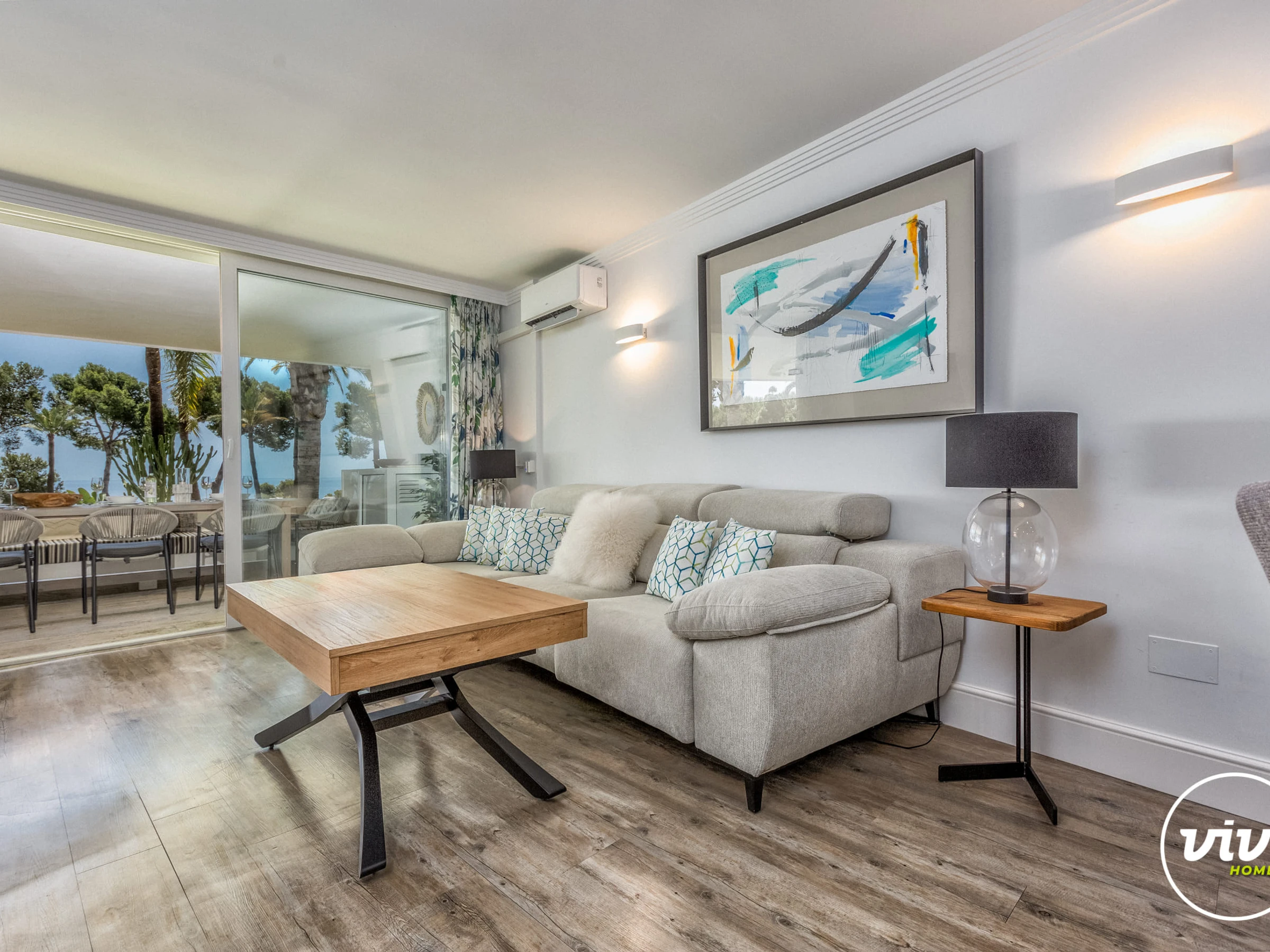 Relax in the living area, prepare meals in the kitchen, or enjoy outdoor dining while taking in the Mediterranean views.