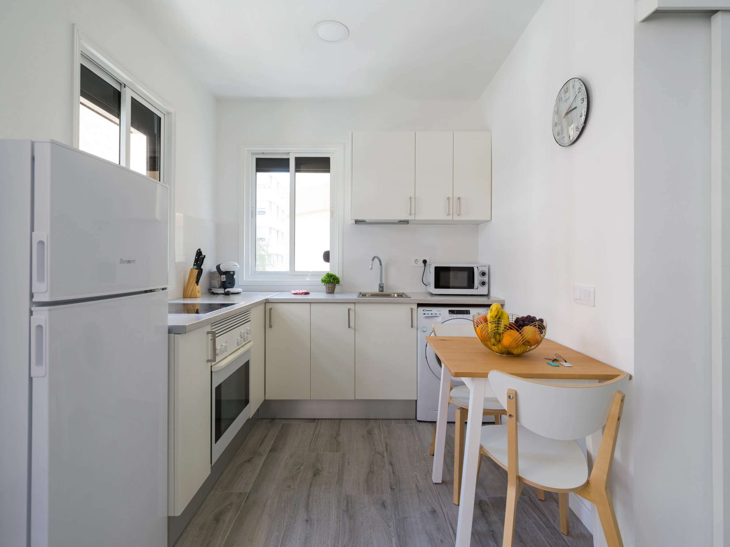 The kitchen is fully equipped with fridge-freezer, washer and dryer in one, oven, microwave, capsule coffee machine and small appliances.