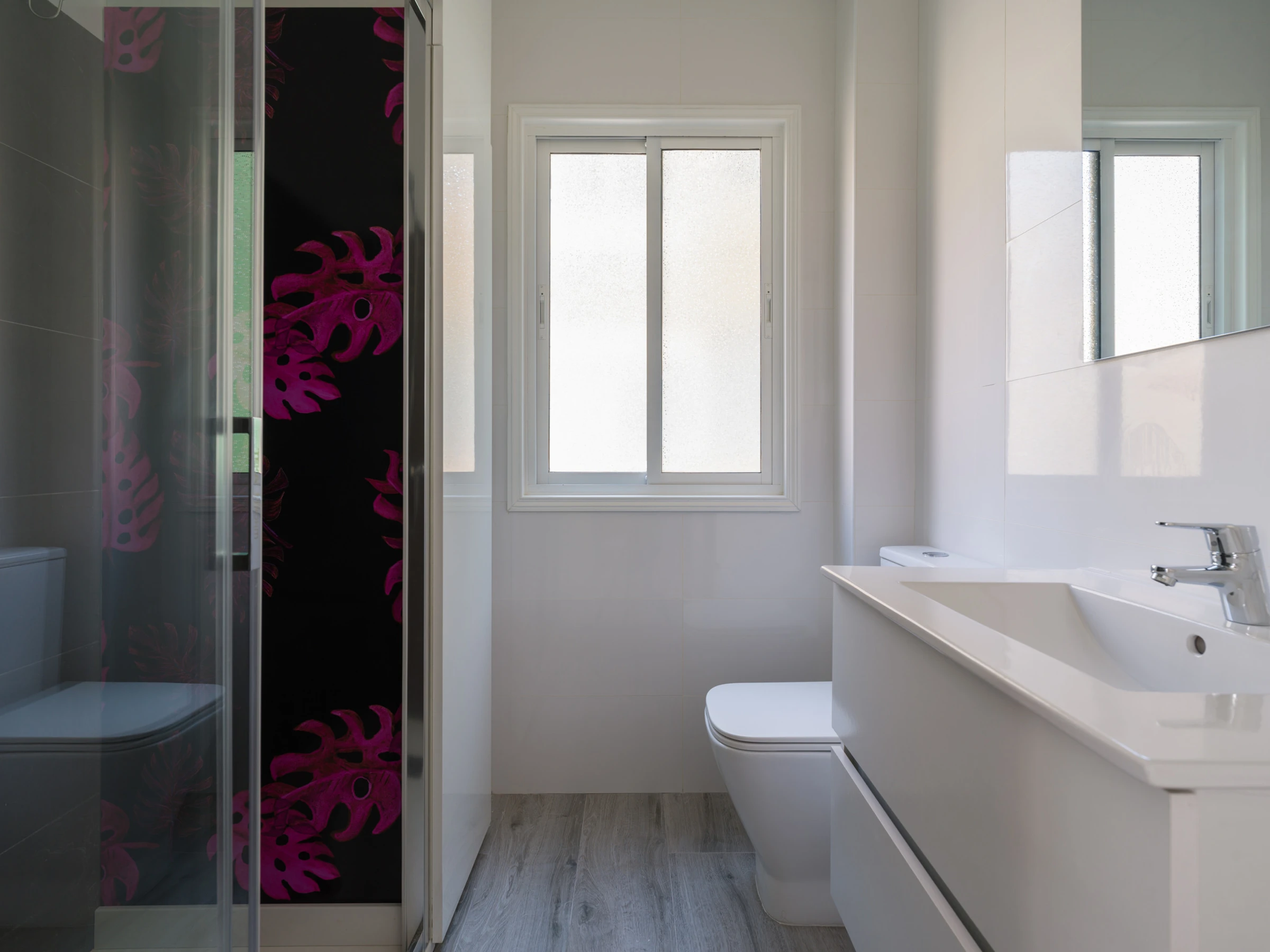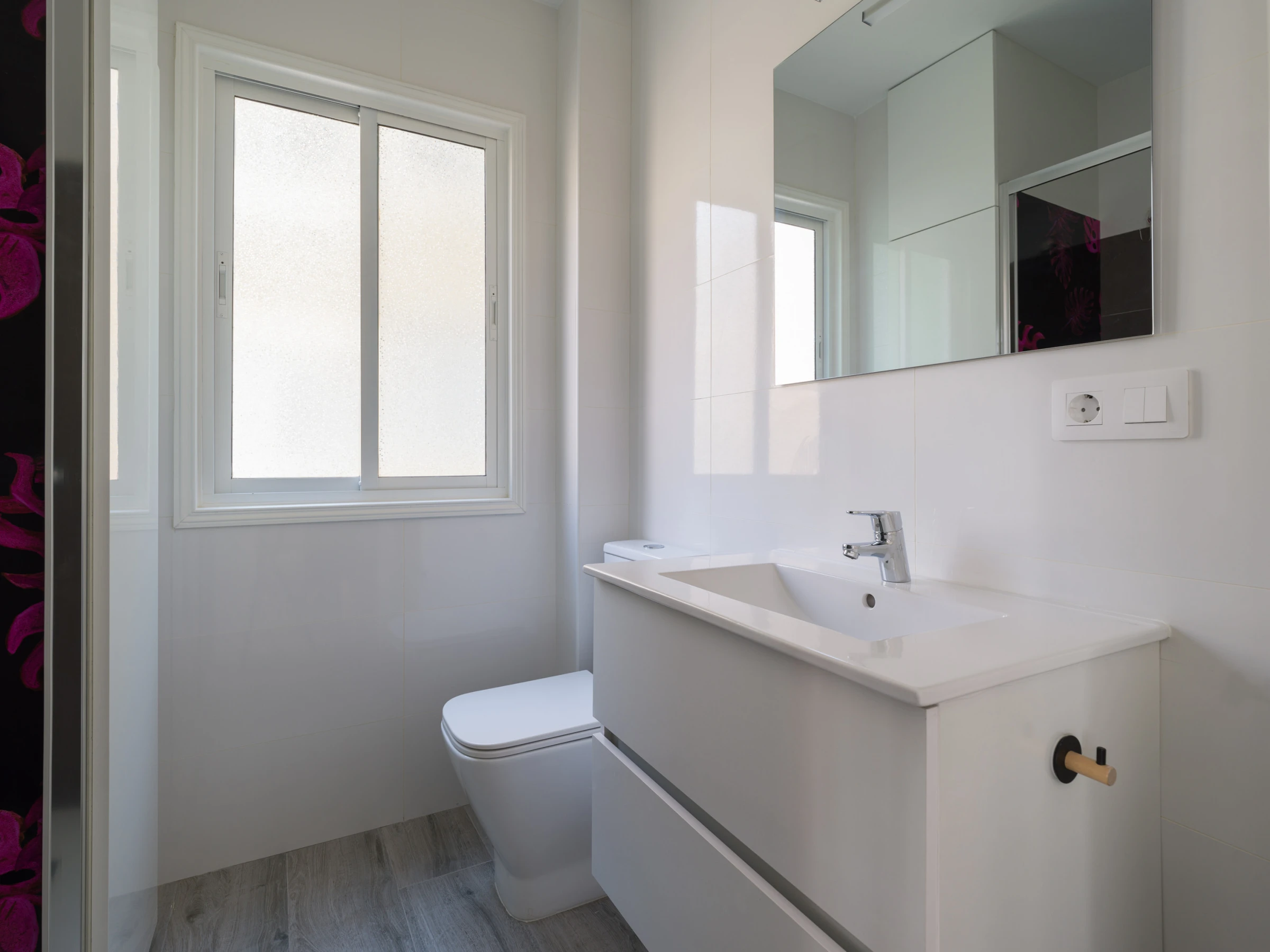 To access the bathroom there is a small step of five centimetres, the door is sliding to maximize space, it has a large window, so it is very bright, like the whole house, shower tray with screen, a cupboard to store cleaning utensils, toilet with dual flush and sink with storage space.