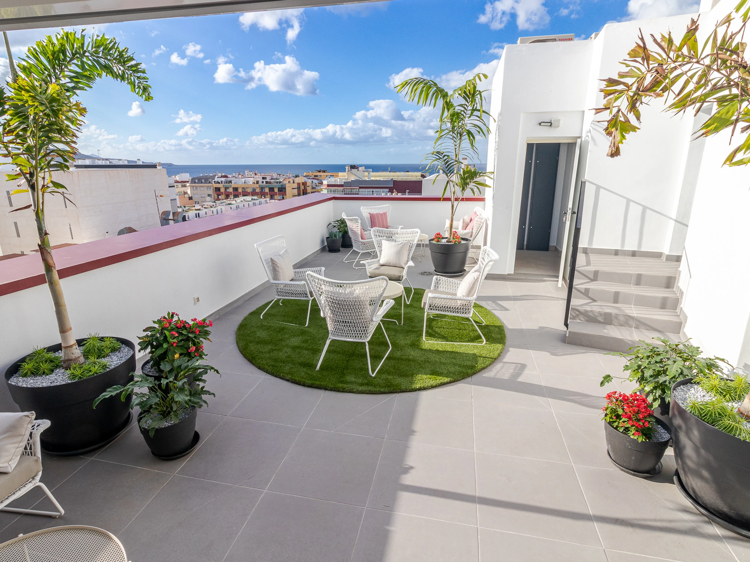 In the upper area of the building there is a terrace with different furniture and views of the city and partially of the sea.