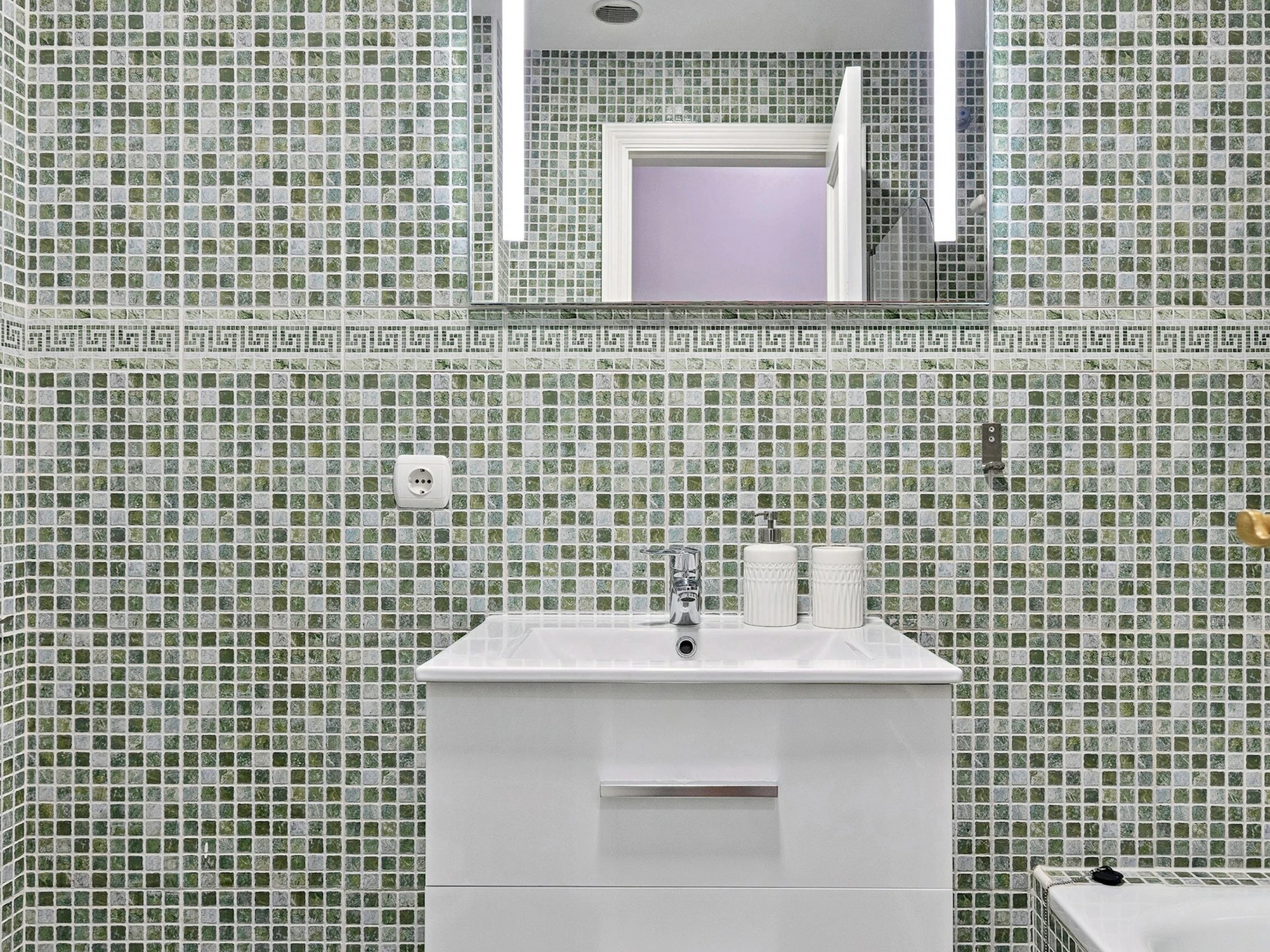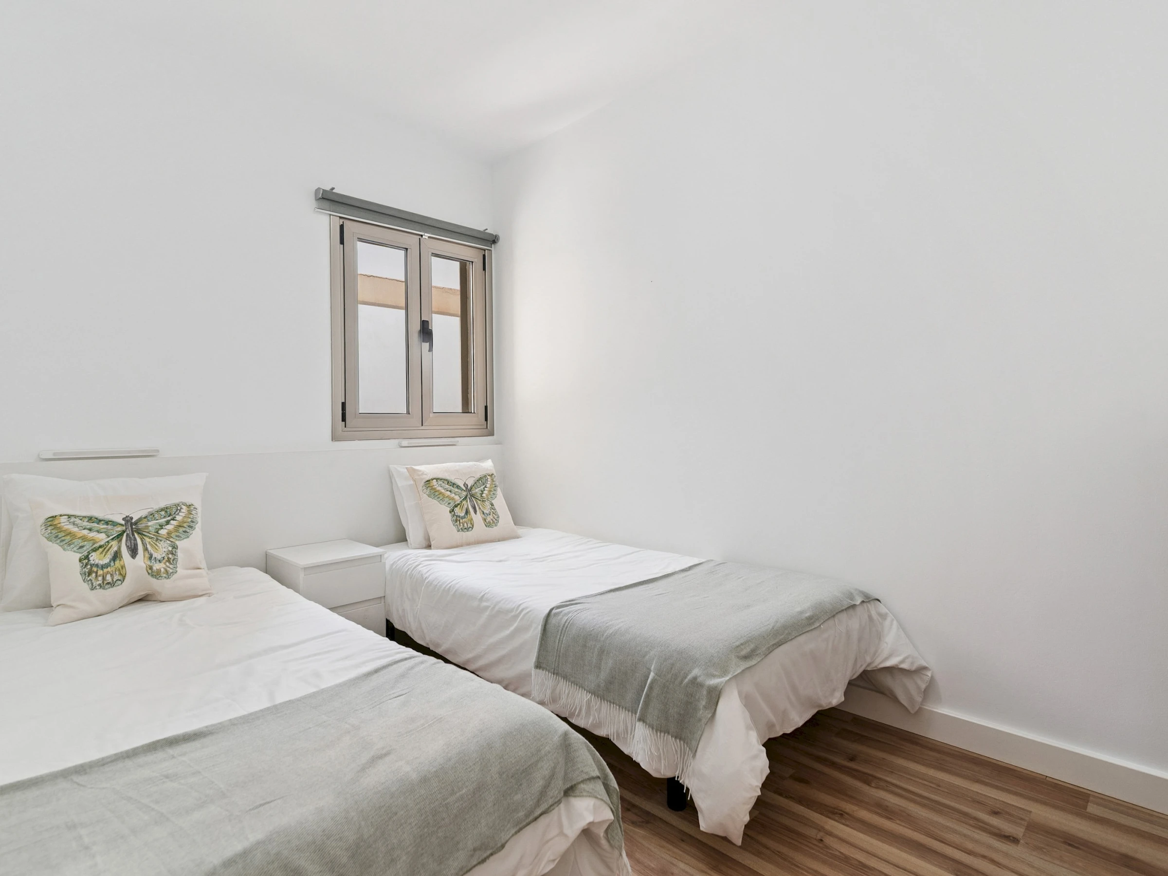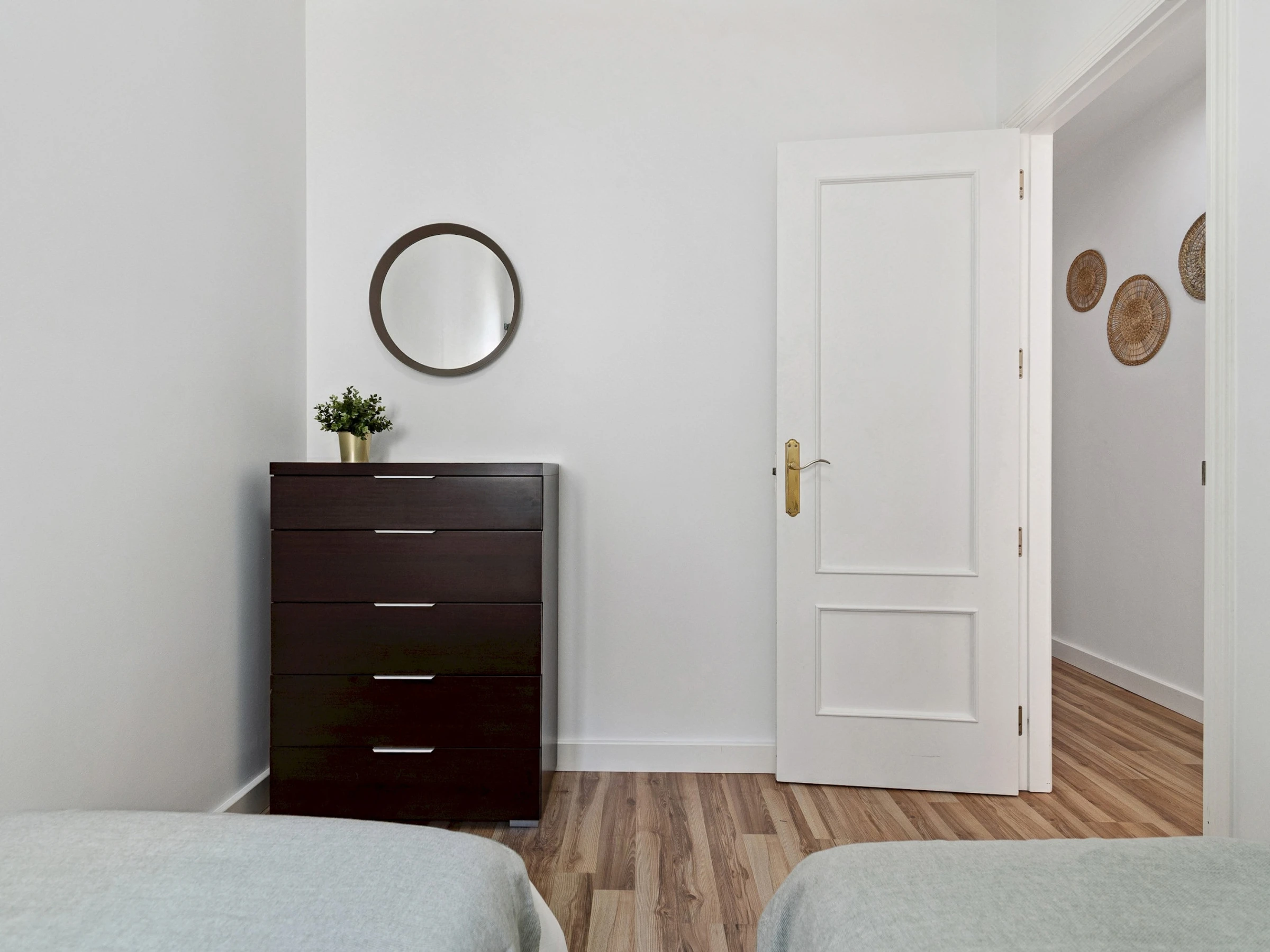 The apartment has three bedrooms: two with double beds and one with two single beds, all decorated in soft tones that create a sense of calm. Designed for the comfort of groups and families, it also features two full bathrooms — one with a shower and another with a bathtub — to suit all preferences.