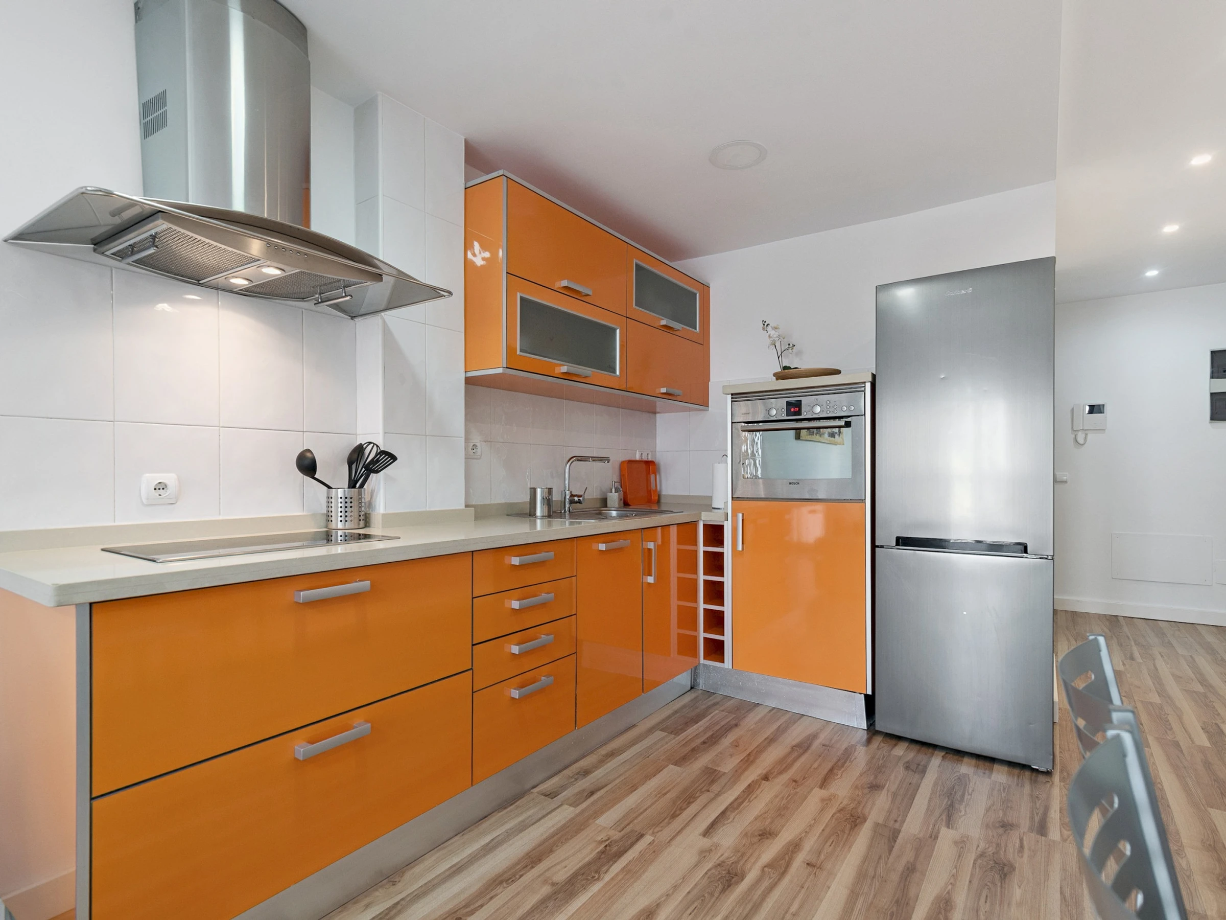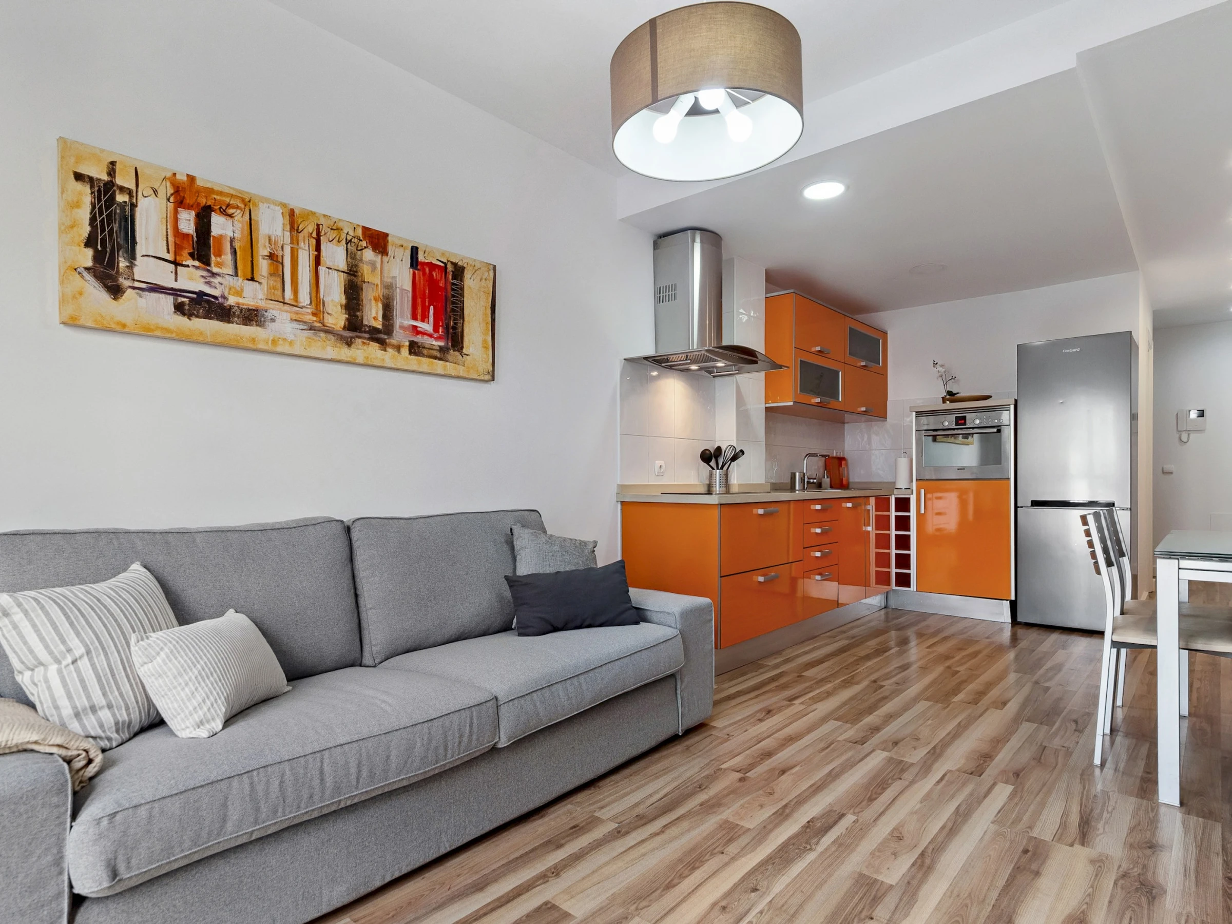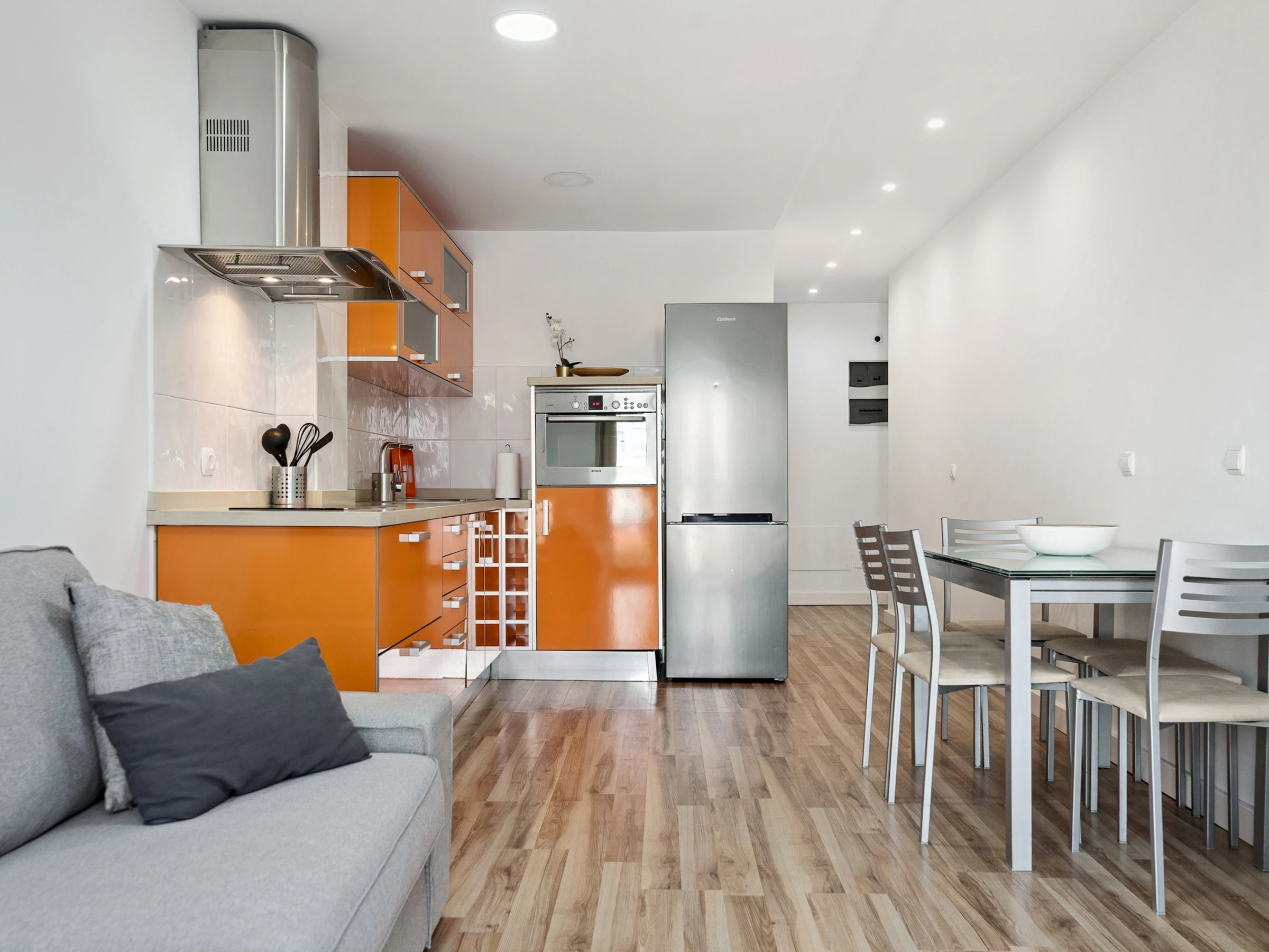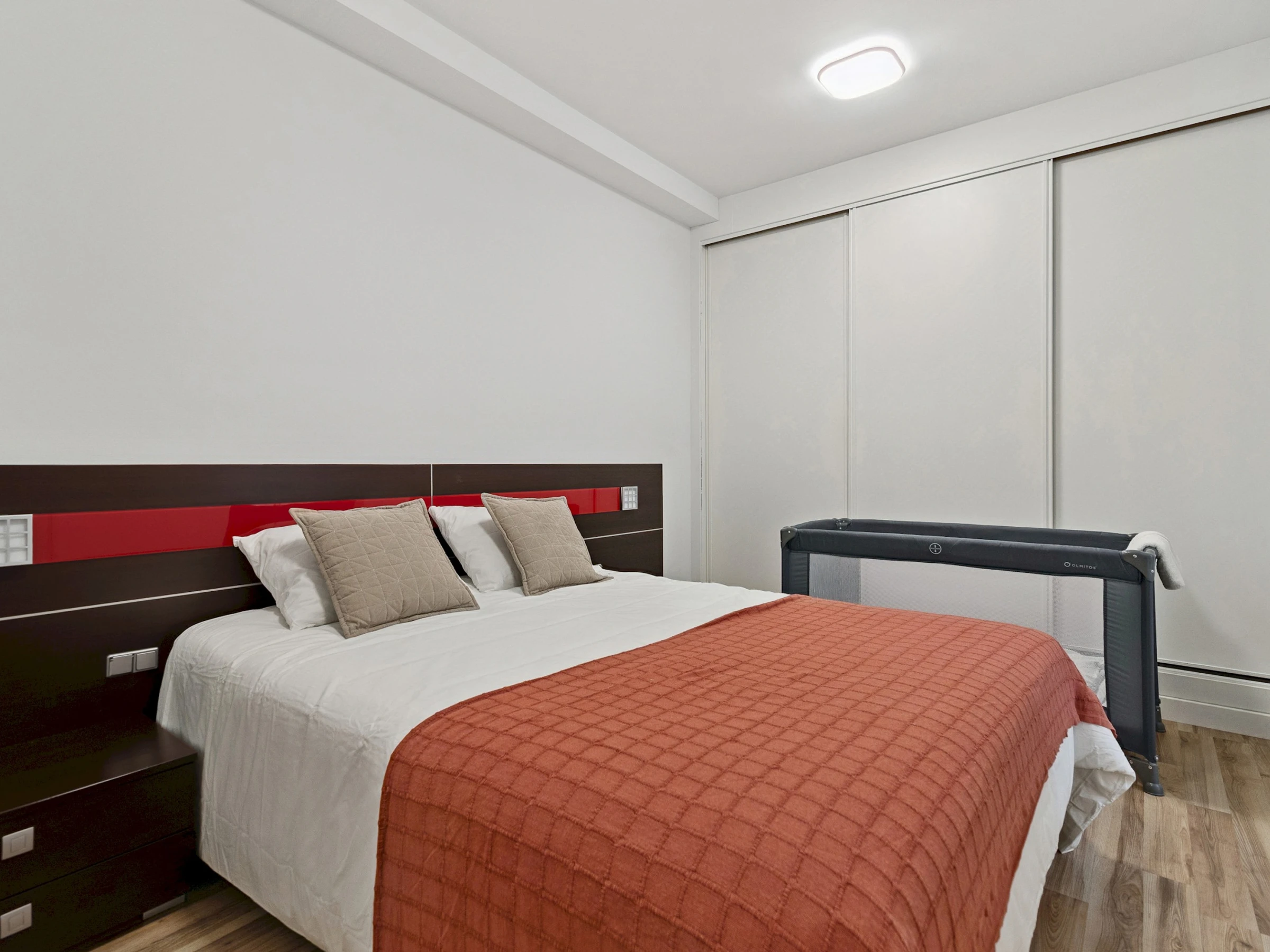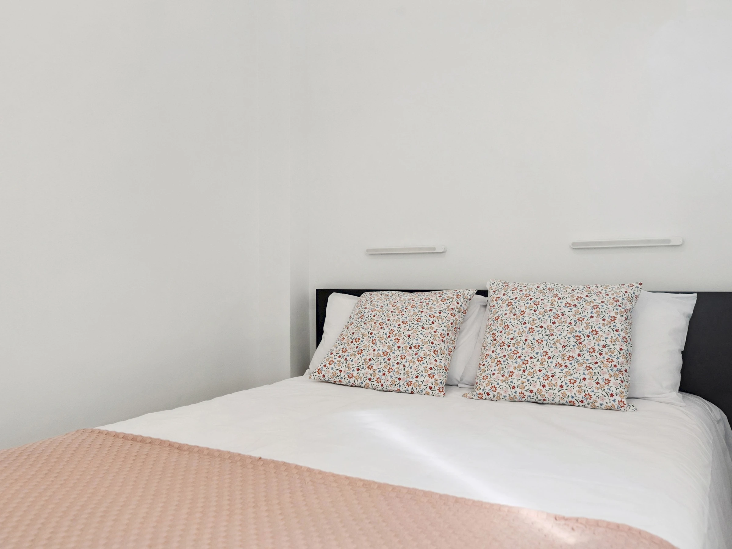 Upon entering, you’re welcomed by a bright living-dining room with large windows that let in plenty of natural light. The spacious, cozy sofa invites you to relax after a day in the city, while the open-plan kitchen allows for conversation to continue as meals are prepared, thanks to its full range of everyday utensils and appliances.