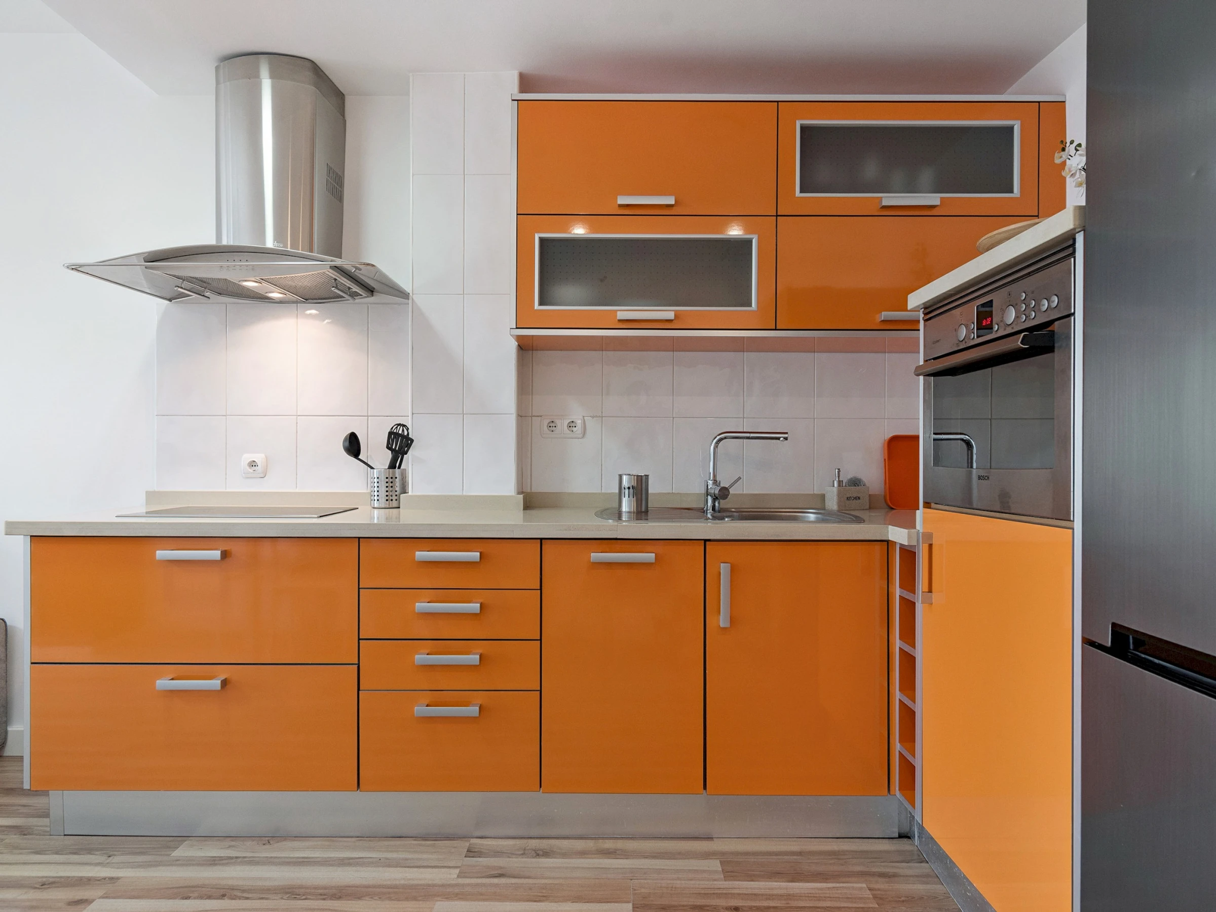 The apartment features a fully equipped kitchen with an oven, microwave, dishwasher, coffee maker, kettle, juicer, blender, and toaster. It also includes a washing machine.
