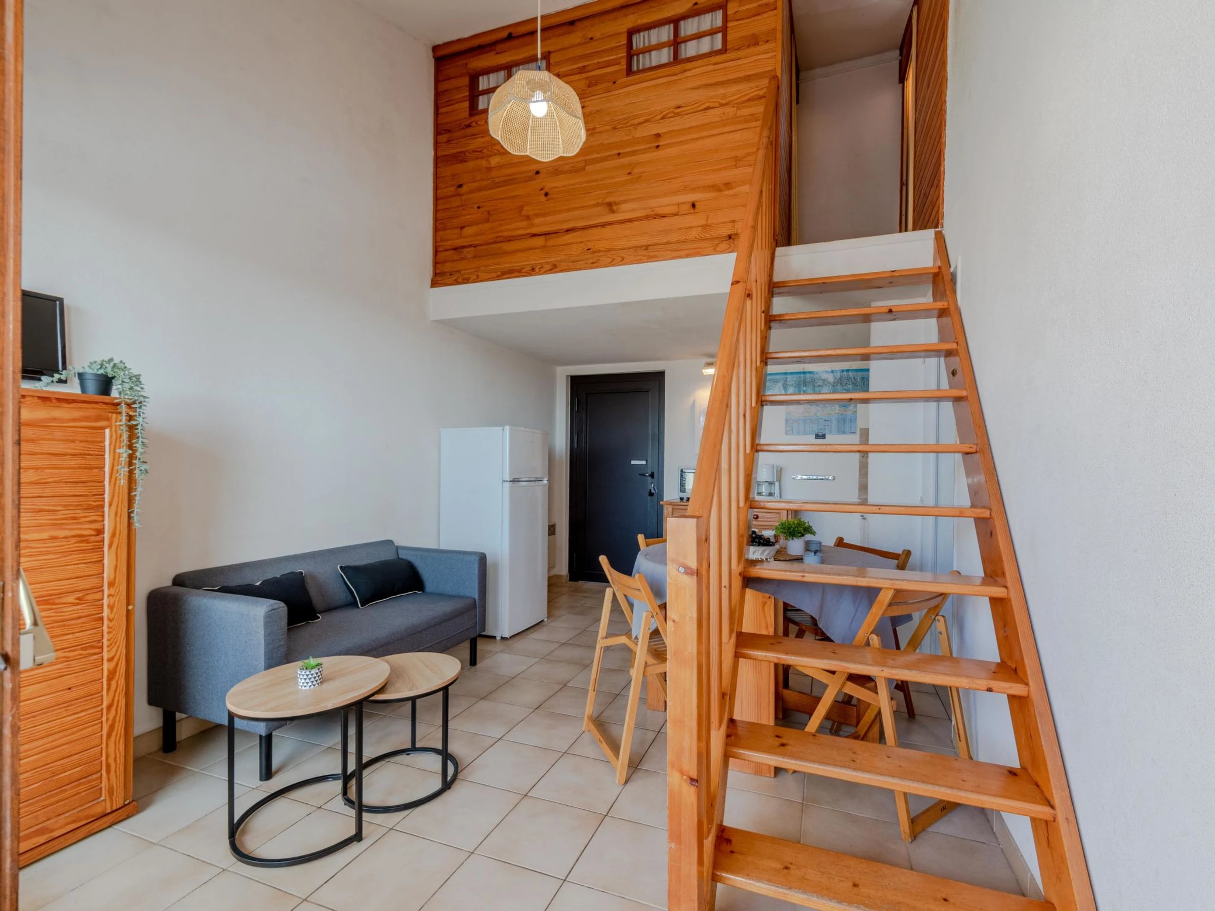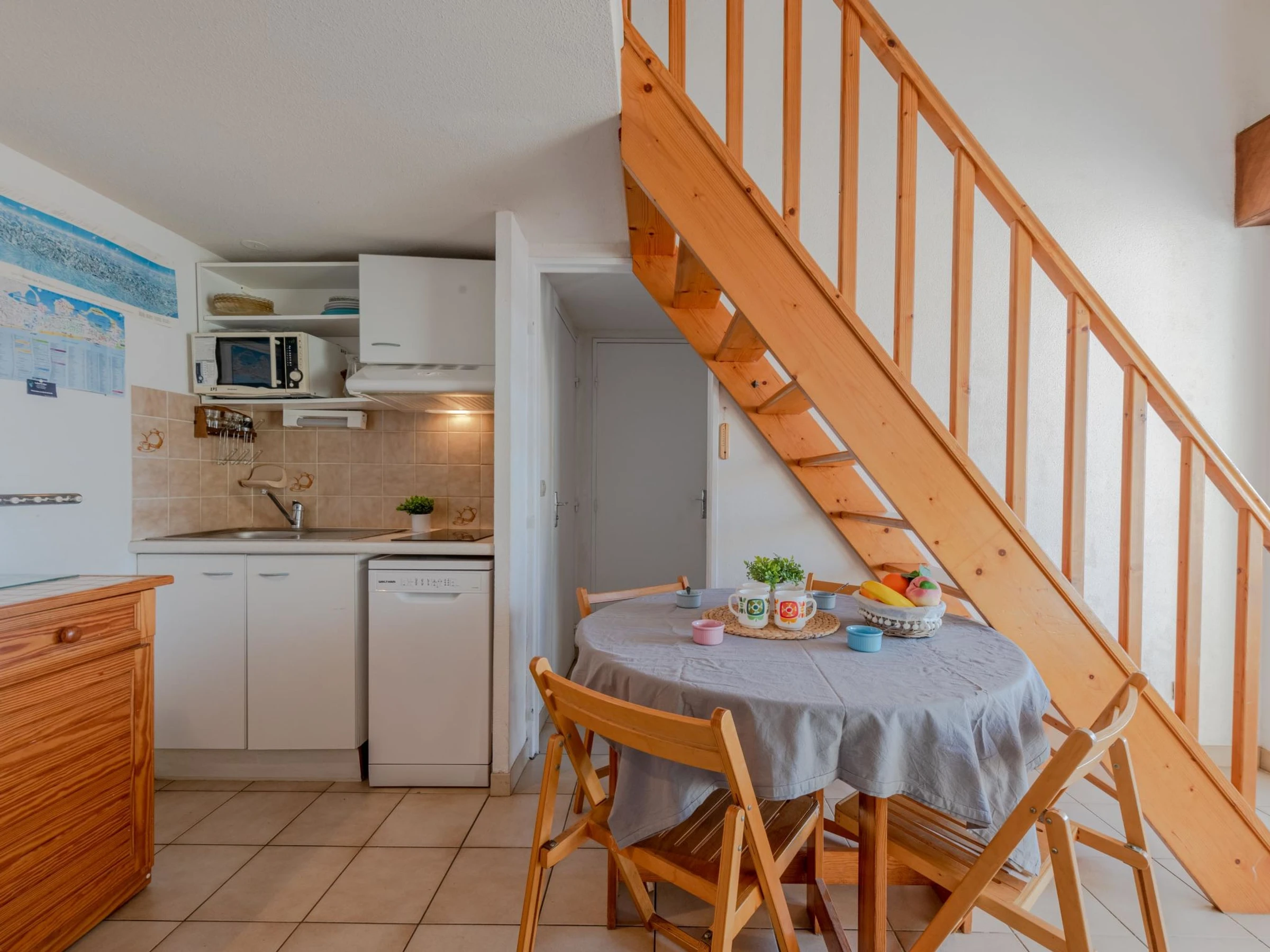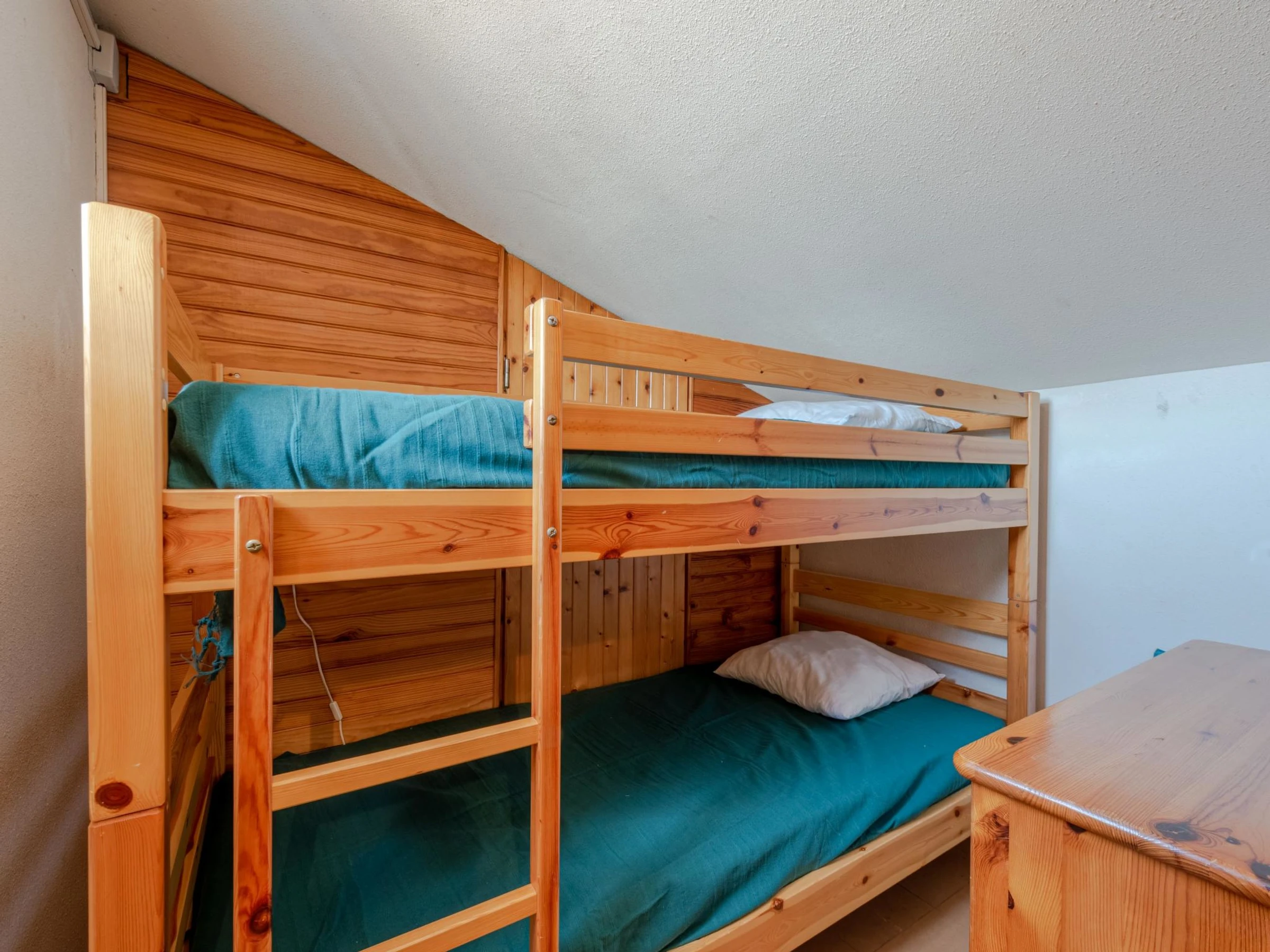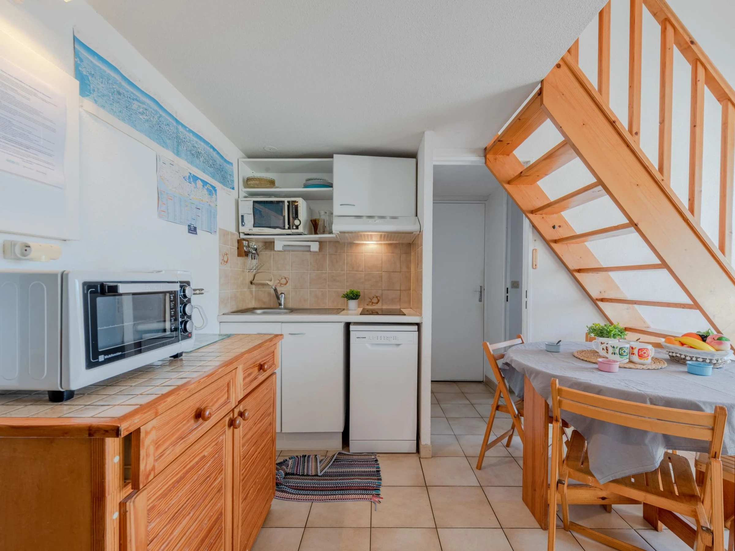 2-room apartment 35 m2 on 2nd floor, south facing position. Living/dining room with TV. Exit to the terrace. 1 room with 1 french bed (1 x 140 cm, length 190 cm). Kitchenette (2 hot plates, mini-oven, dishwasher, microwave, freezer, electric coffee machine). Shower, sep. WC. Electric heating. Upper floor: 1 small room with 1 x 2 bunk beds (90 cm, length 190 cm). 1 small room with 1 french bed (1 x 120 cm, length 190 cm). Terrace 8 m2. Terrace furniture. View of the swimming pool and the countryside. Facilities: washing machine. Internet (WiFi, extra). Parking space n 275. Please note: smoke alarm. [hidden]