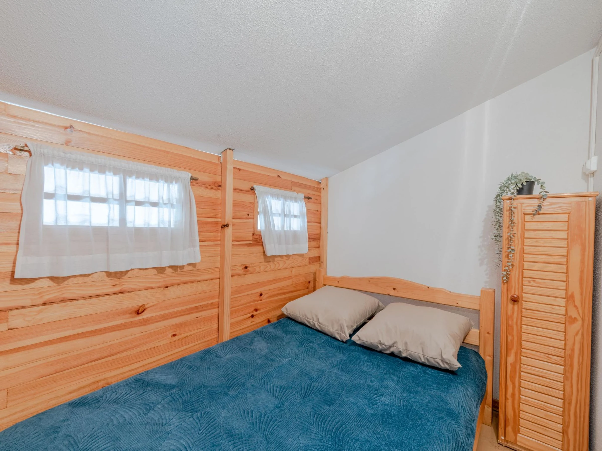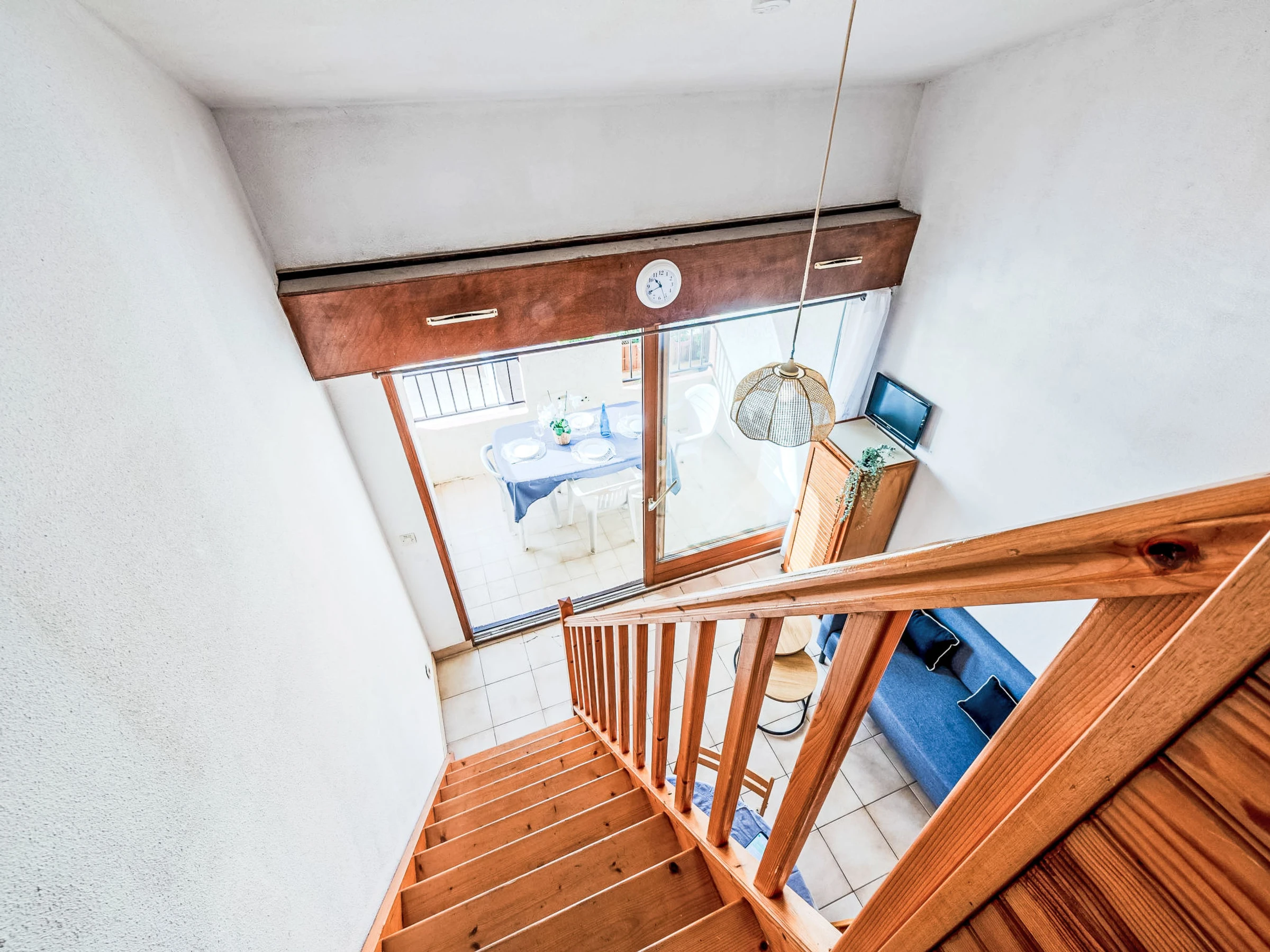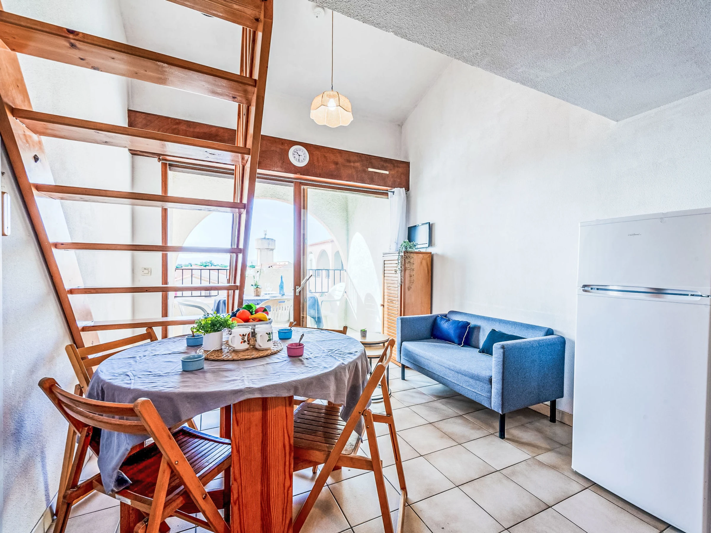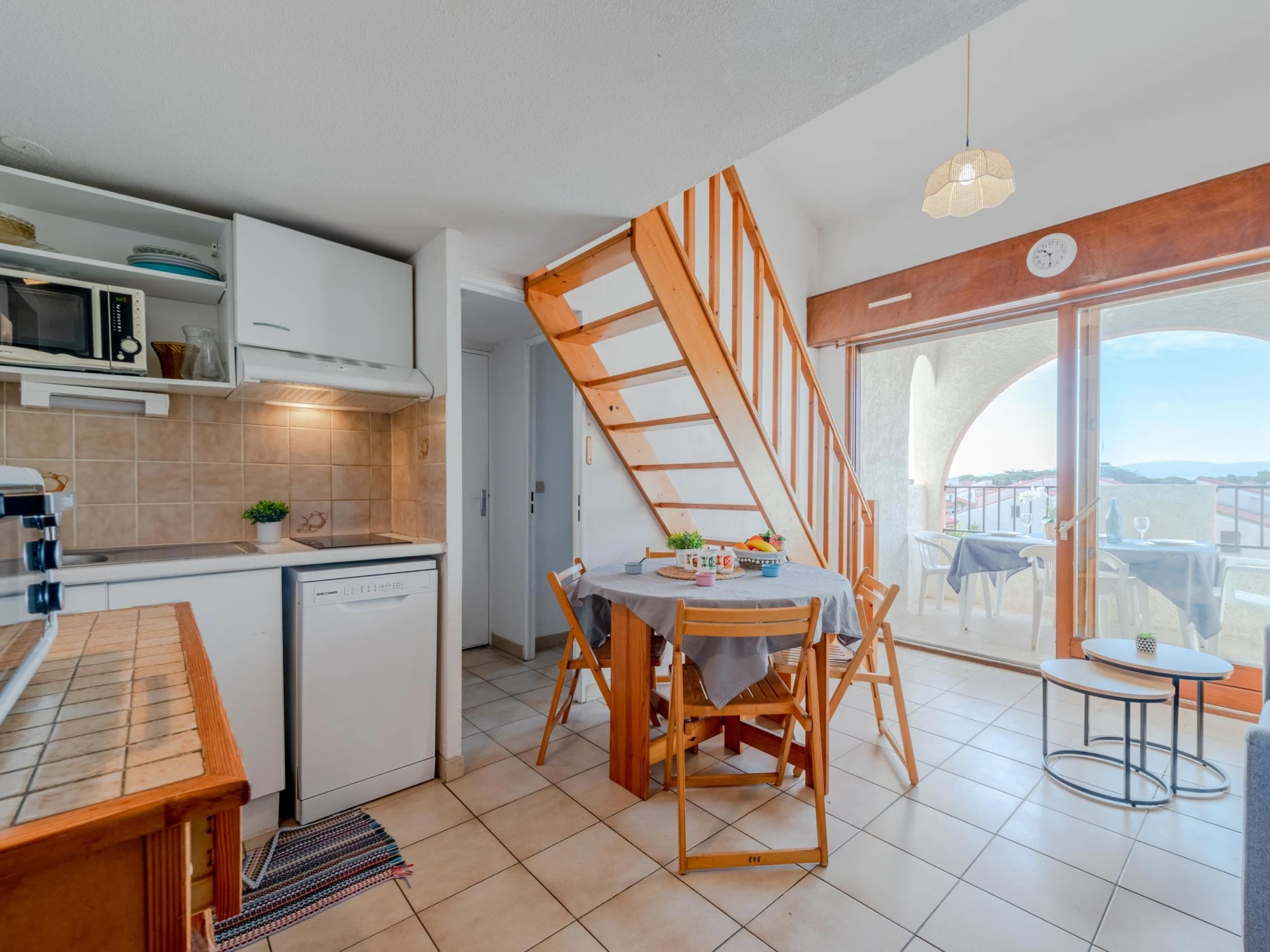 2-room apartment 35 m2 on 2nd floor, south facing position. Living/dining room with TV. Exit to the terrace. 1 room with 1 french bed (1 x 140 cm, length 190 cm). Kitchenette (2 hot plates, mini-oven, dishwasher, microwave, freezer, electric coffee machine). Shower, sep. WC. Electric heating. Upper floor: 1 small room with 1 x 2 bunk beds (90 cm, length 190 cm). 1 small room with 1 french bed (1 x 120 cm, length 190 cm). Terrace 8 m2. Terrace furniture. View of the swimming pool and the countryside. Facilities: washing machine. Internet (WiFi, extra). Parking space n 275. Please note: smoke alarm. [hidden]