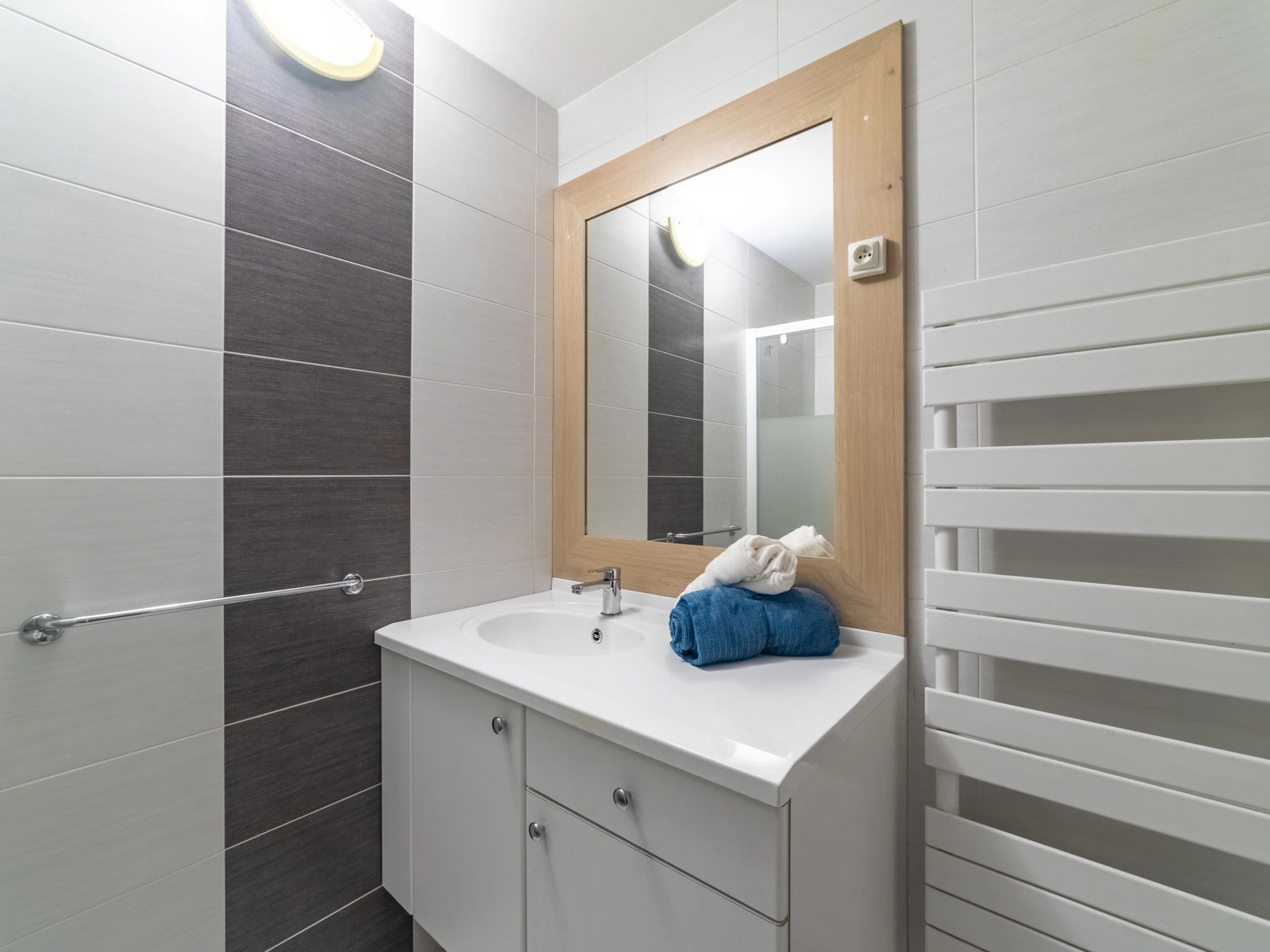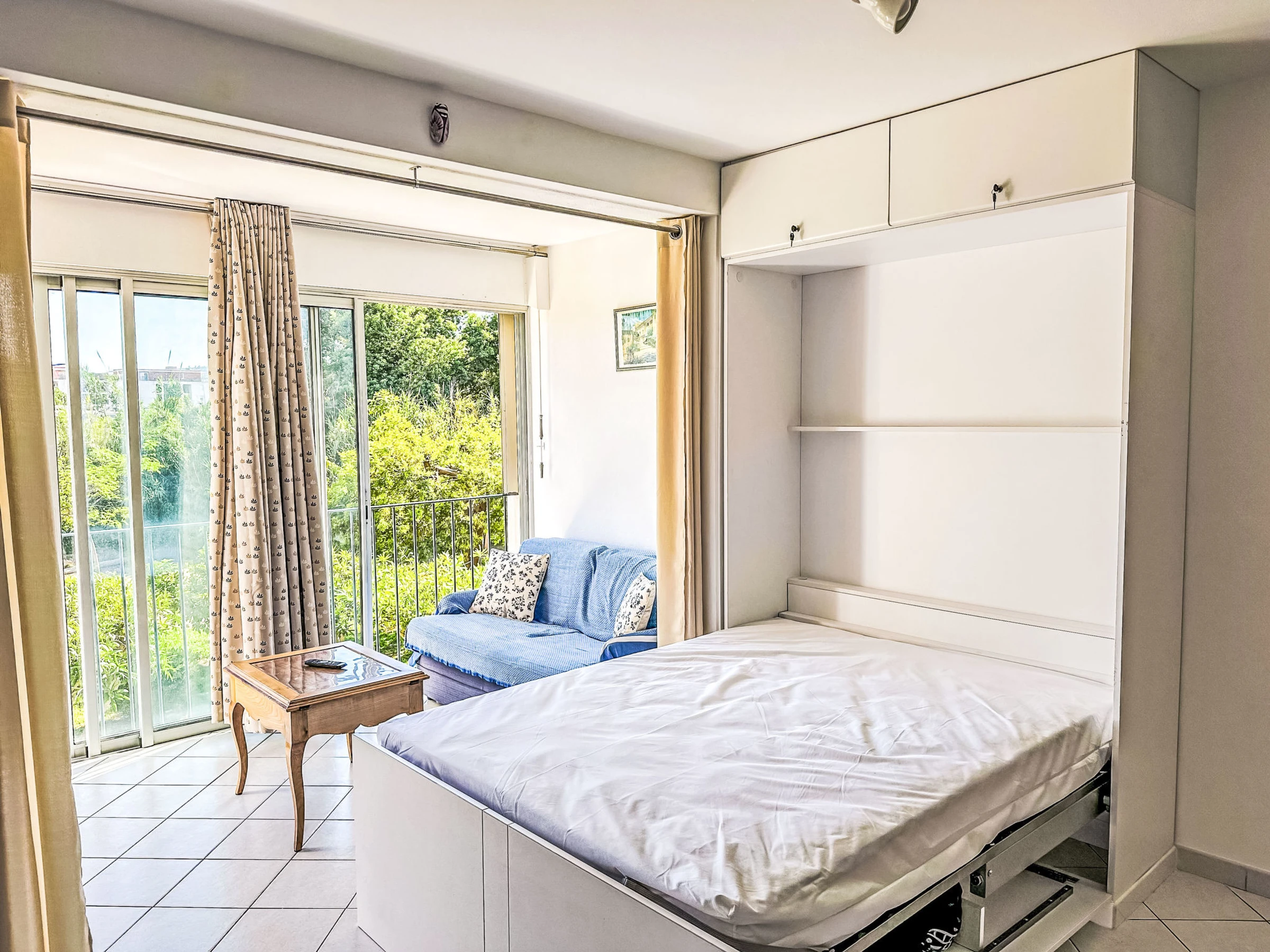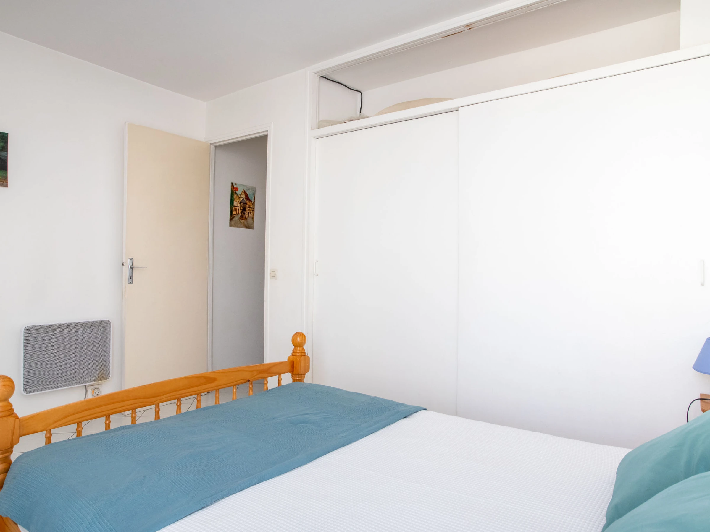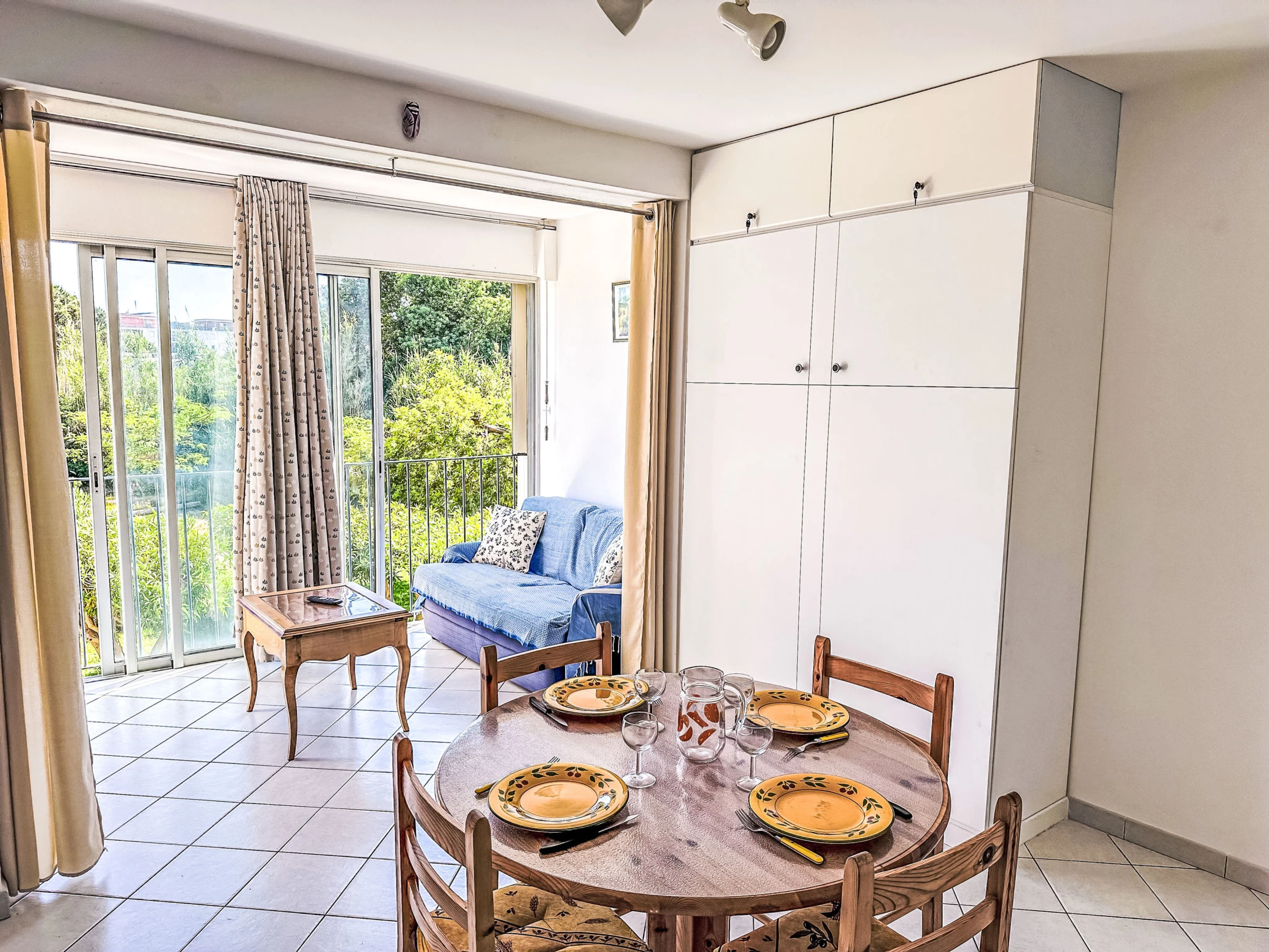 2-room apartment 38 m2 on 1st floor. Beautiful furnishings: living/dining room with panoramic window with 1 double fold-away bed (140 cm, length 190 cm), TV (flat screen). 1 room with 1 french bed (140 cm, length 190 cm). Kitchenette (4 hot plates, oven, toaster, kettle, microwave, freezer, electric coffee machine). Shower, sep. WC. Electric heating. View of the garden. Facilities: baby cot for up to 2 year olds. Internet (WiFi, extra). Parking space n 66 (fenced). Please note: apartment courtyard side. TV only FR. Smoke alarm. [hidden]