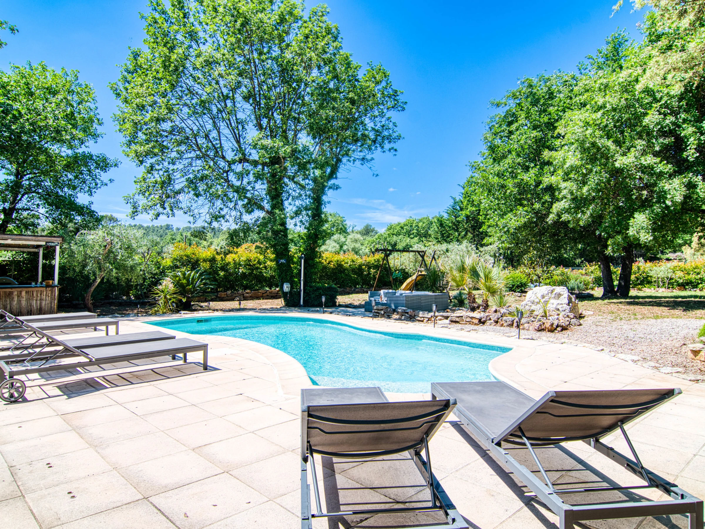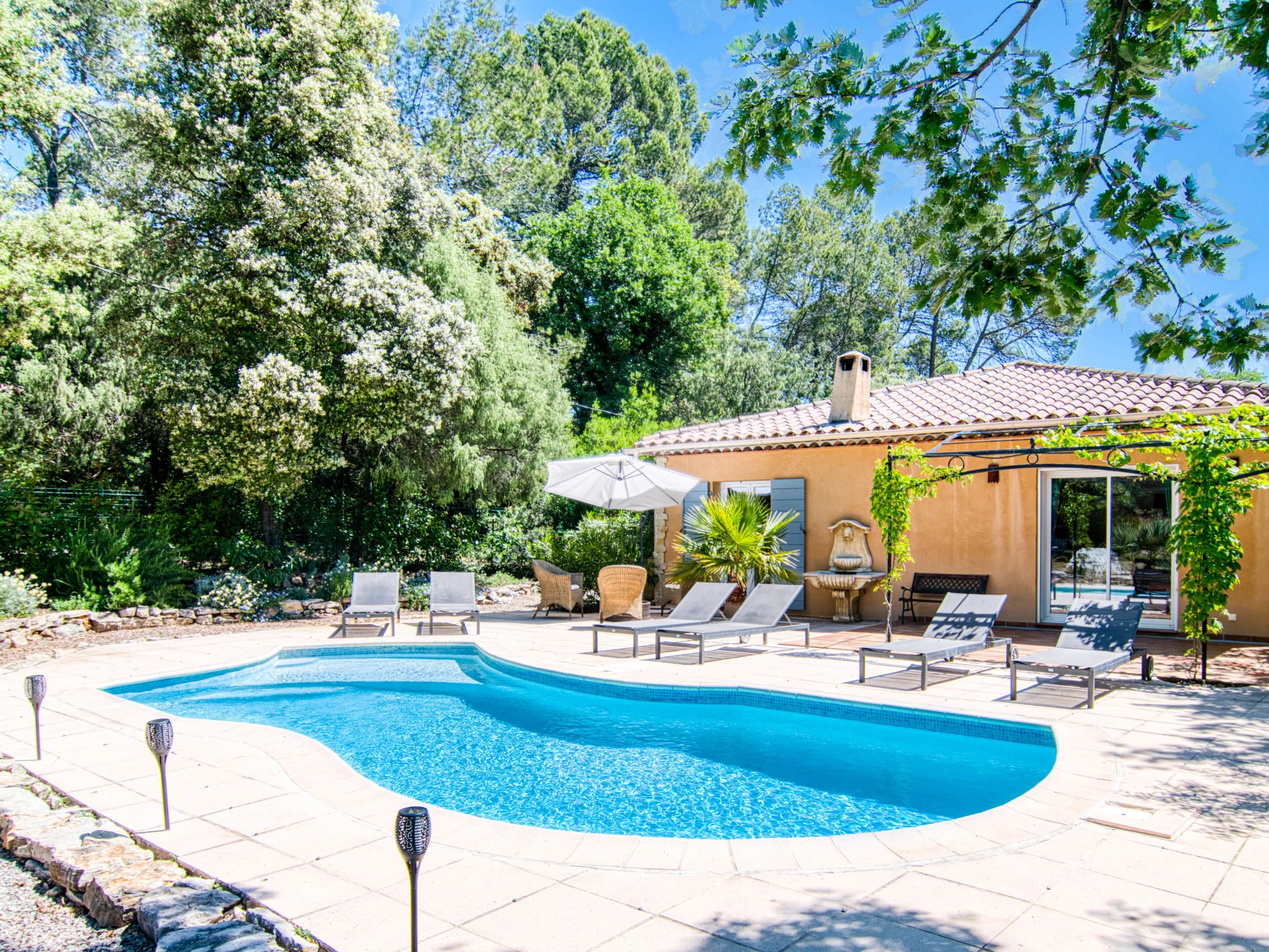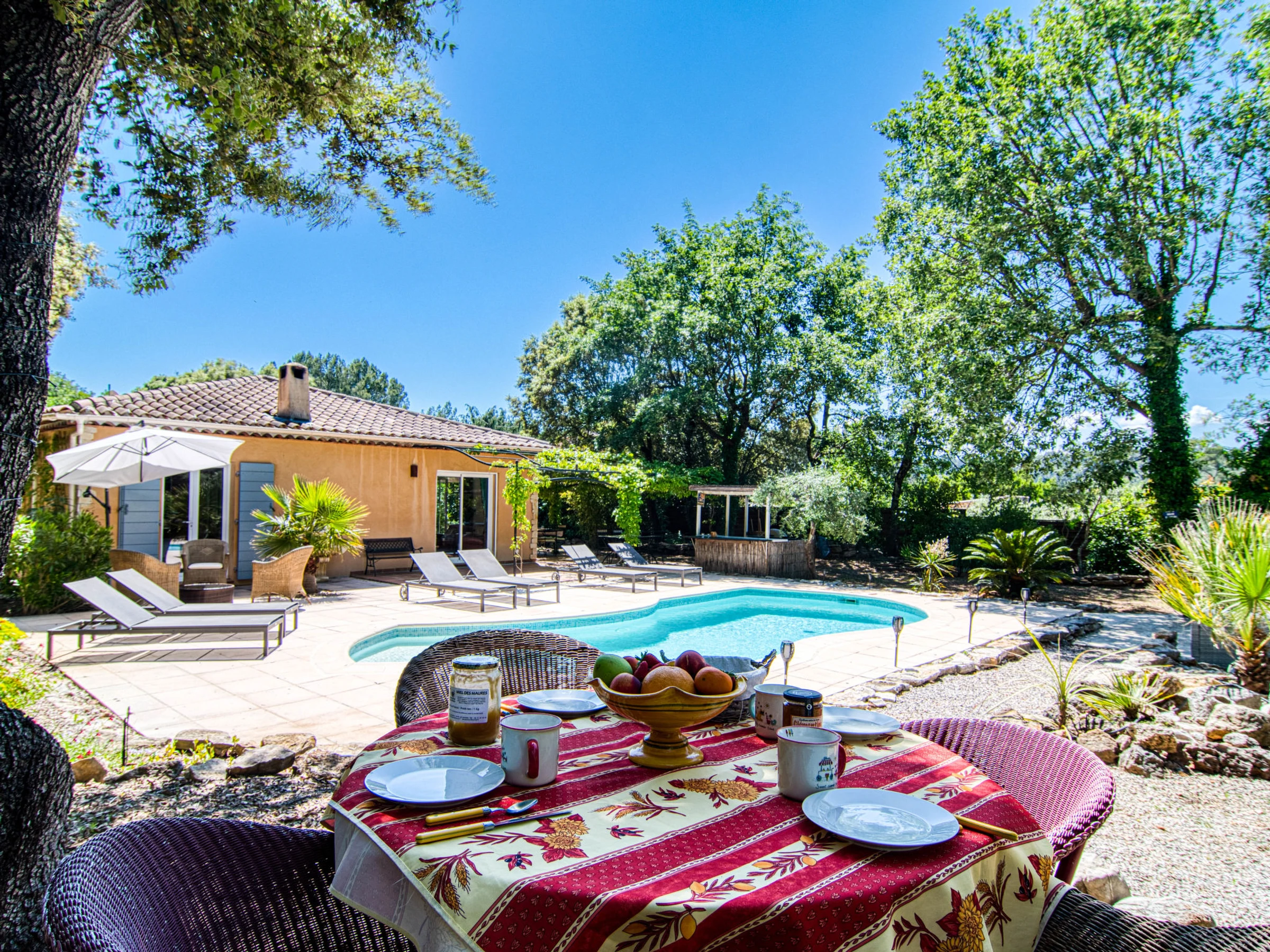 6 km from the centre of Le Thoronet, 14 km from the centre of Lorgues, 27 km from the centre of Draguignan, in the residential district. Private: property 2'500 m2 (fenced), beautiful garden to relax, swimming pool kidney shaped (10 x 4 m, seasonal availability: [hidden] - [hidden] with alarm system. Outdoor shower, boules, parking (for 4 cars) on the premises. Grocery 6 km, supermarket 10 km, restaurant 6 km, bar 6 km, bakery 6 km, café 6 km, bus stop 8 km, railway station "Les Arcs Draguignan" 15 km, sandy beach "La Nartelle". Golf course (18 hole) 26 km, riding stable 8 km, fishing possibilities 19 km. Nearby attractions: Abbaye du Thoronet, Chute du Caramy, Vallon Sourn, Sillans la cascade, Cotignac, Tourtour. Well-known lakes can easily be reached: Lac de Carcès (pêche uniquement) 19 km, Lac de Sainte croix 57 km. Hiking paths: Plaine des Maures, Gorges du Verdon. Please note: car recommended. The owner does not accept any youth groups.