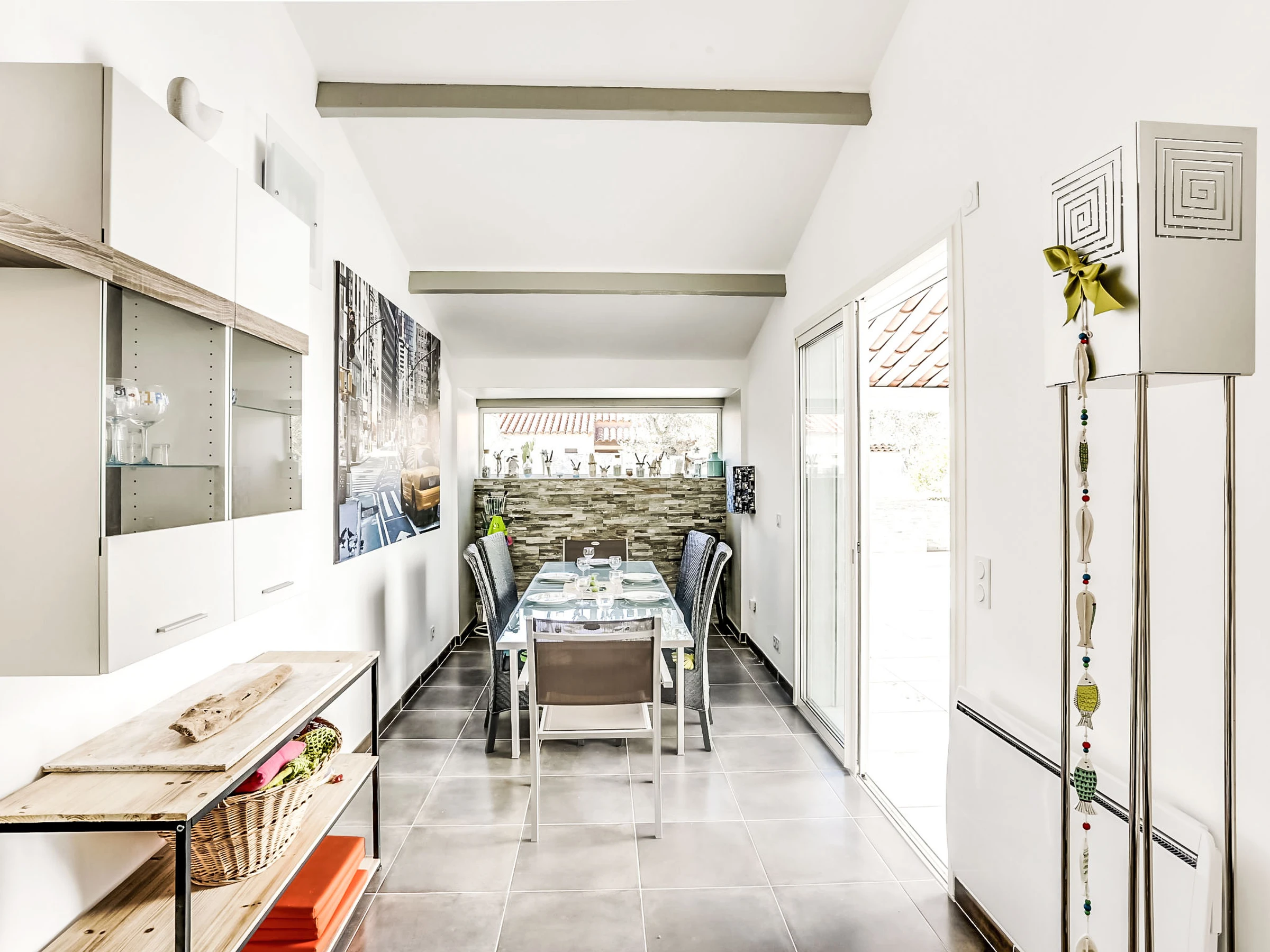 5-room house 100 m2, west facing position. Comfortable and modern furnishings: lounge with TV (flat screen). Exit to the terrace. Dining room with panoramic window. Exit to the terrace. 1 room with 1 french bed (1 x 140 cm, length 190 cm). Exit to the garden, to the terrace. 1 room with 1 french bed (1 x 140 cm, length 190 cm). 1 room with 1 french bed (1 x 160 cm, length 190 cm). Open kitchen (oven, dishwasher, 3 induction hot plates, toaster, kettle, microwave, freezer, electric coffee machine) with dining nook. Exit to the terrace. Shower, sep. WC. Heating. Large terrace 100 m2, terrace 25 m2, roofed. Terrace furniture, deck chairs (6). View of the garden. Facilities: washing machine, iron, hair dryer. Internet (WiFi, free). Please note: smoke alarm. [hidden]